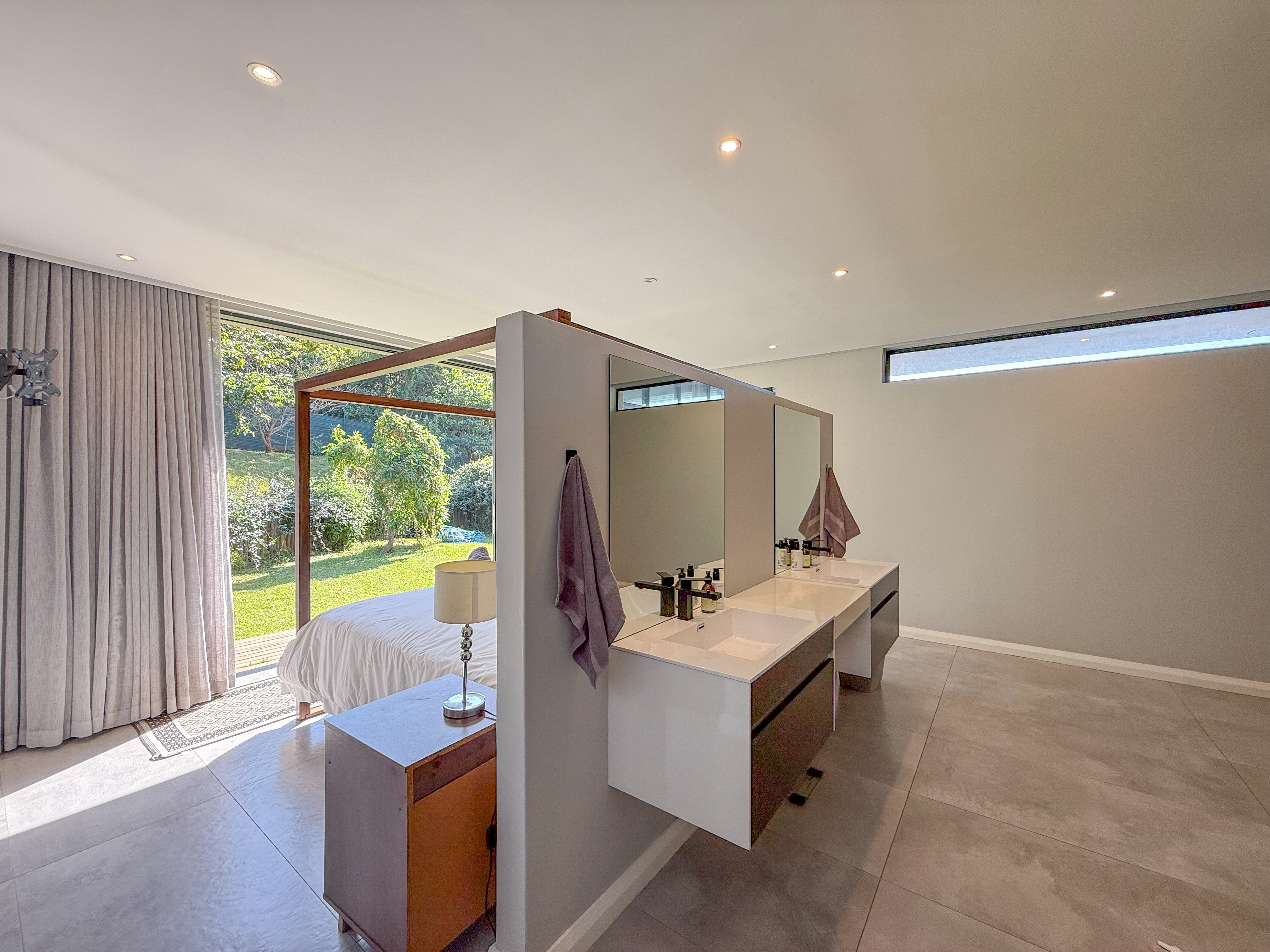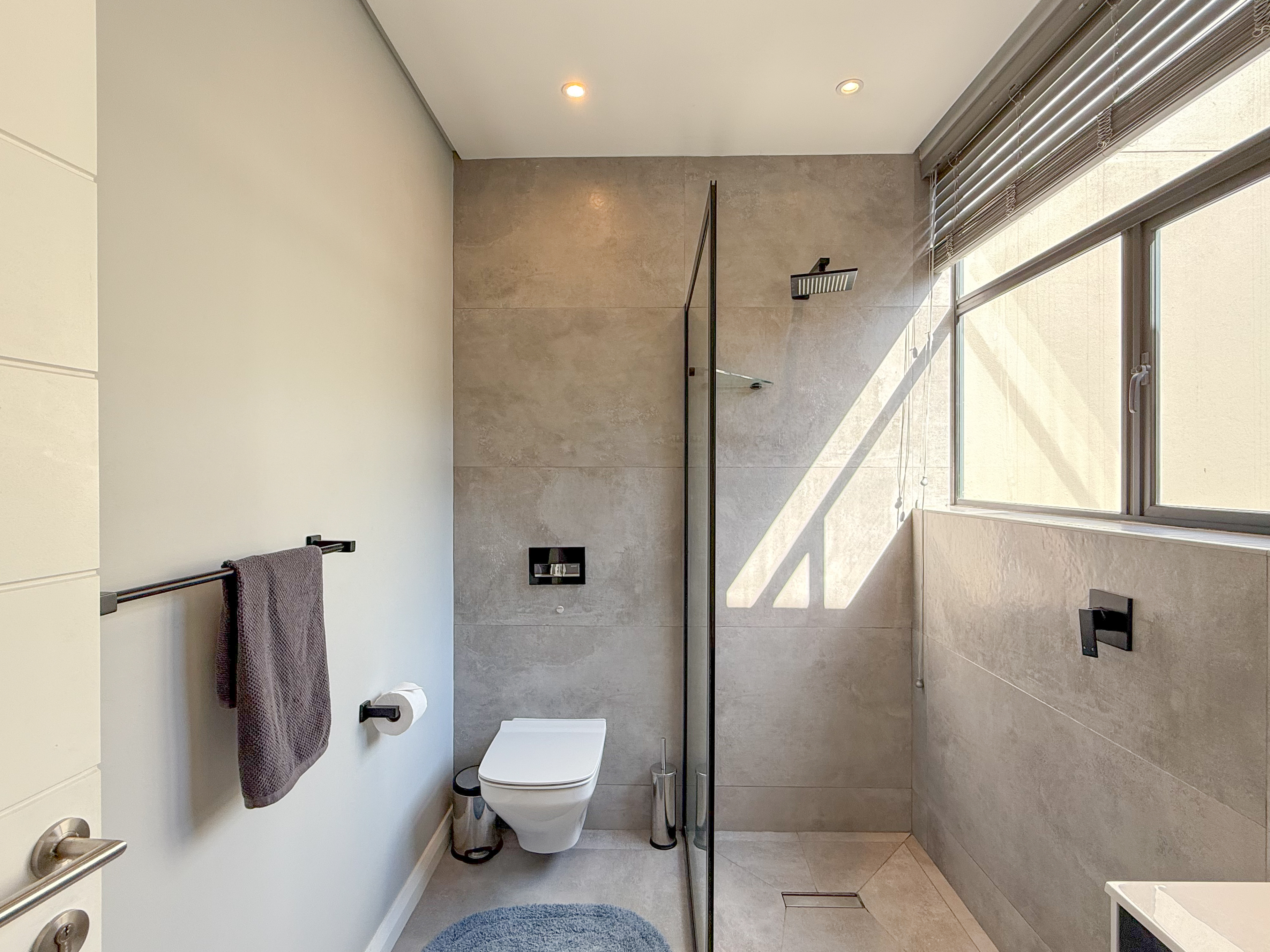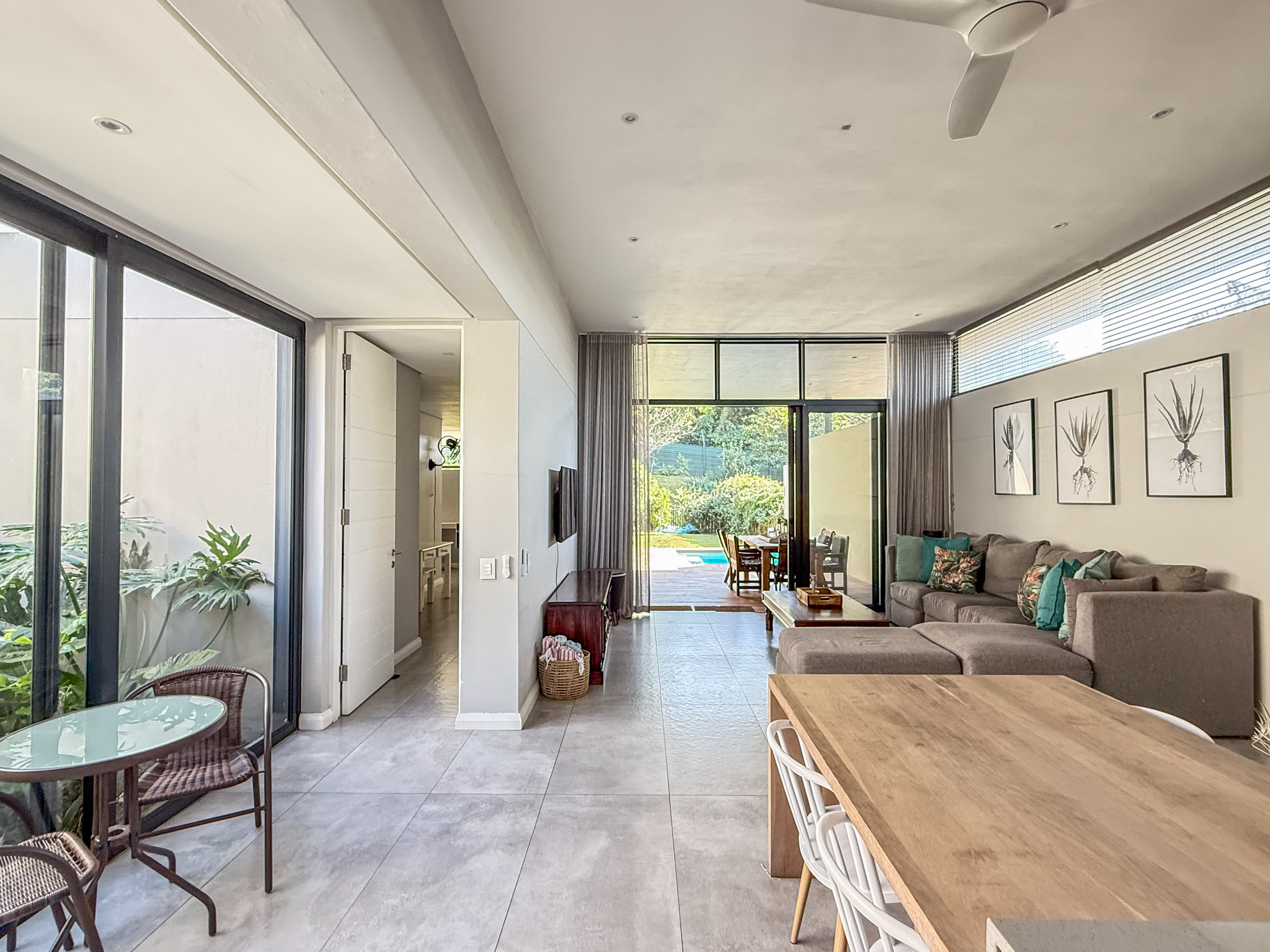 The spa-like master suite overlooks lush tropical gardens and features a beautifully appointed ensuite bathroom with a bath, large walk-in shower, double vanity, concealed toilet, and a dressing area with ample cupboards. The second bedroom is well-proportioned with its ensuite bathroom (shower and toilet), plus there is a separate guest toilet for added convenience.