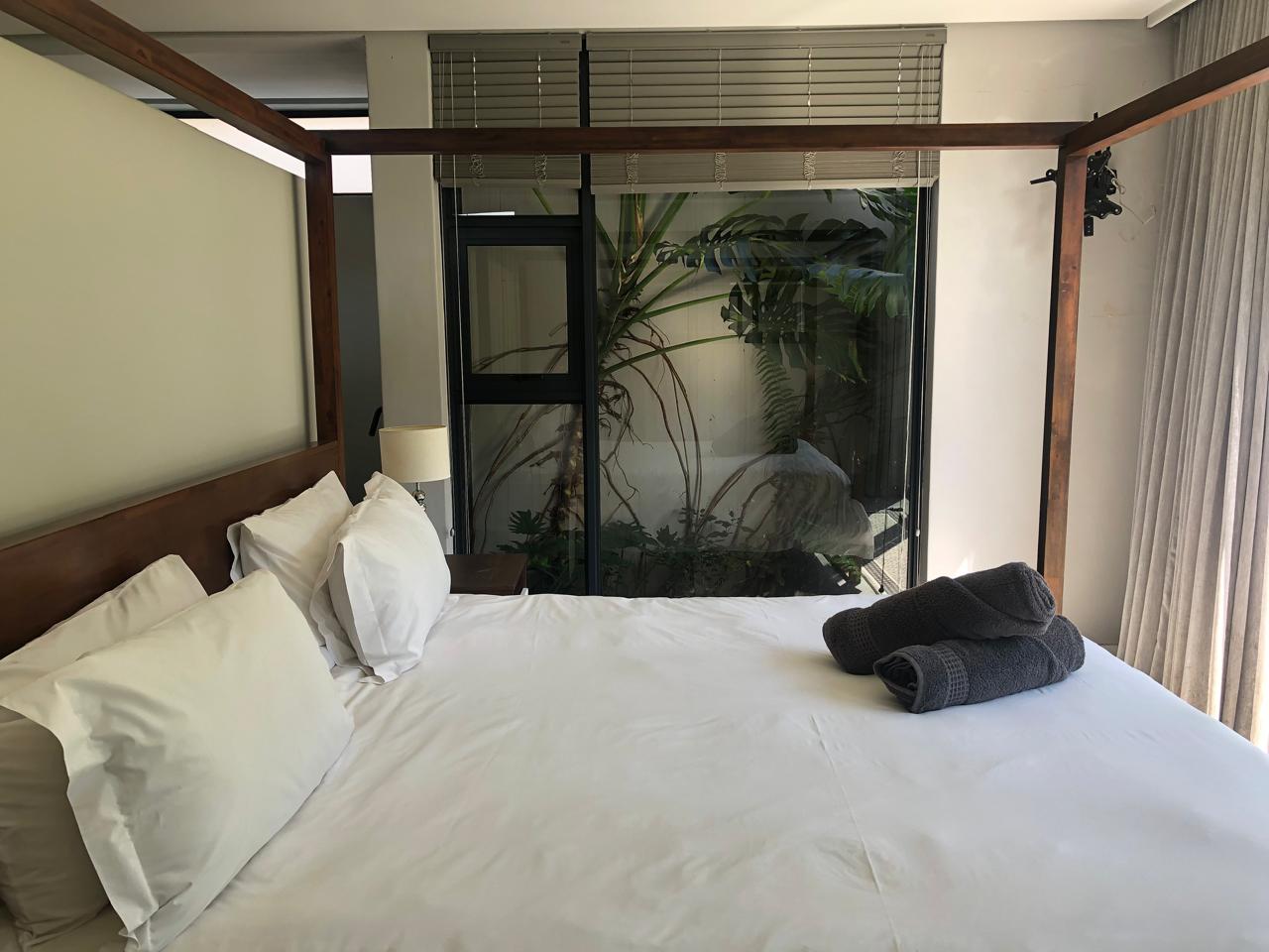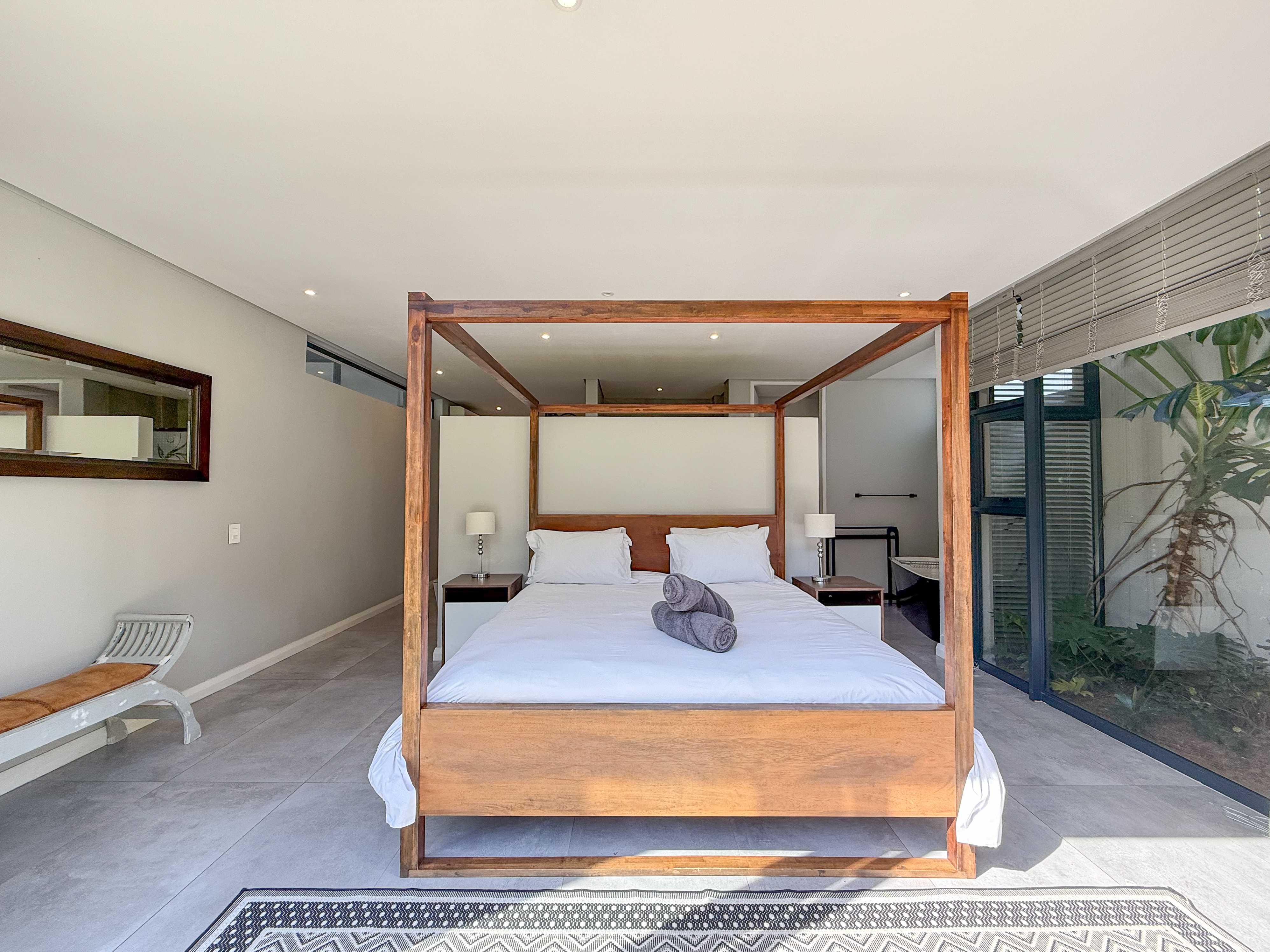 A unique enclosed garden alcove brings greenery and natural light into the kitchen and dining areas, enhancing the apartment’s calming coastal ambiance.