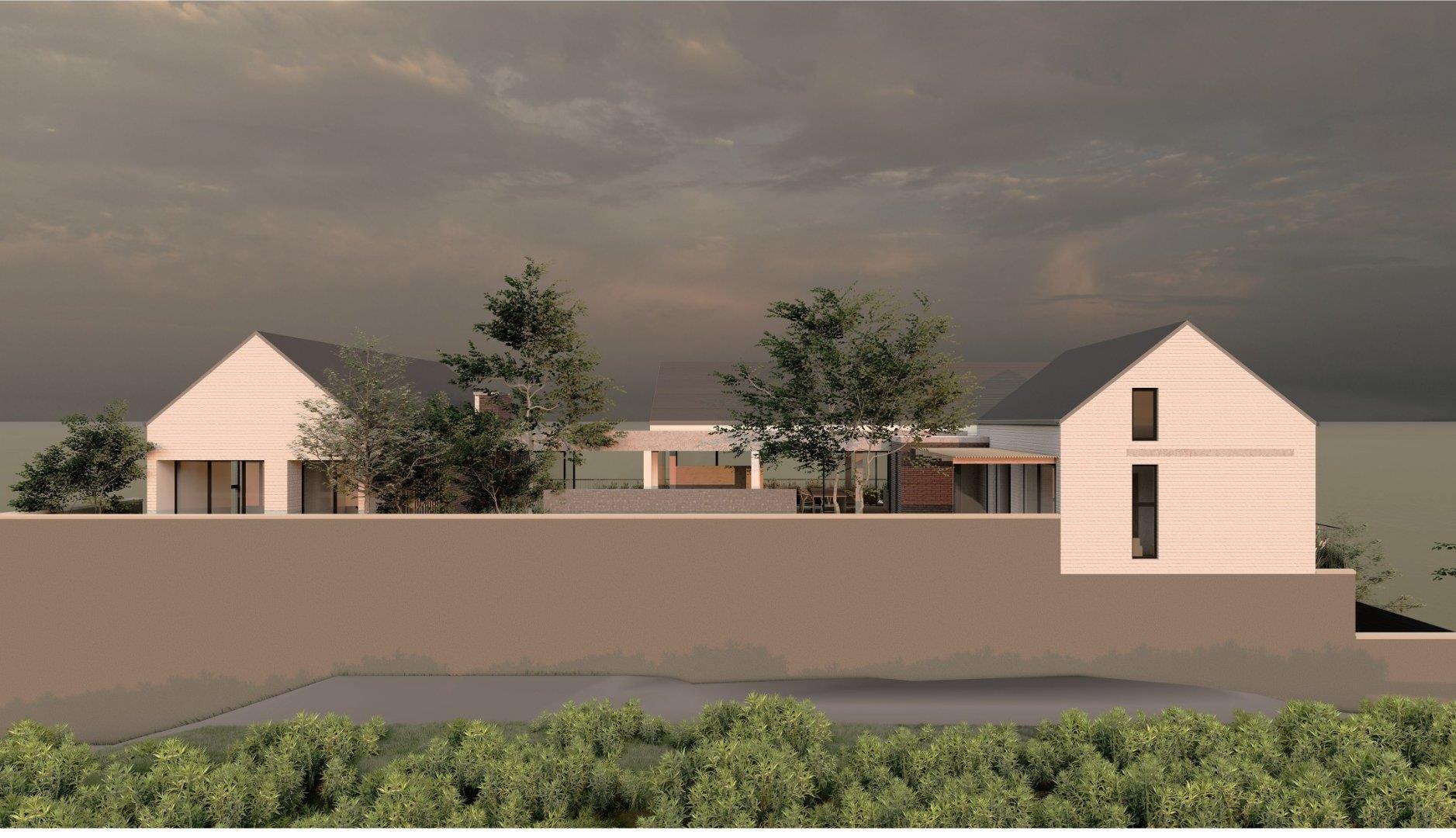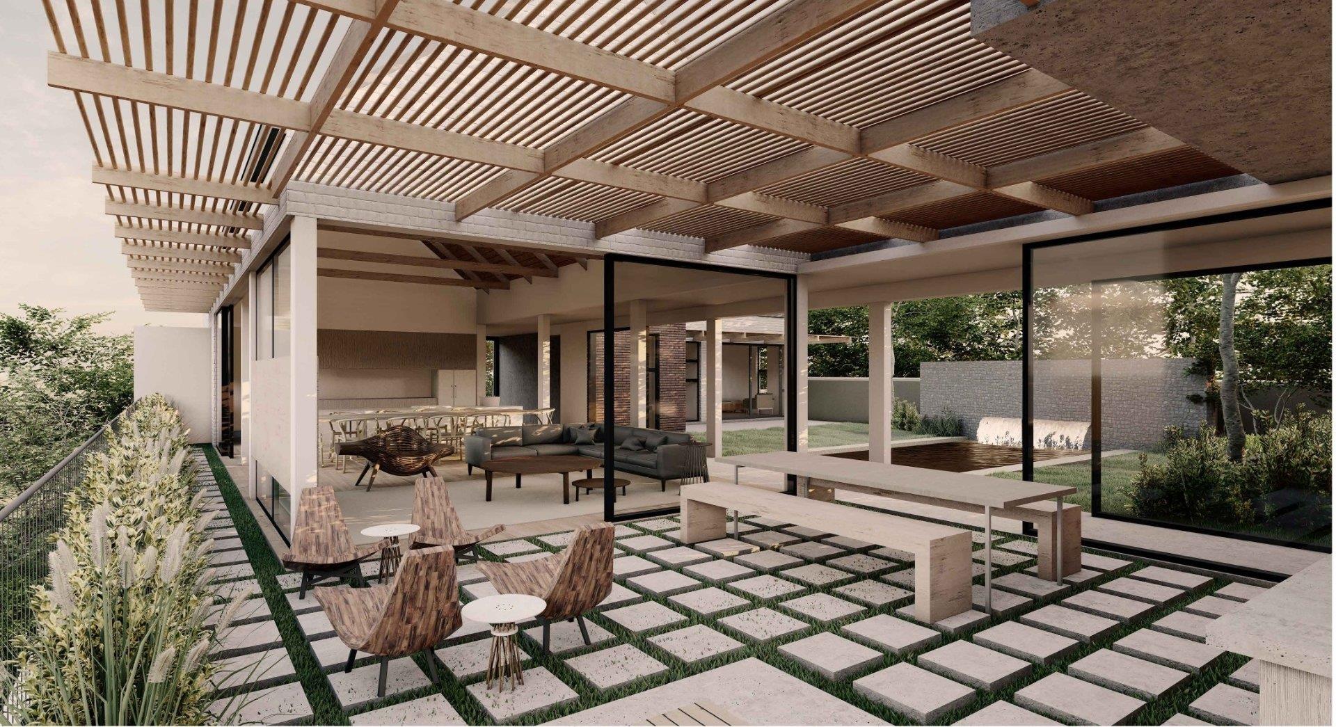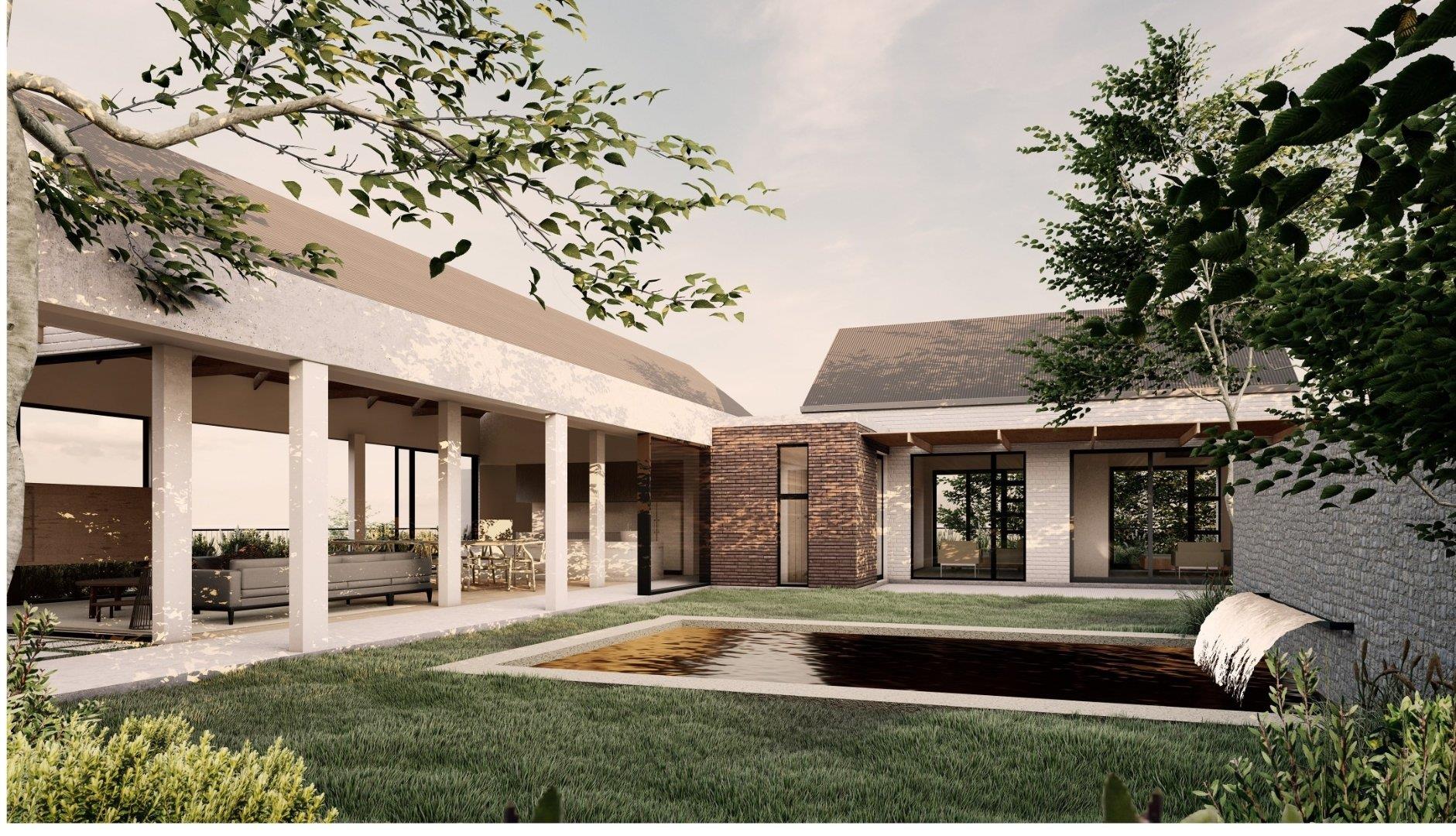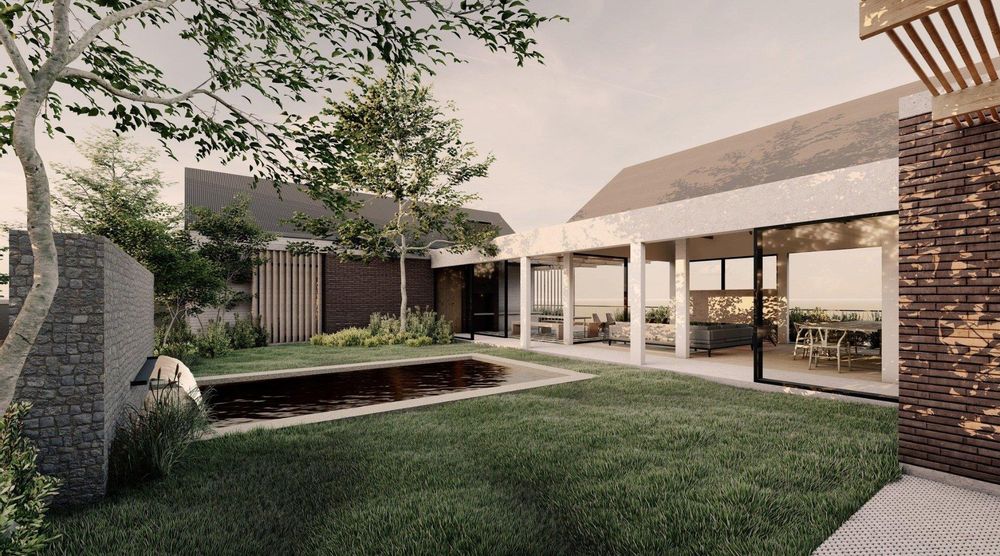 The approved 588 m2 residence blends scale and proportion: four en-suite bedrooms, open-plan living spaces, a double-volume foyer, and a terrace flowing to the pool and garden. The stone-clad feature wall and recessed entrance were individually approved to enhance privacy and define the façade.