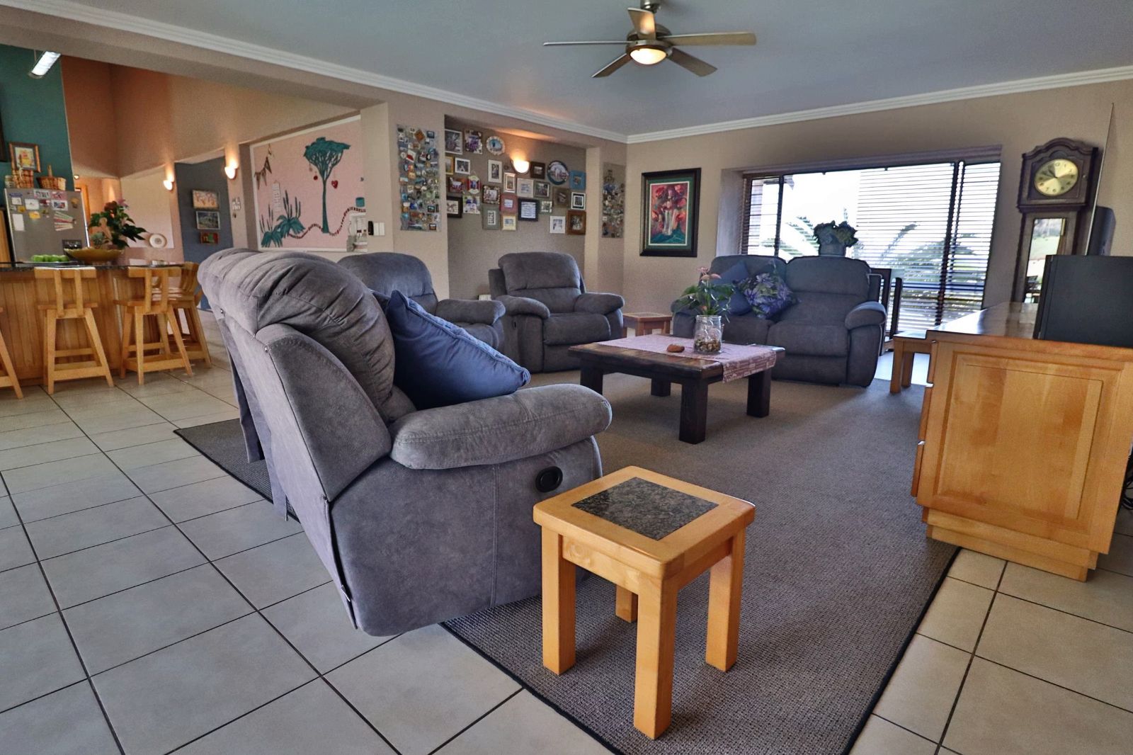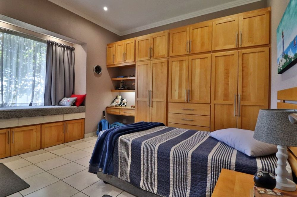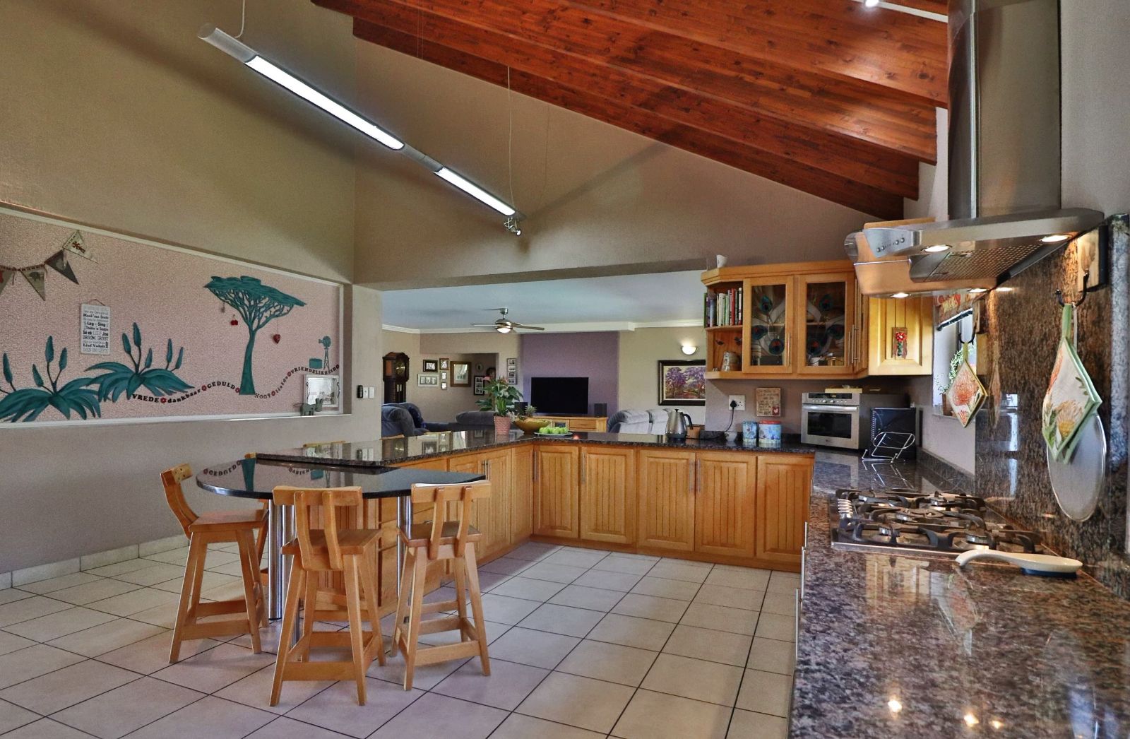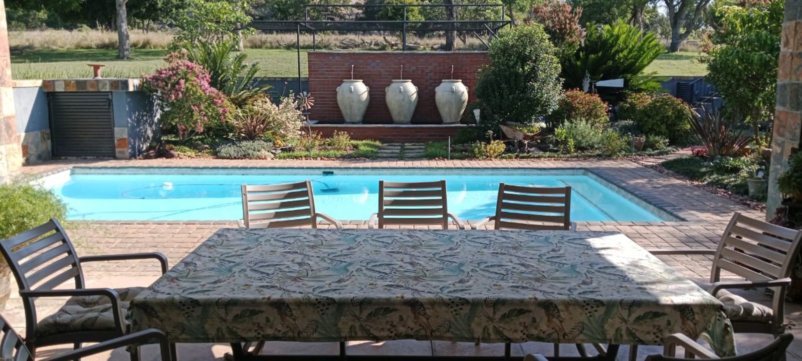 An enclosed braai area with stack-able doors opens onto the beautiful garden, creating a seamless flow for indoor-outdoor entertaining. The open-plan lounge extends onto a patio overlooking the sparkling pool and lush landscaped garden.