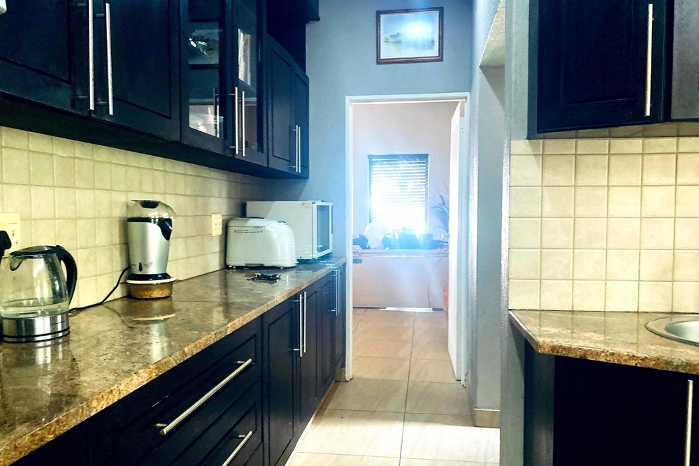 On this level you will find a guest bedroom with en-suite bathroom with shower, formal lounge, breakfast nook or dining room, kitchen with glass hob and oven, scullery with double sink and trog, ample wood cupboards and space for dishwasher.