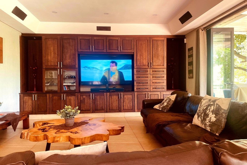 TV room with aircon, build in cupboards and stackable glass doors leading to a large covered patio and bar area.