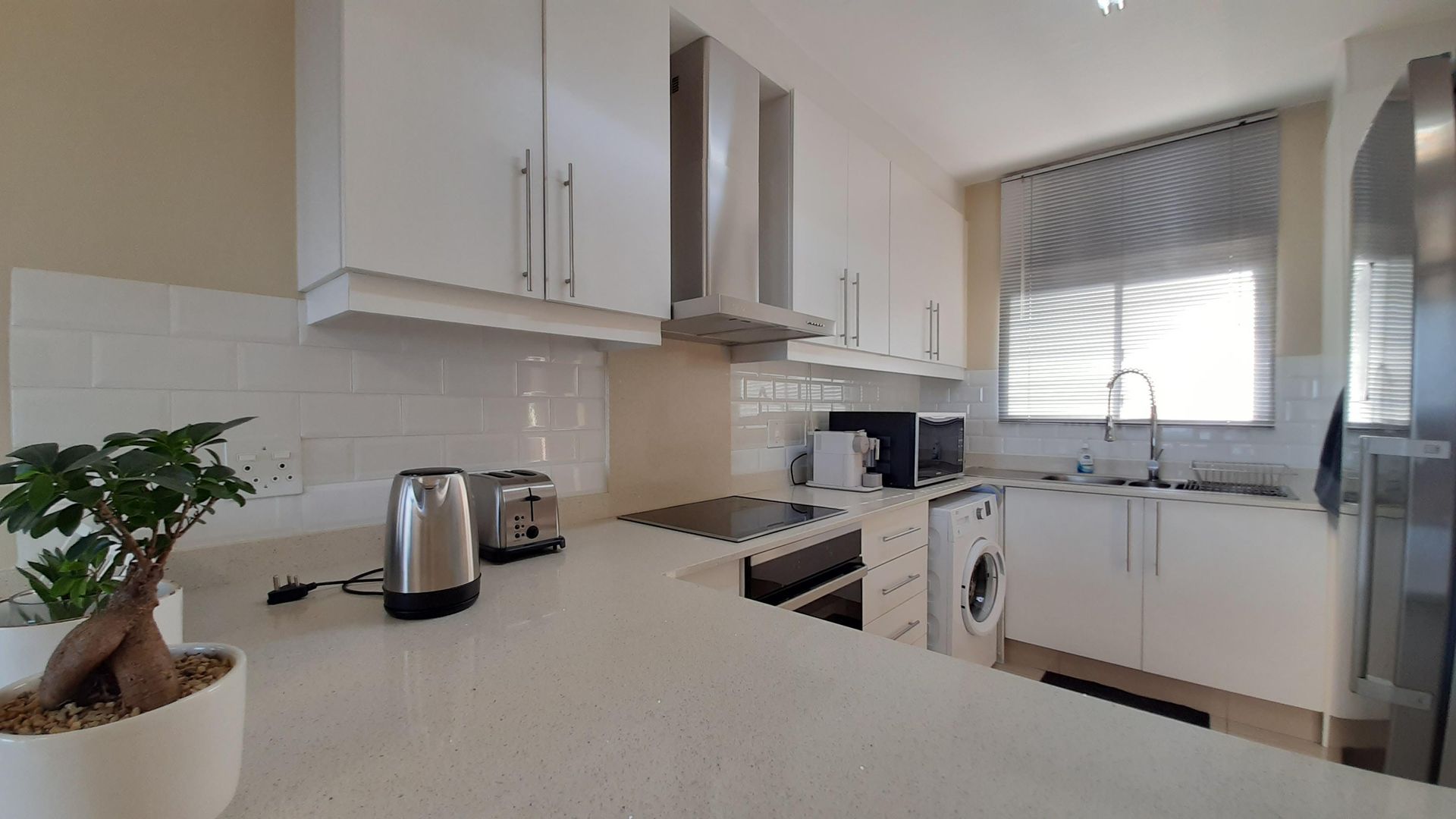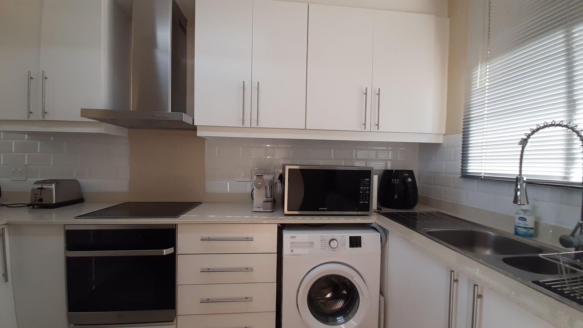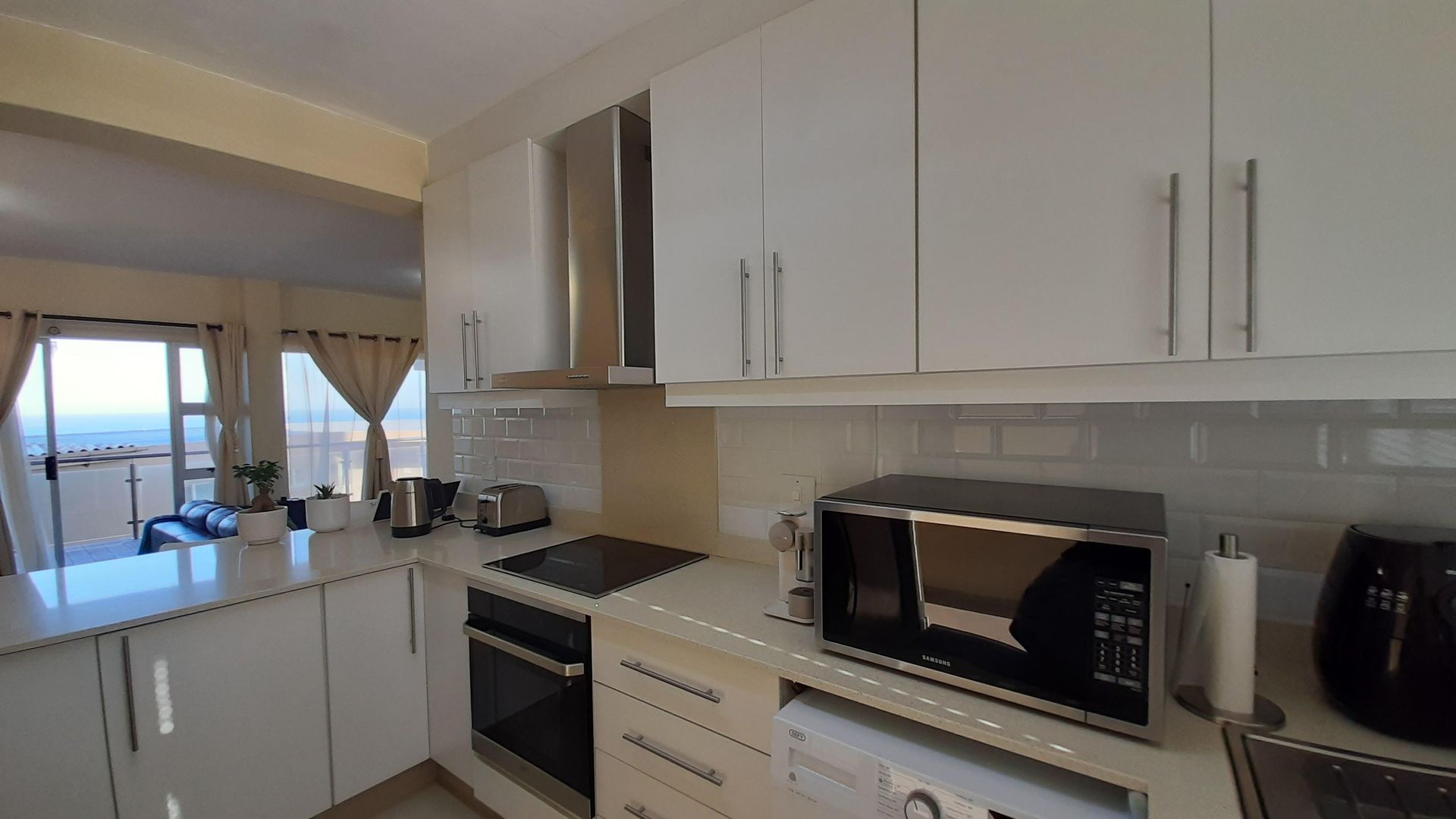 The open-plan living area is designed to maximize the spectacular sea views and promote easy and relaxed seaside living. The elegant kitchen is spacious and fitted with Caesarstone countertops, Defy electric oven and hob, and ample cabinetry.