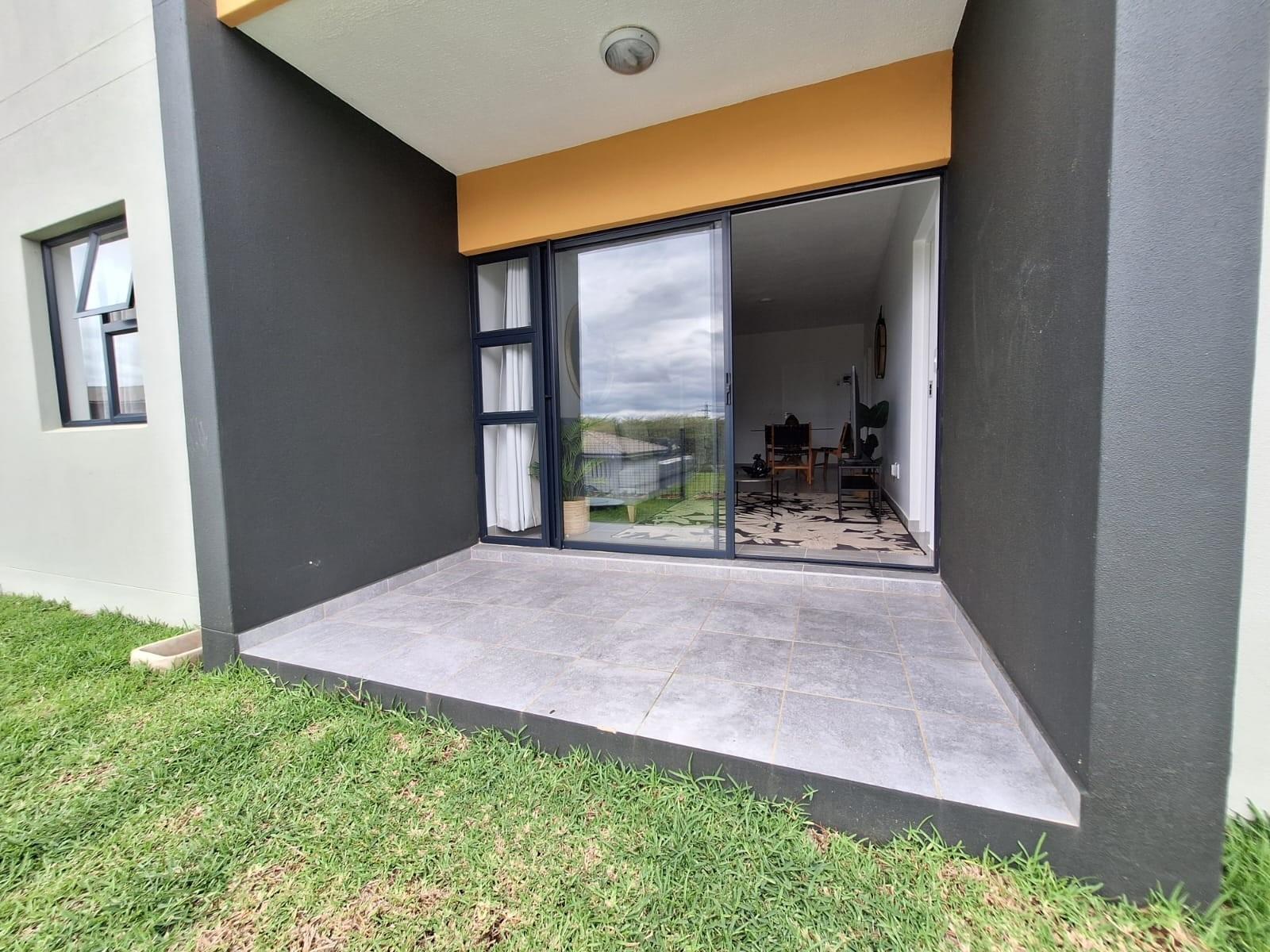 The open-plan living area leads out to a covered patio and private garden, creating a pleasant outdoor space for relaxing or entertaining.