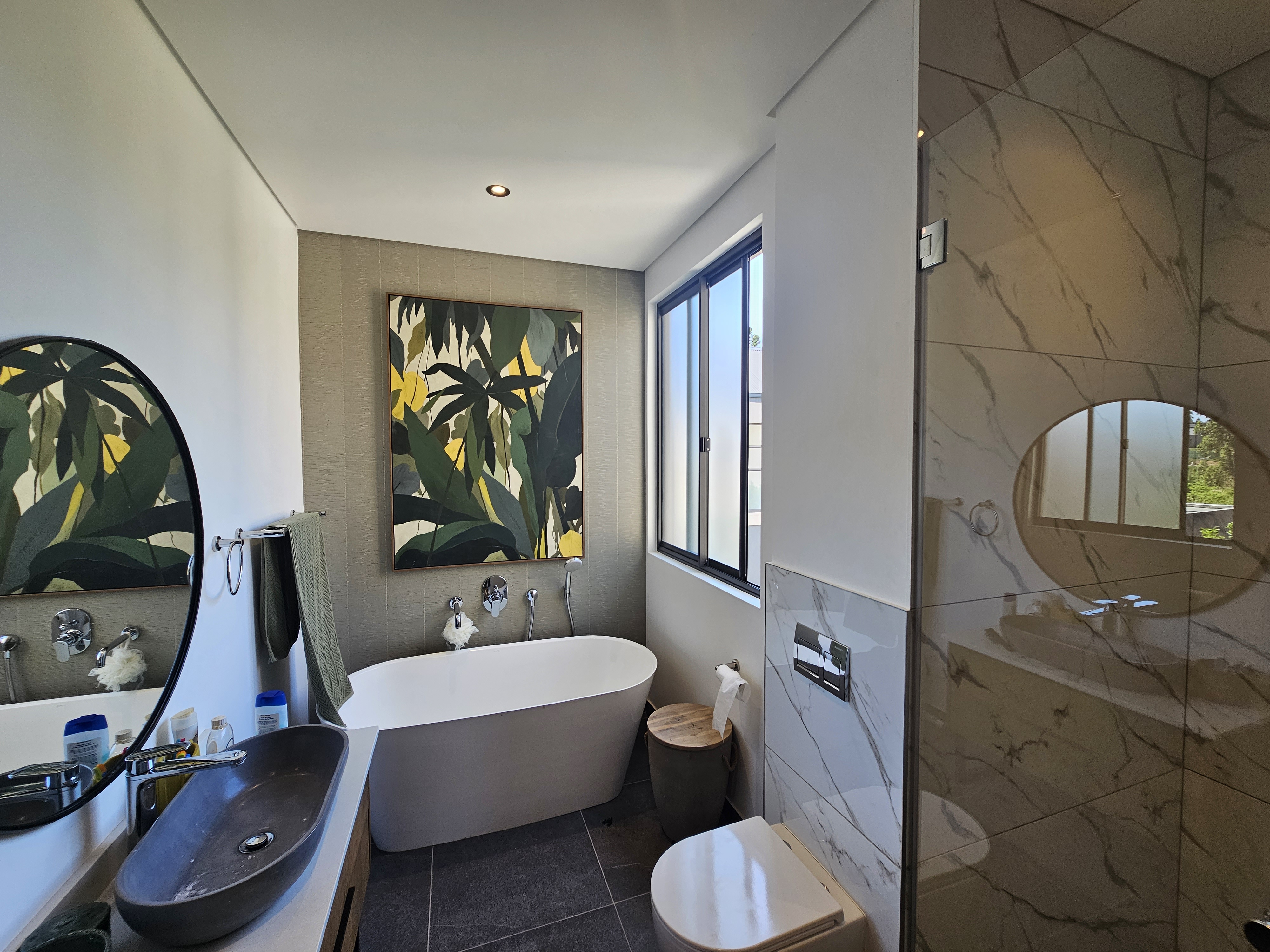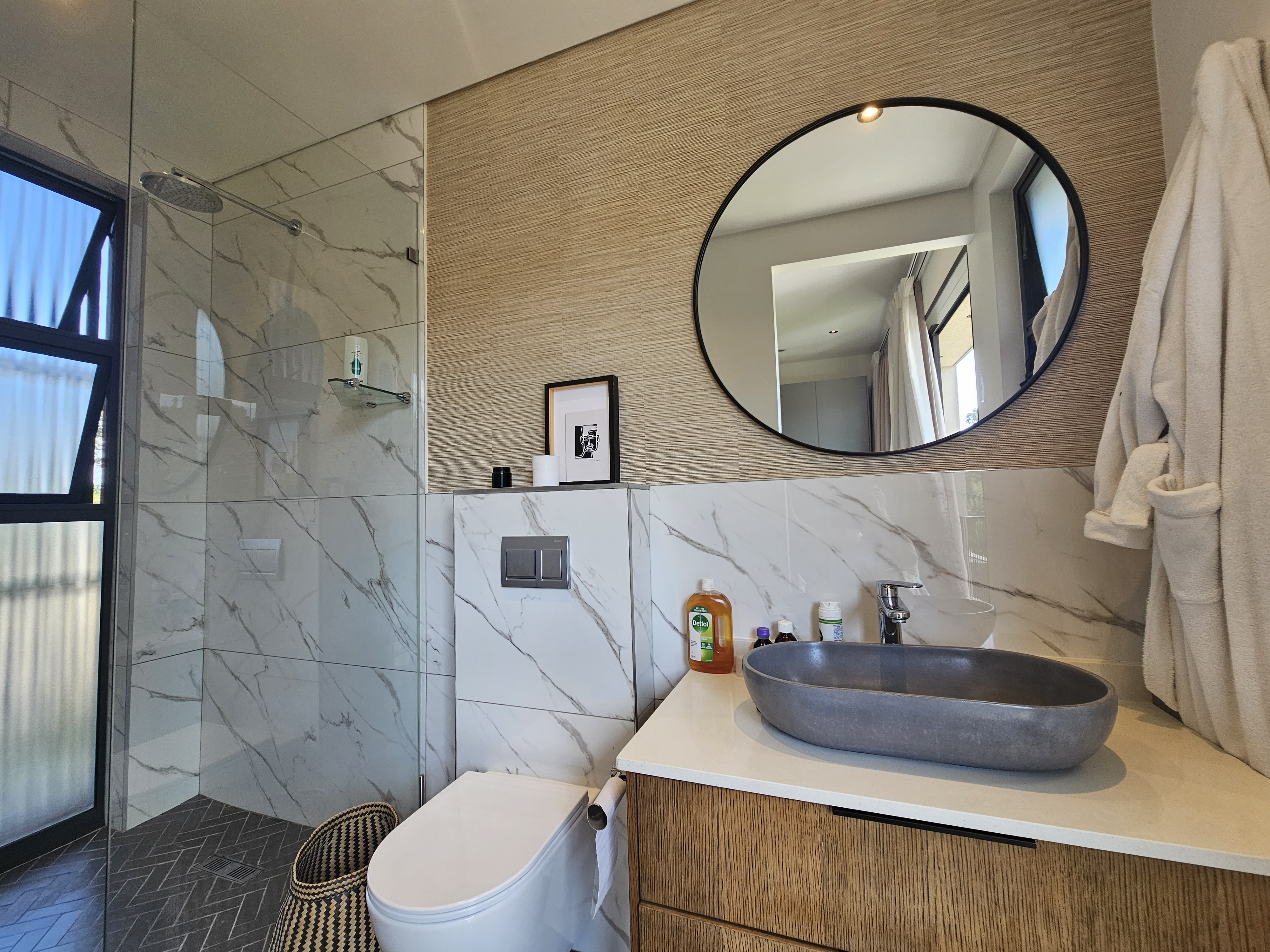 On the ground floor, you are greeted by wide open spaces, a stylish kitchen, inviting lounge, elegant dining area, practical scullery, and convenient guest bathroom. Step outside to a covered patio and lush garden, providing the perfect setting for entertaining family and friends.