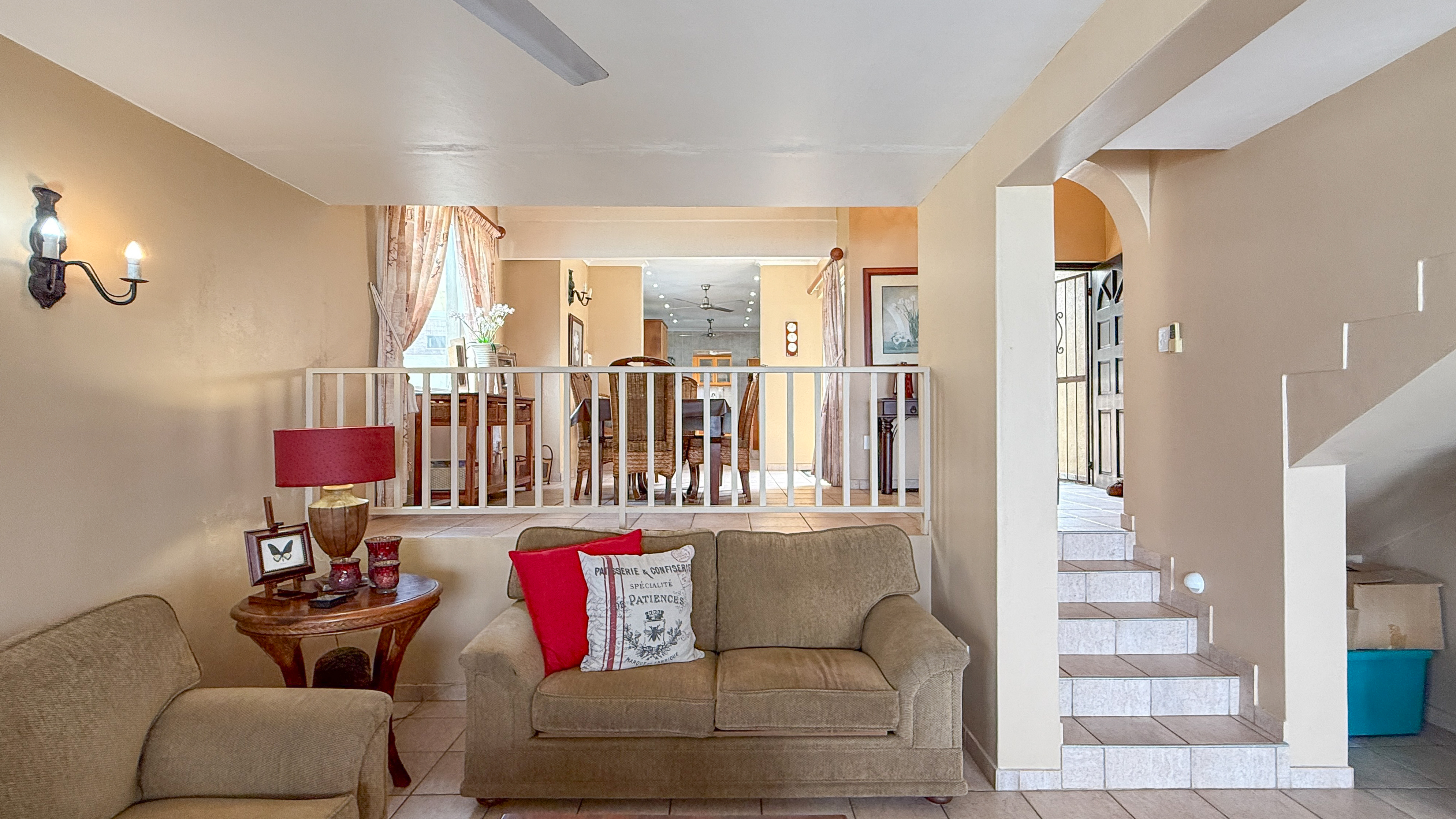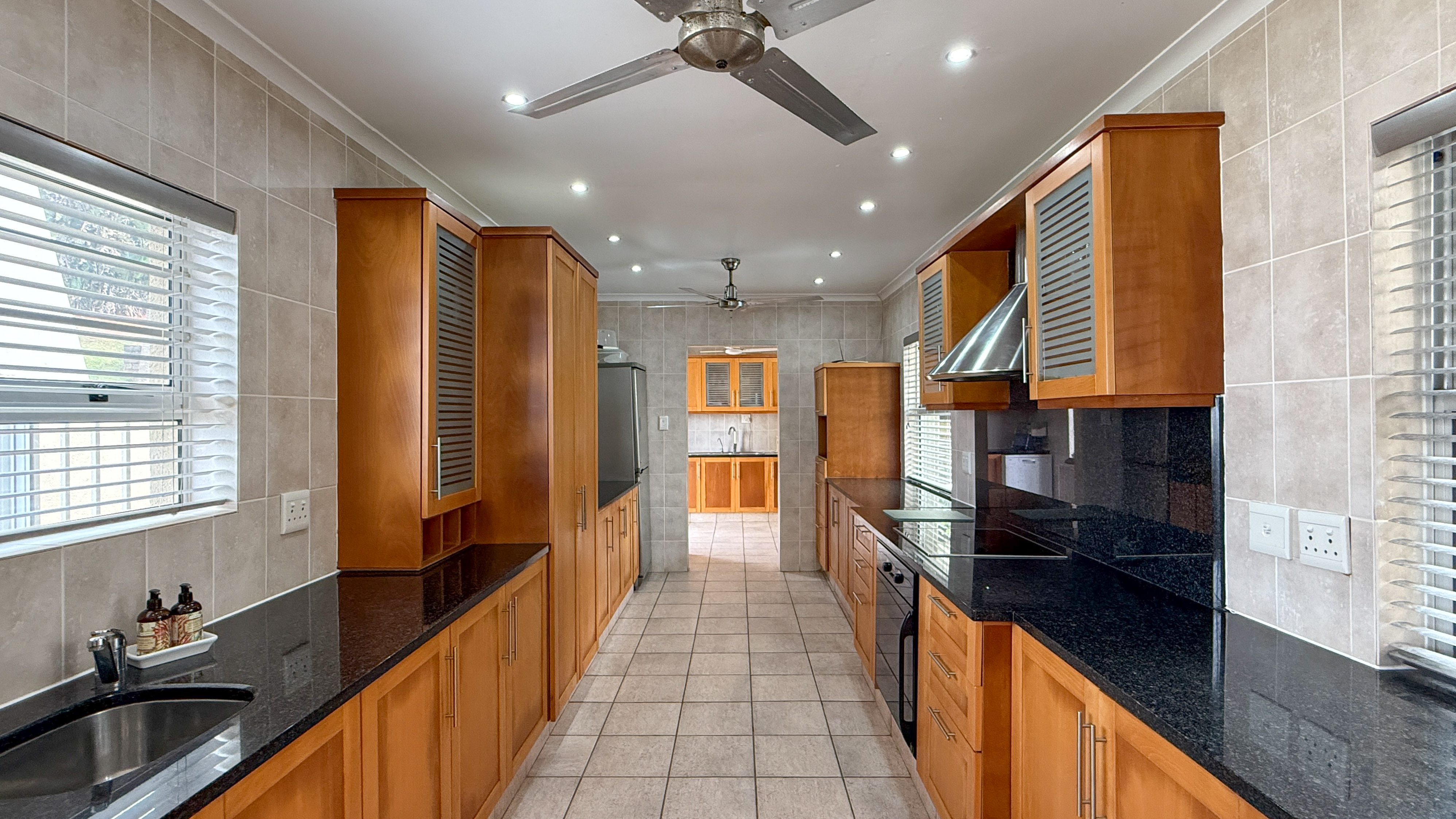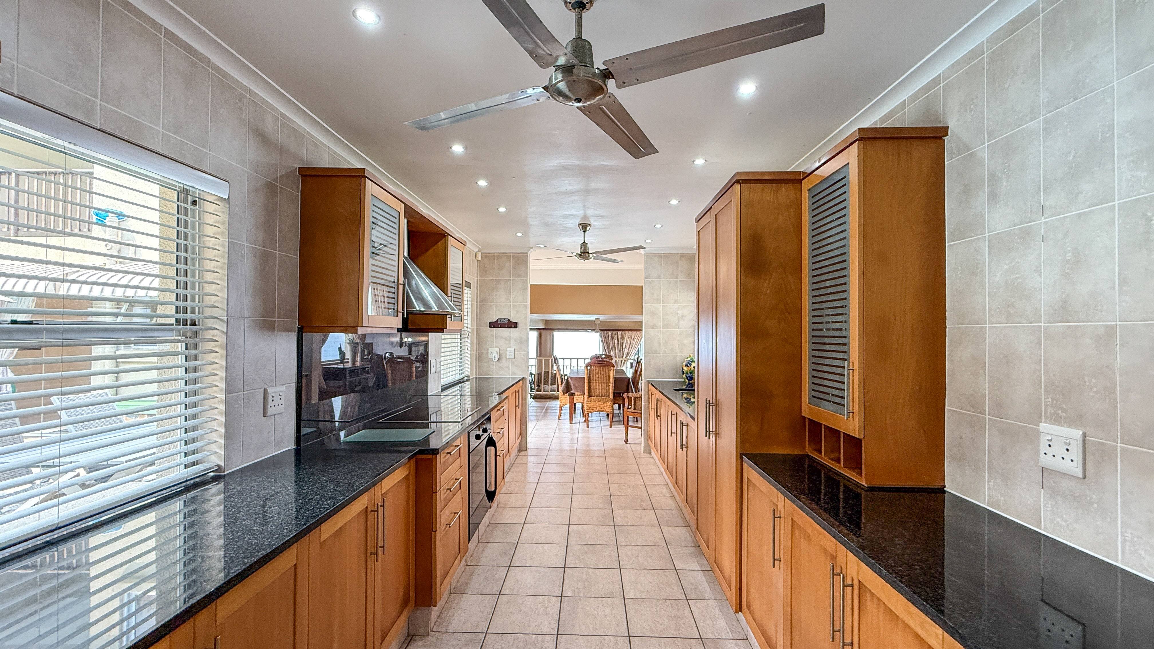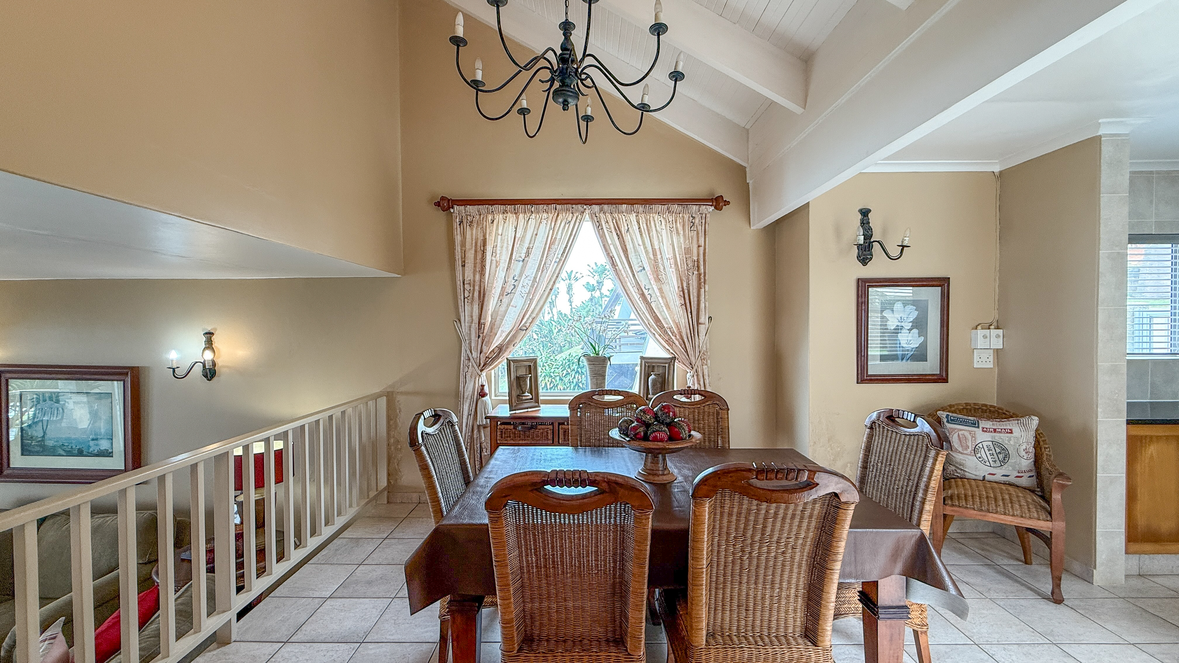 The home’s entertainment area is designed for gatherings with family and friends. A sheltered braai and pool area ensures year-round enjoyment, cleverly secured against the coastal winds. The open-plan lounge and dining area flow seamlessly into a well-appointed, spacious kitchen, creating the perfect hub for both relaxed family meals and effortless entertaining.