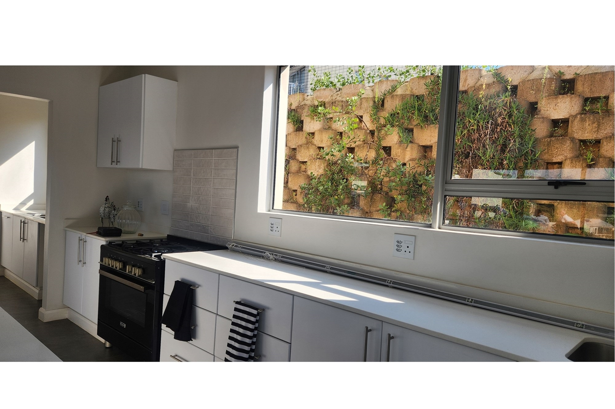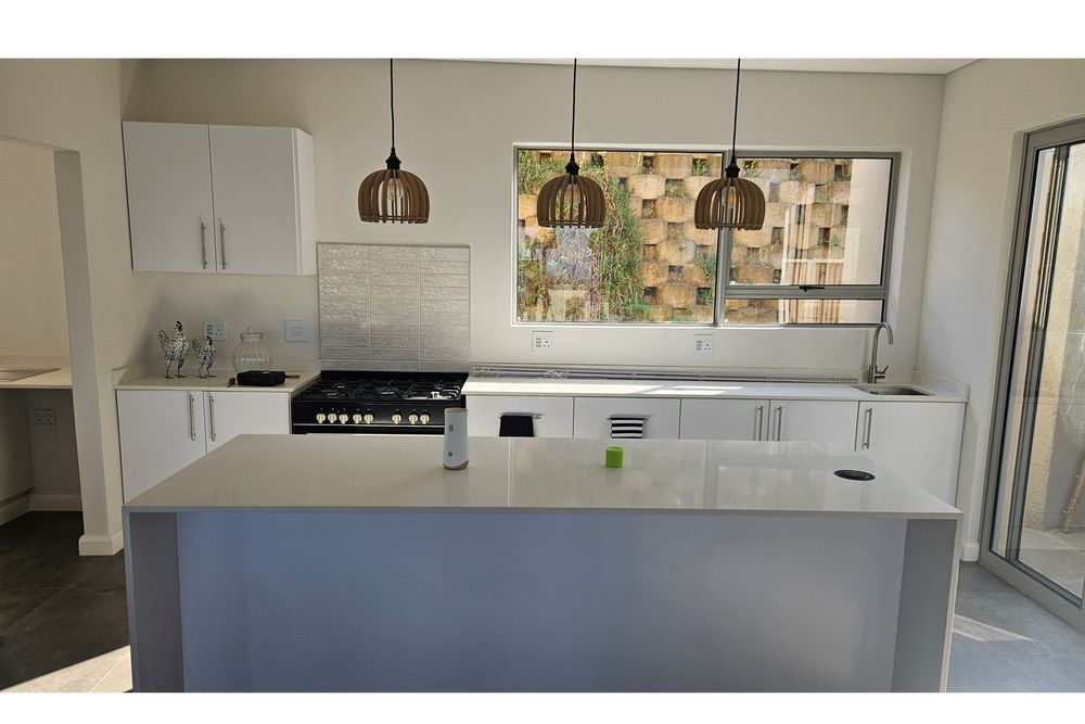 This modern home features a stylish open-plan kitchen fitted with Caesarstone countertops, a 5-burner gas hob, electric oven, and a breakfast island offering a casual dining space. A separate scullery includes plumbing for both a dishwasher and washing machine, keeping the main kitchen area tidy and functional.