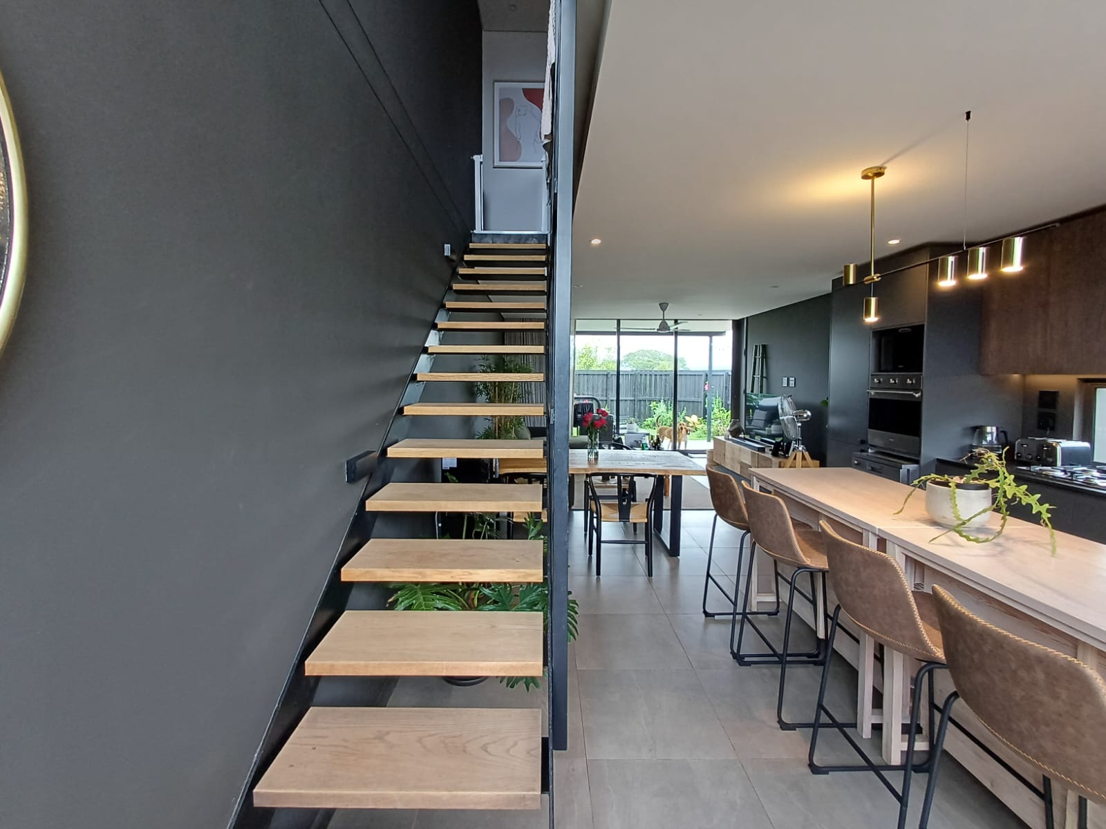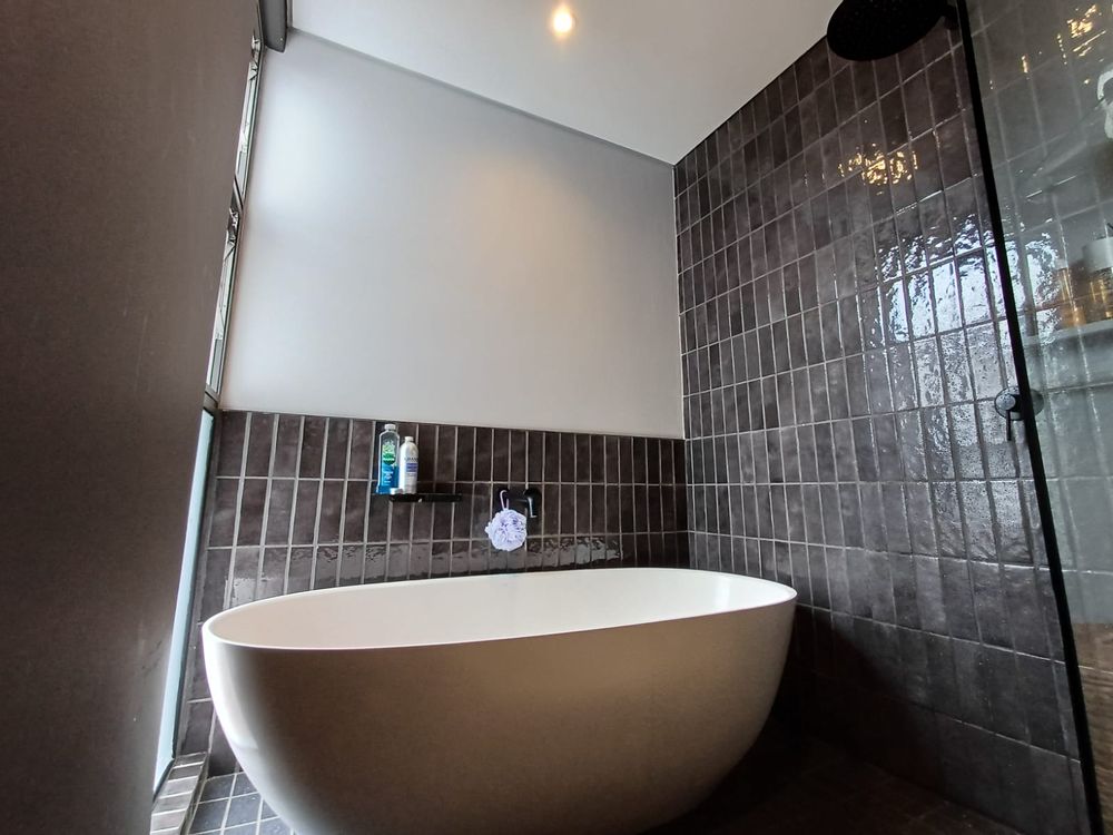 Designer finishes include feature tiles, floating cabinetry and sleek matt black fittings. The ensuite enjoys a luxurious freestanding bathtub, creating a tranquil spa-like experience.