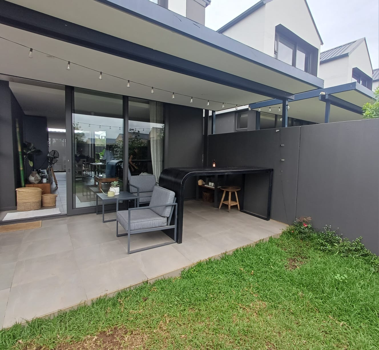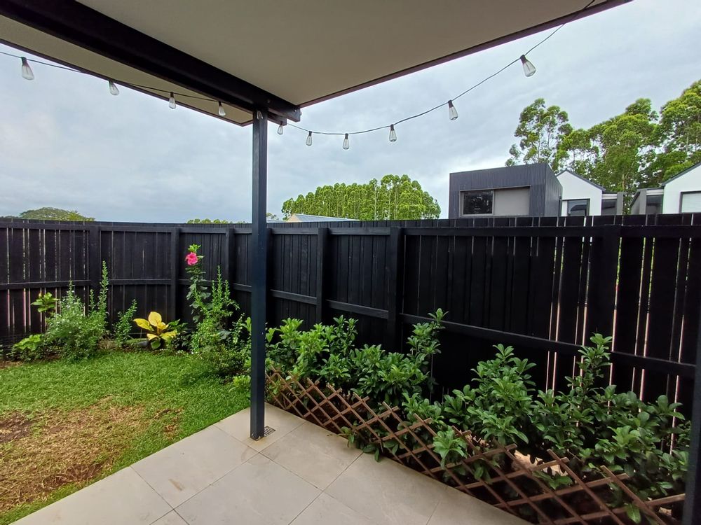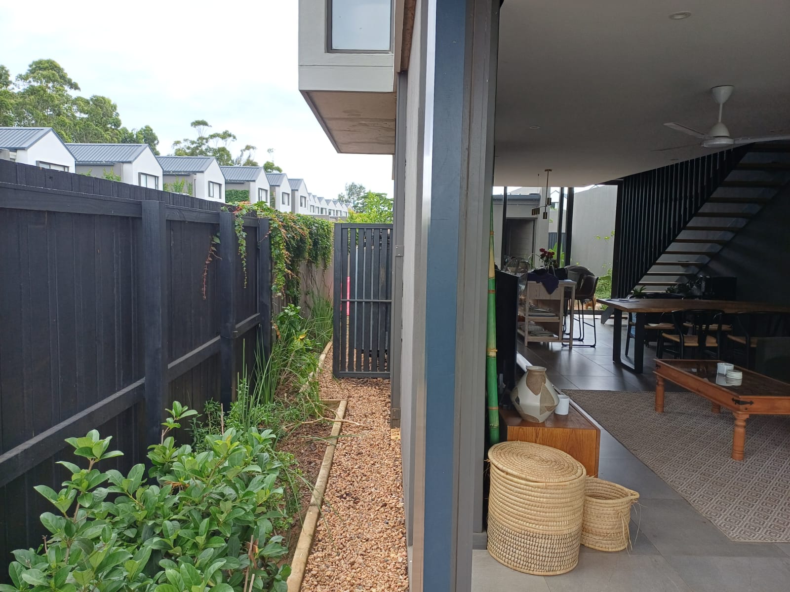 Modern and low maintenance with stylish black perimeter fencing and greenery.