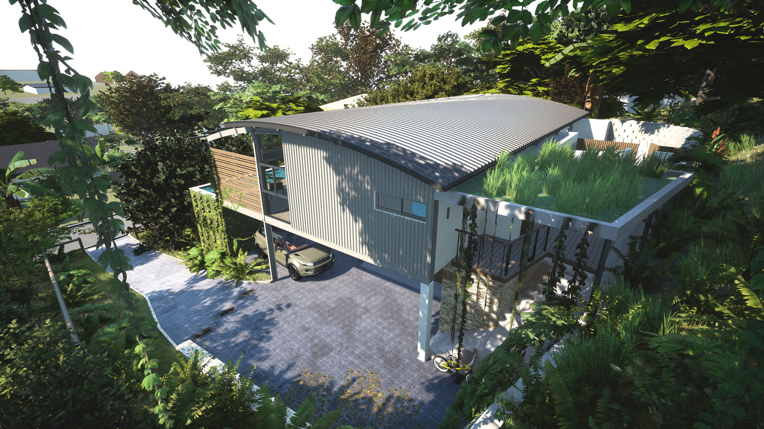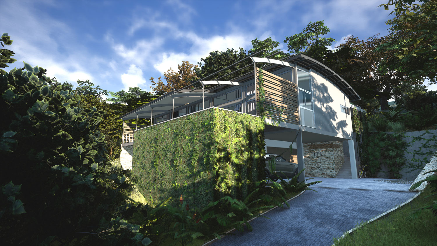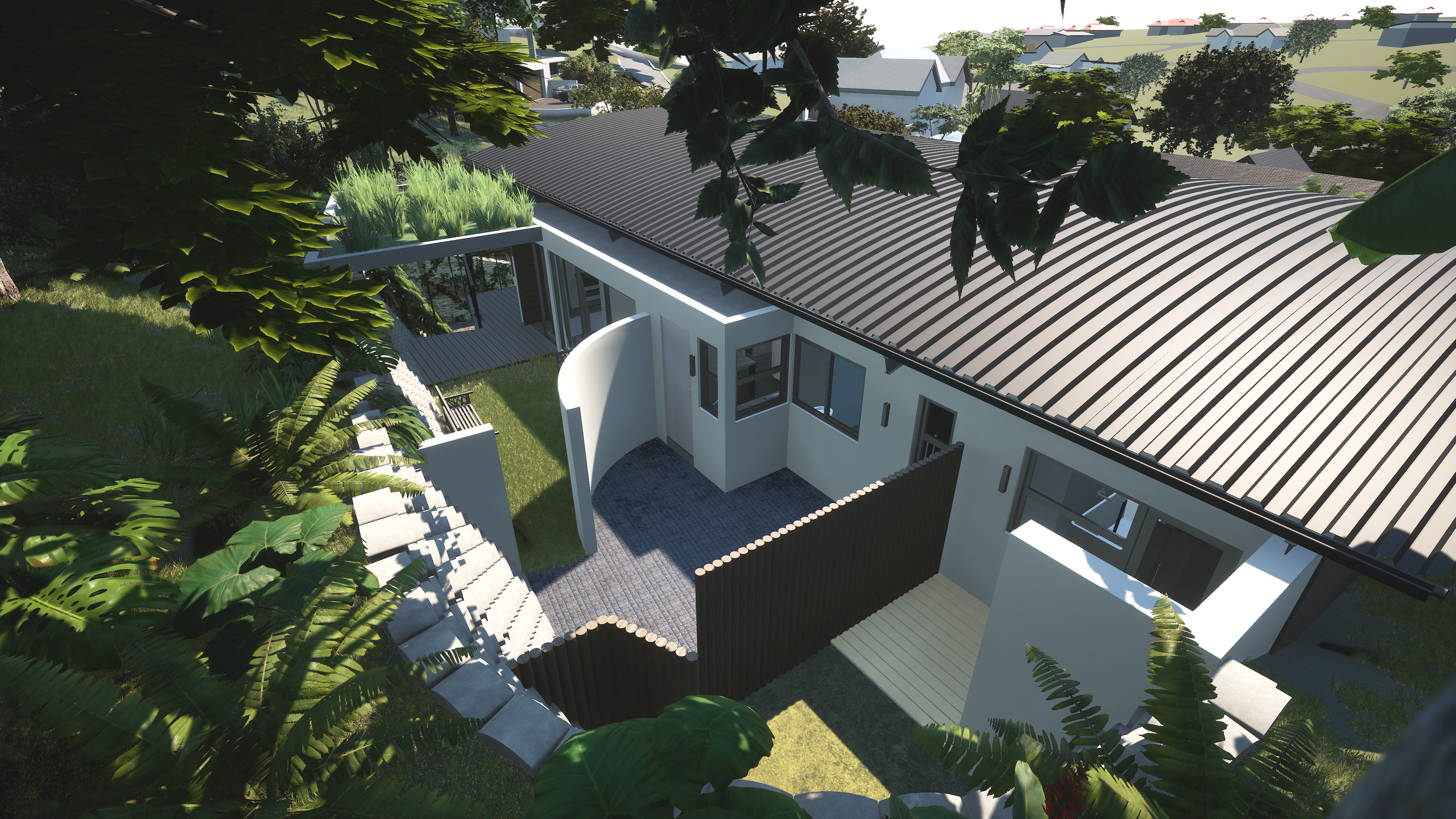 The design includes a lower-level double garage and a self-contained suite with bedroom, en-suite, living area, study, kitchenette and its own covered veranda — ideal for guests or extended family. A domestic bathroom is tucked behind the garage.