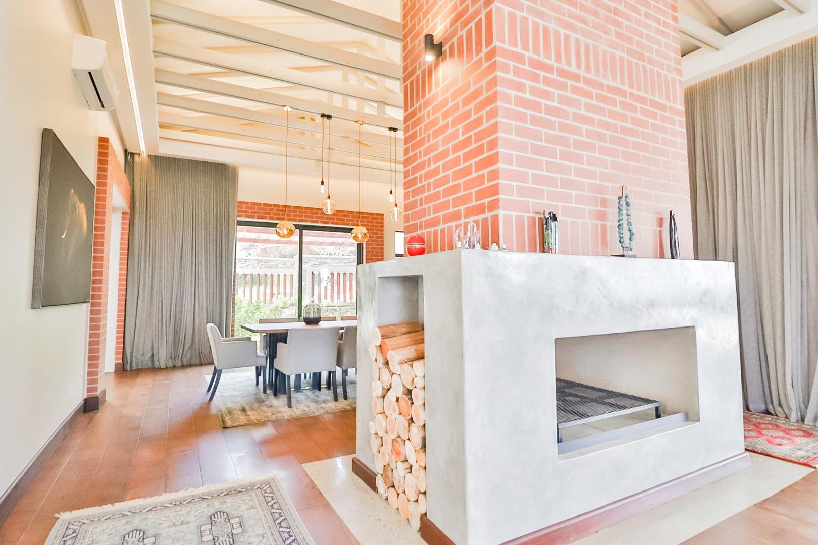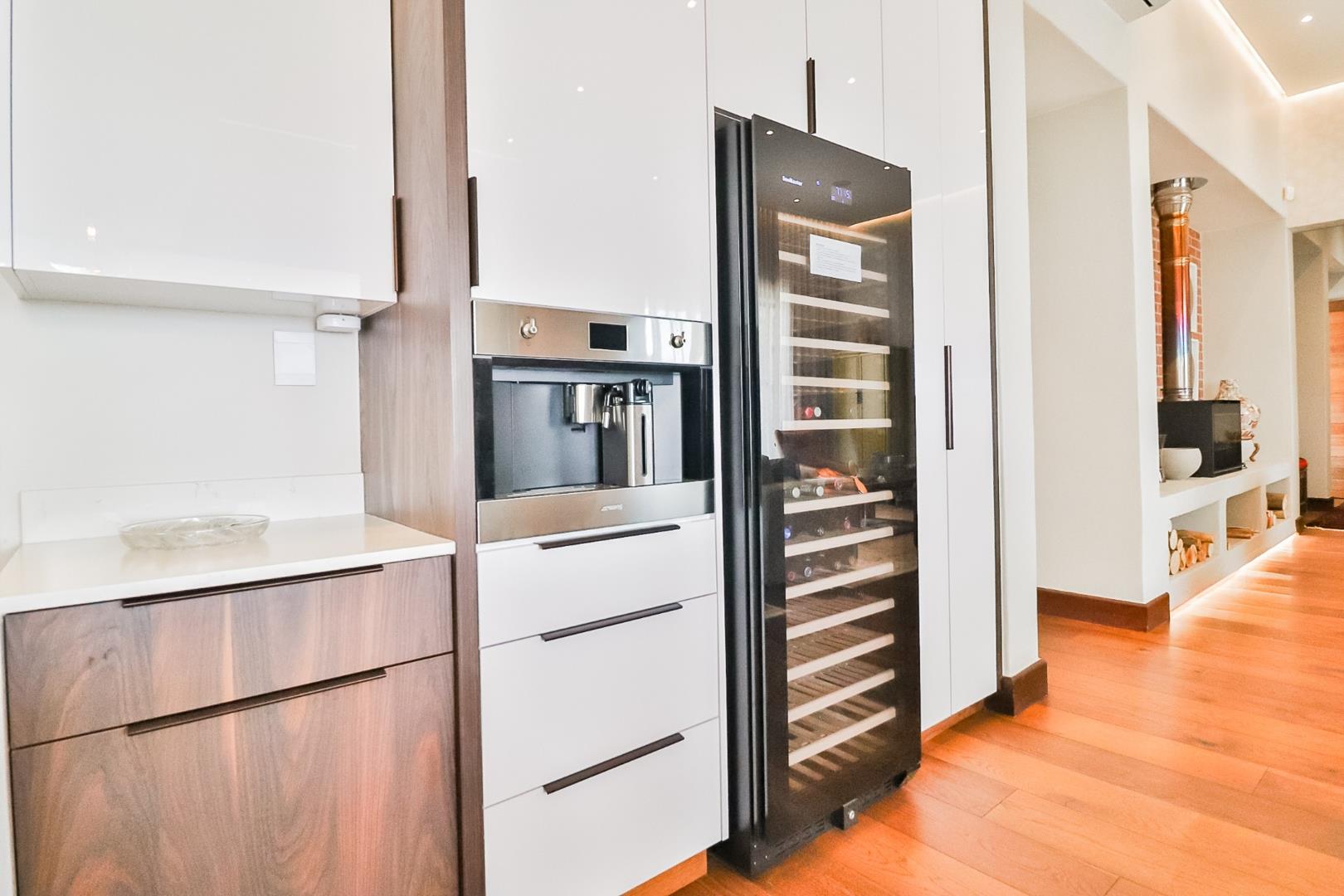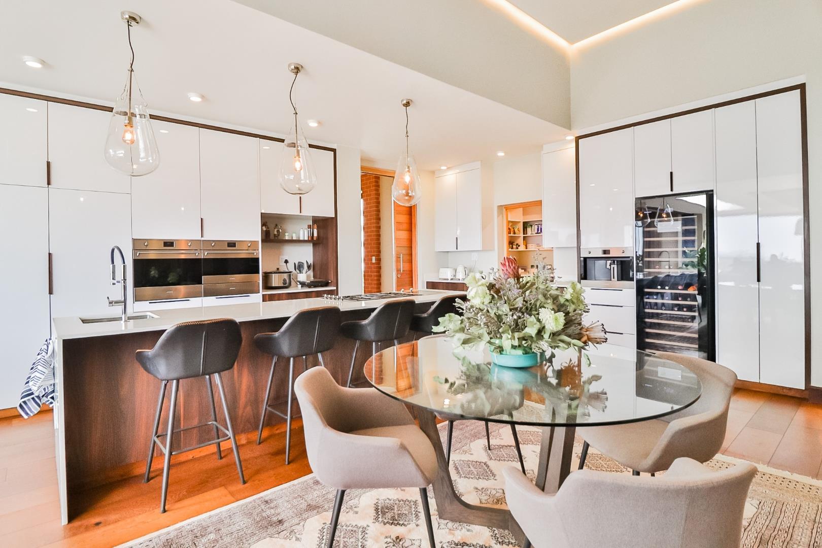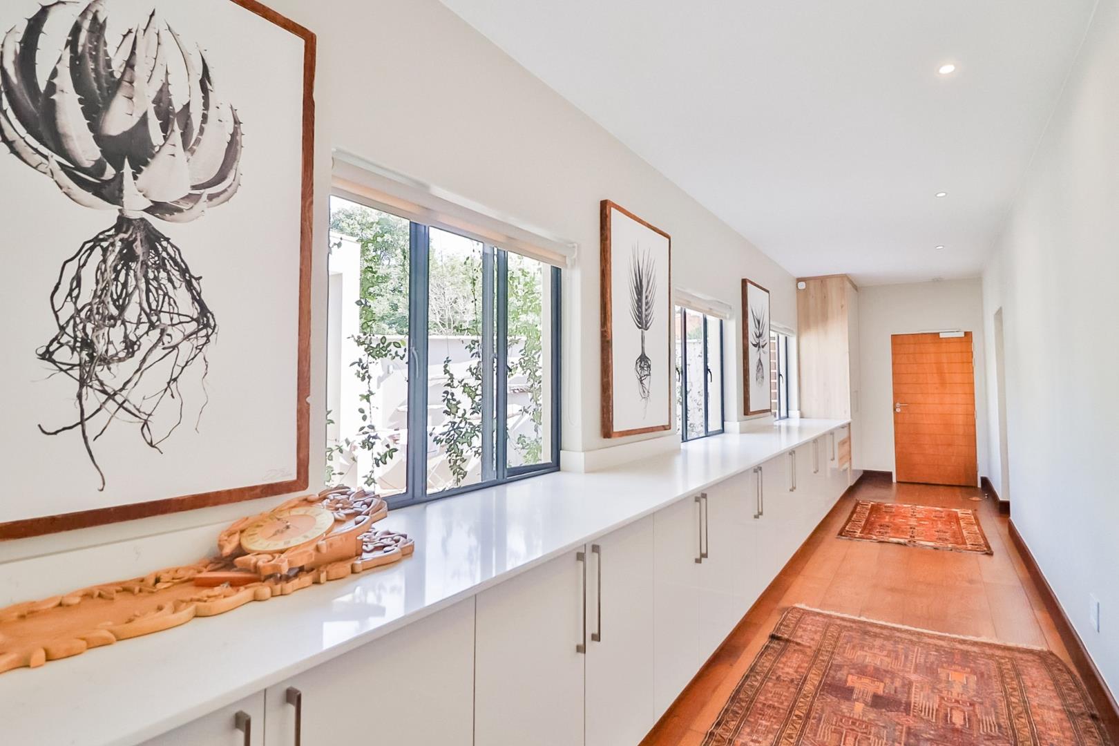 Upon entering, guests are greeted by a guest loo, setting the tone for the home`s commitment to both hospitality and practicality. The double-volume living areas create an expansive and open atmosphere, with breathtaking views or tranquil garden scenes. This dual aspect allows residents to choose between gazing out over the landscape or enjoying the serenity of a private, flowered garden.