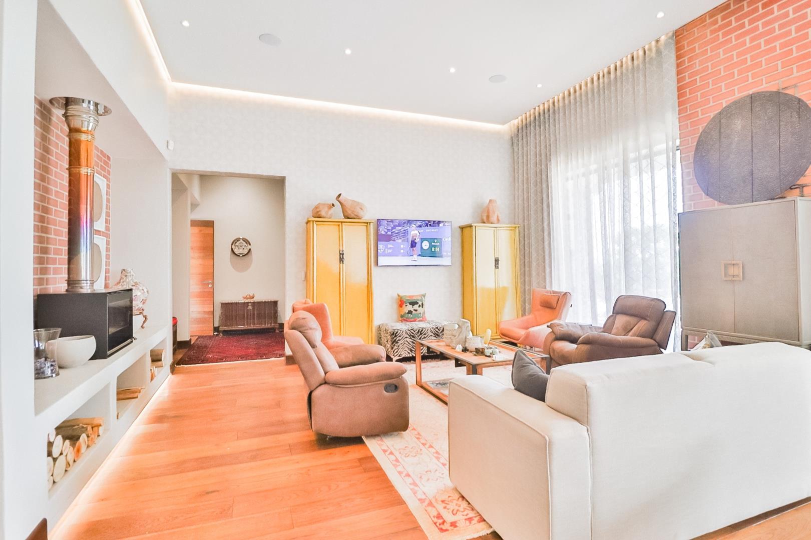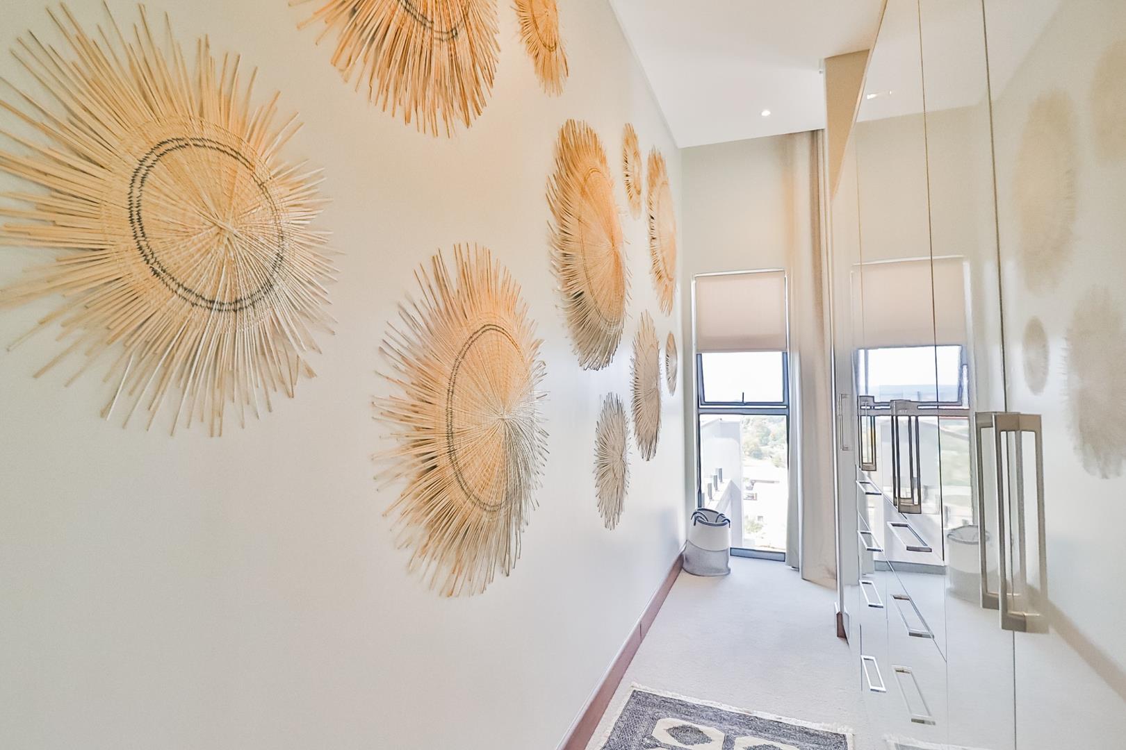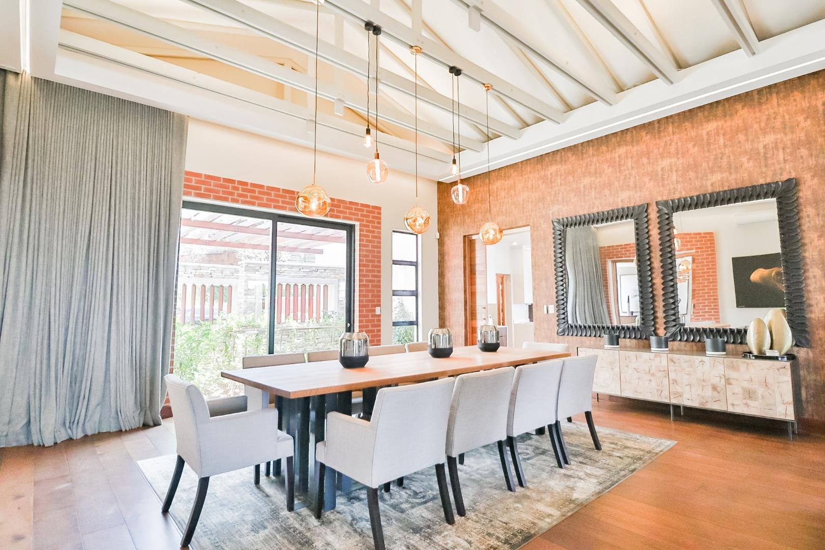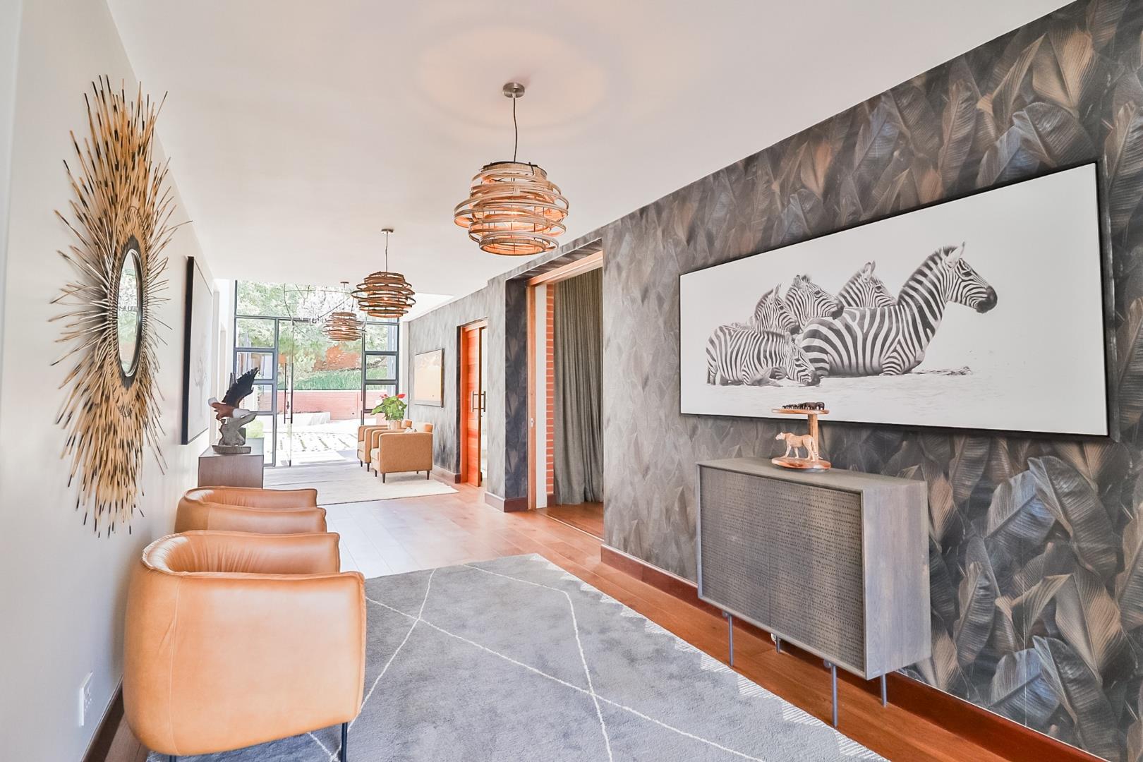 Upon entering, guests are greeted by a guest loo, setting the tone for the home`s commitment to both hospitality and practicality. The double-volume living areas create an expansive and open atmosphere, with breathtaking views or tranquil garden scenes. This dual aspect allows residents to choose between gazing out over the landscape or enjoying the serenity of a private, flowered garden.