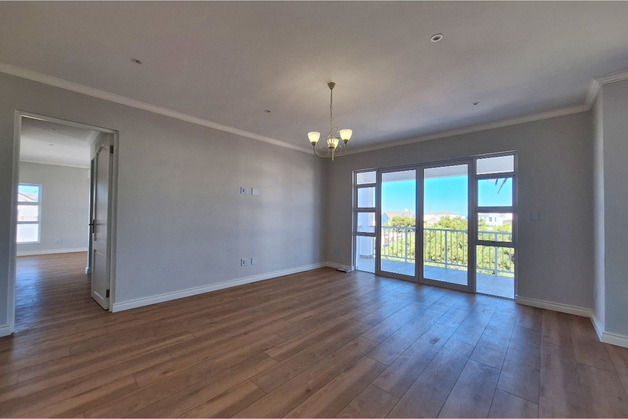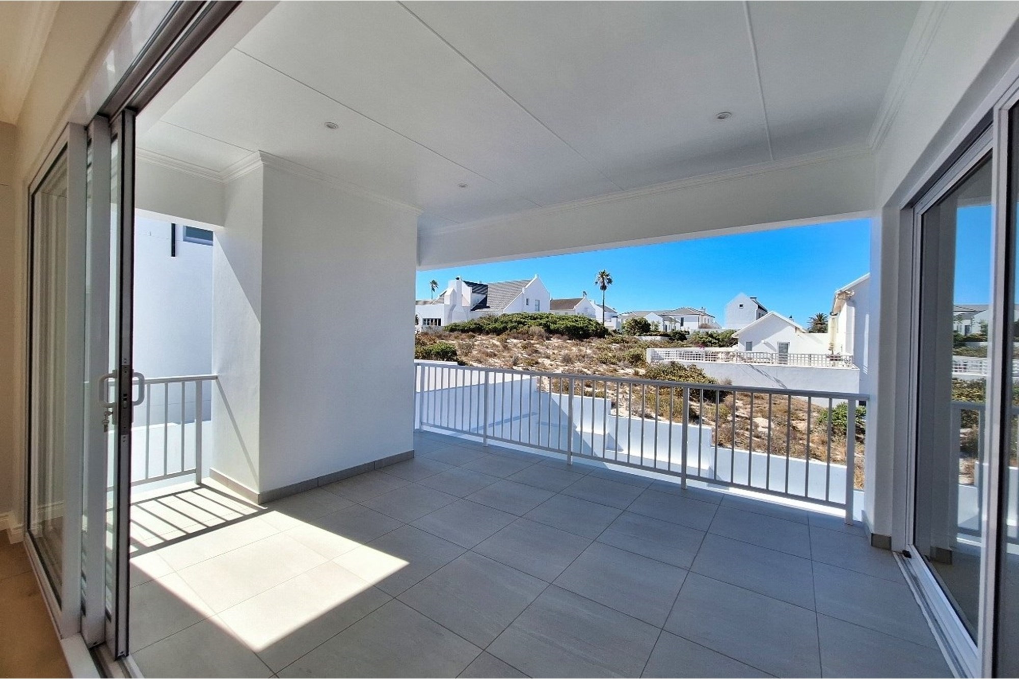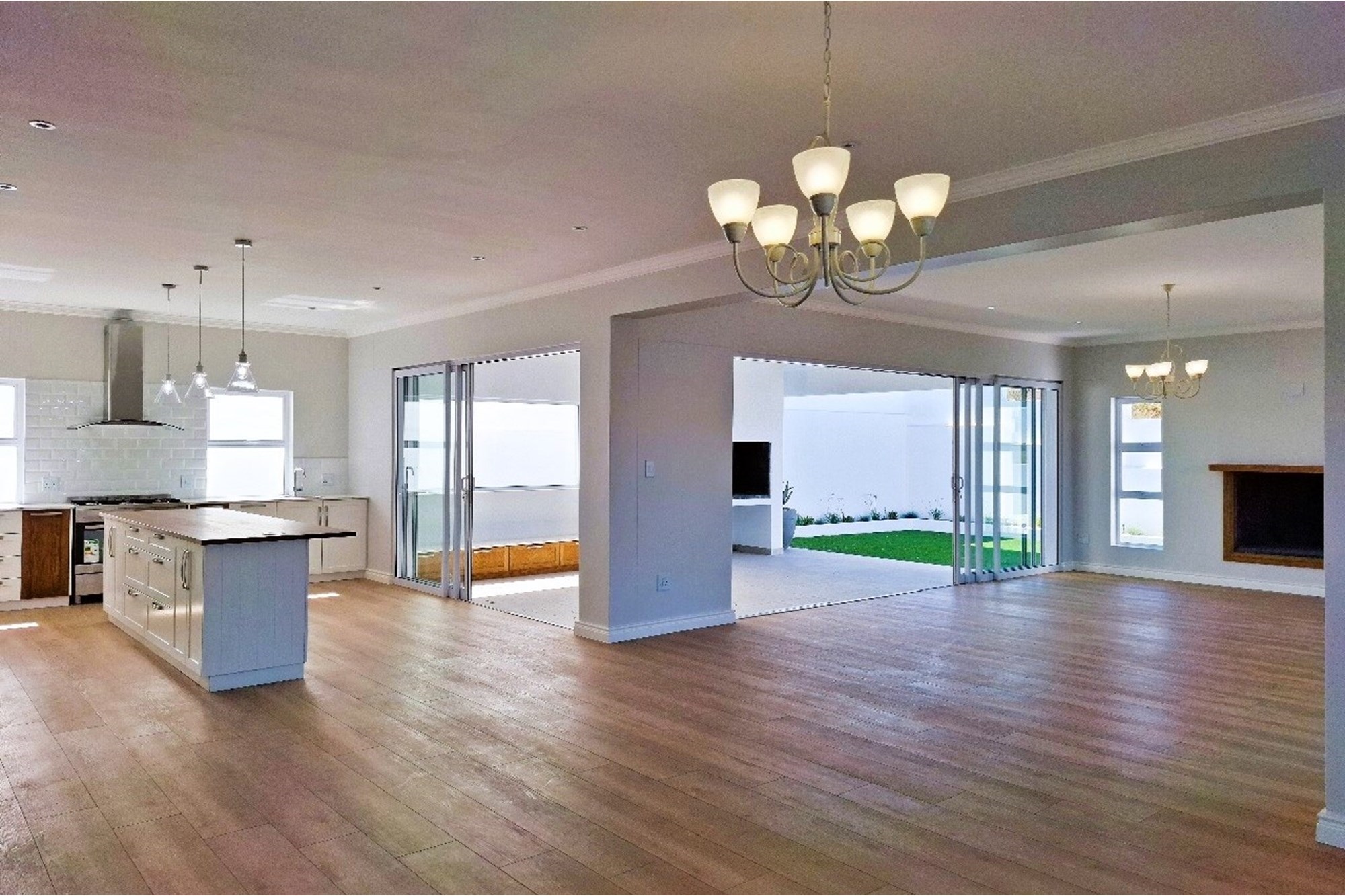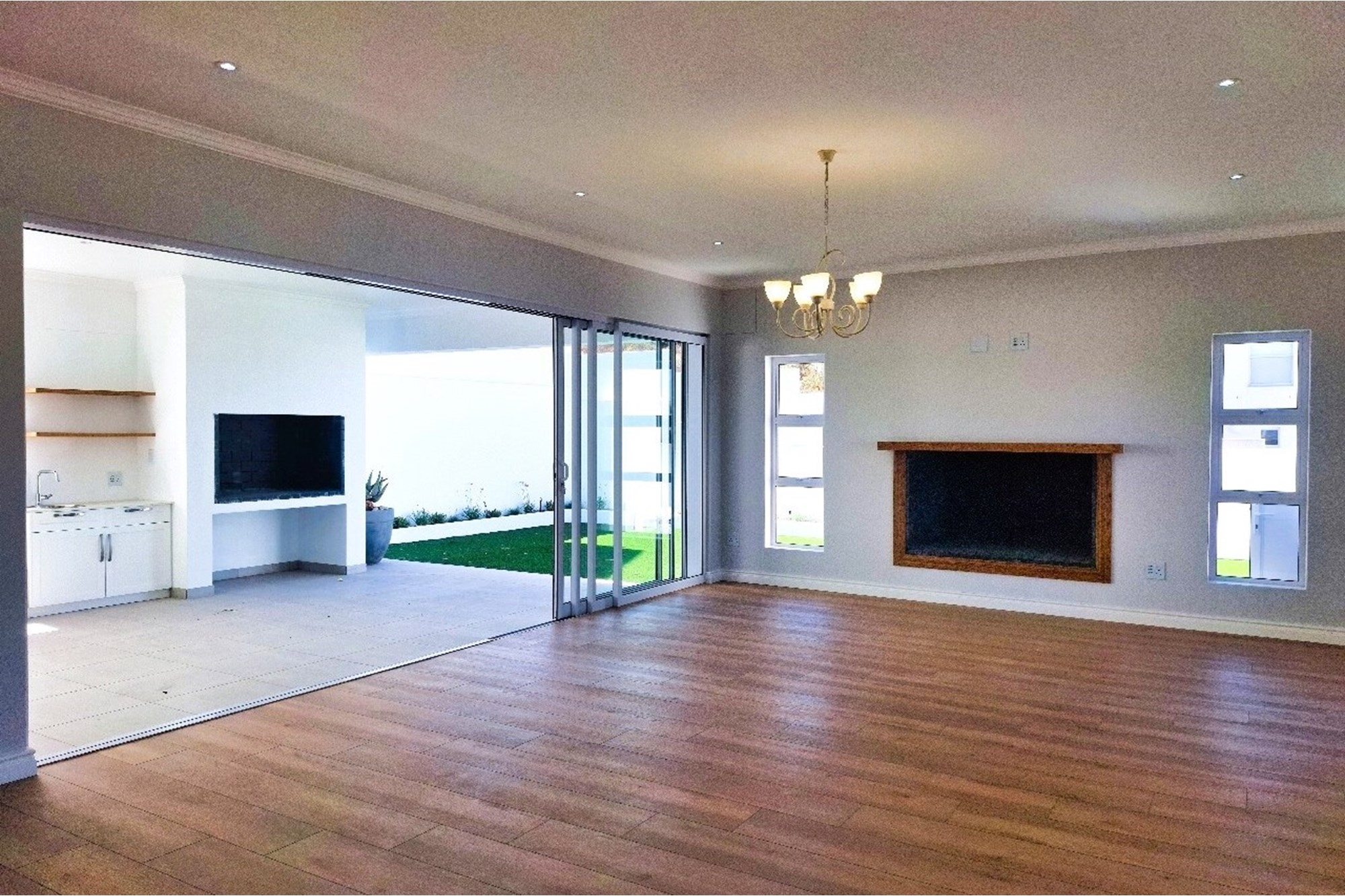 Large sliding doors open to a vast, covered patio with built-in braai (barbecue), perfect for year-round outdoor entertaining.