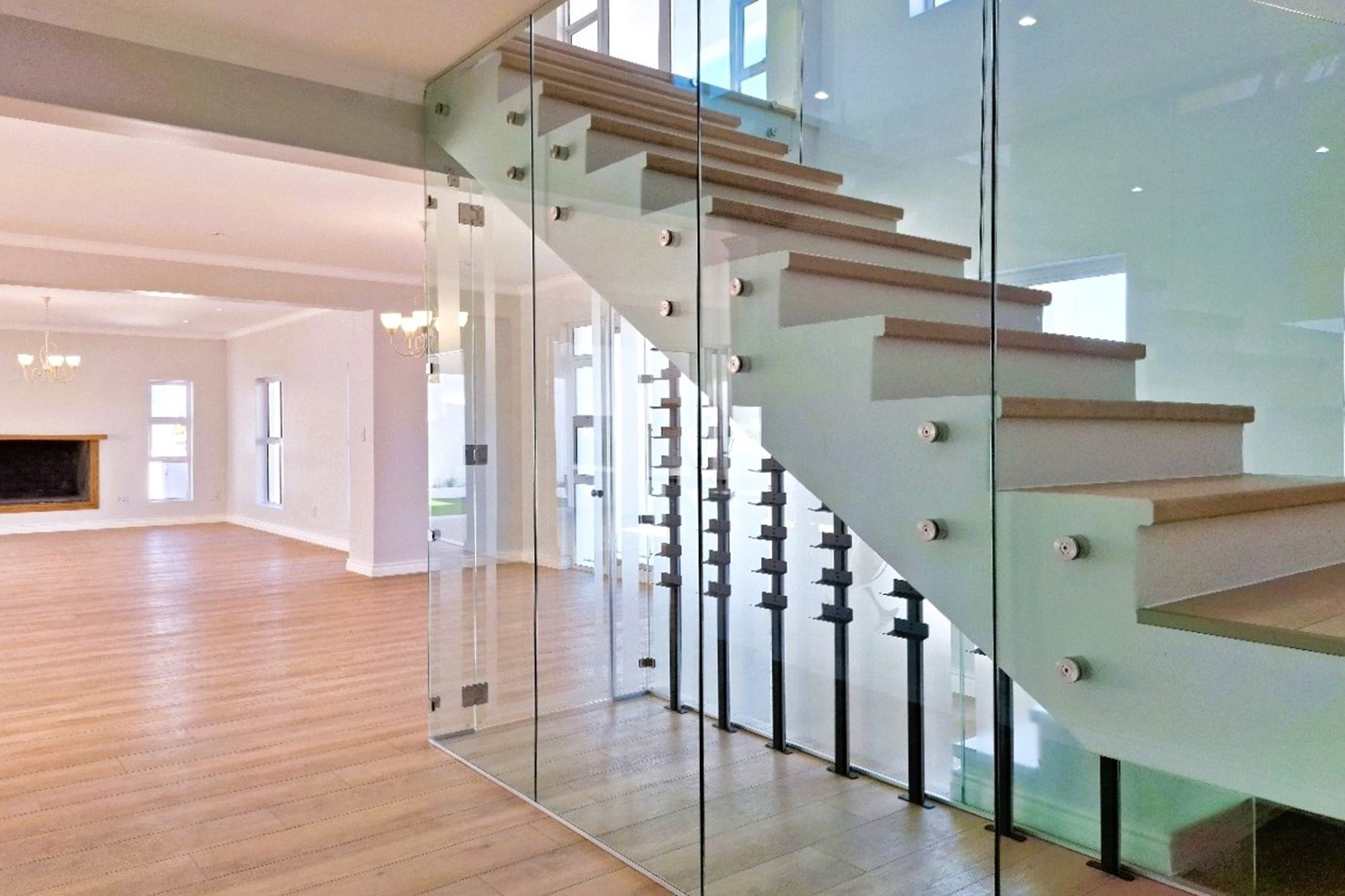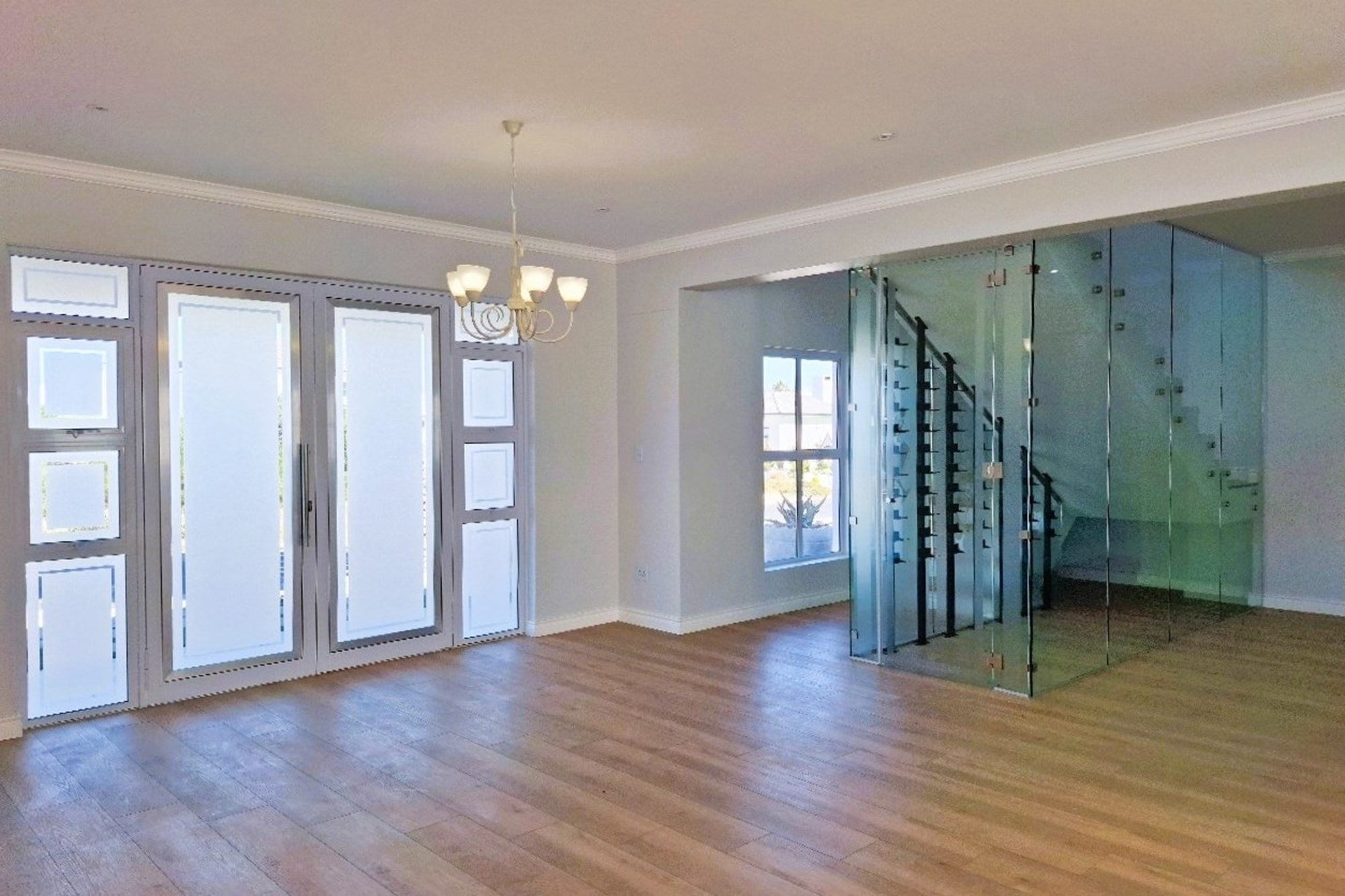 Enter through impressive double glass doors into a spacious, light-filled living and dining area with expansive windows and a cozy, wood-cladded fireplace—ideal for family gatherings and entertaining.