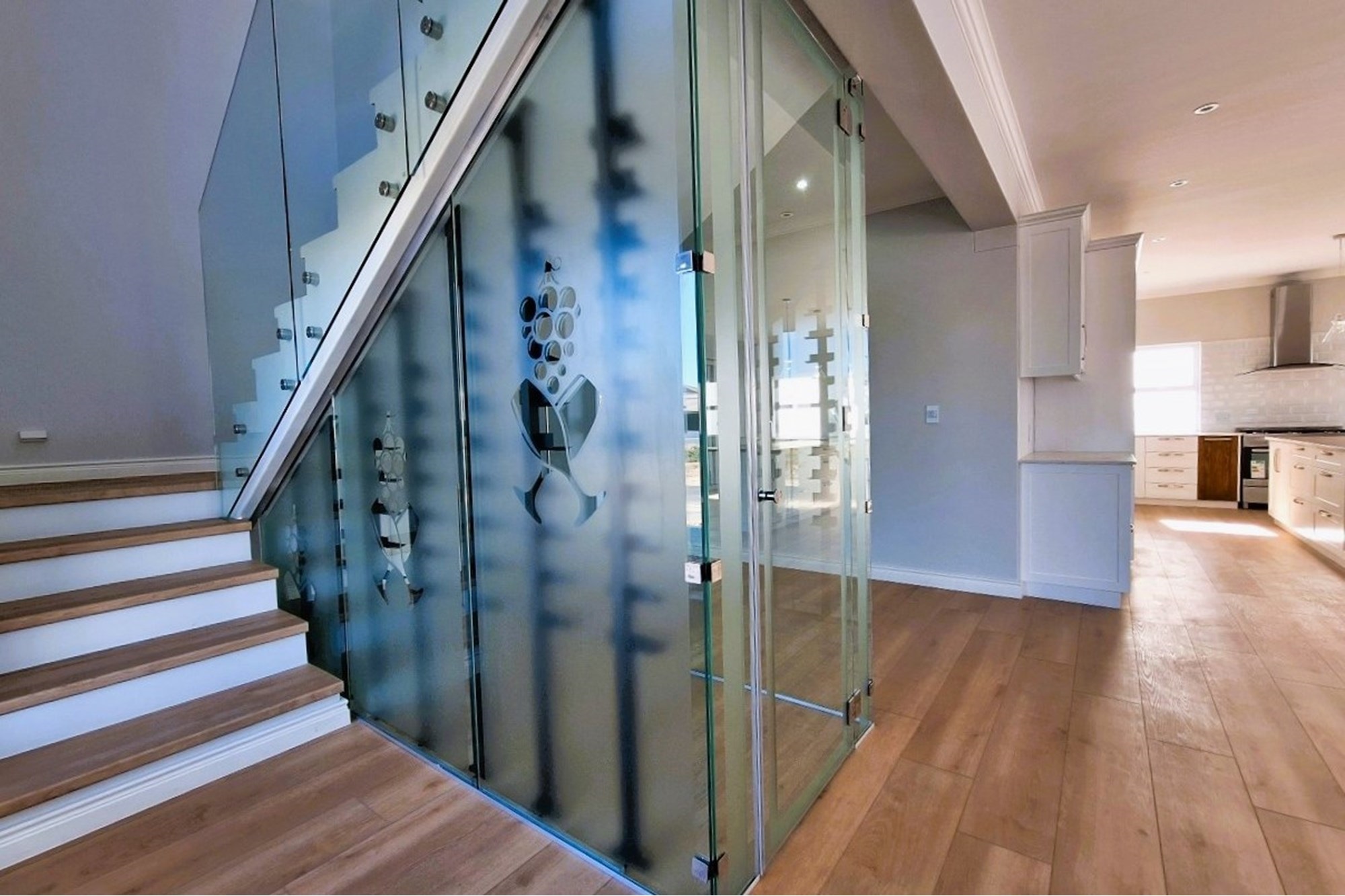 A designer glass-enclosed wine cellar adds a sophisticated touch for collectors and entertainers alike.