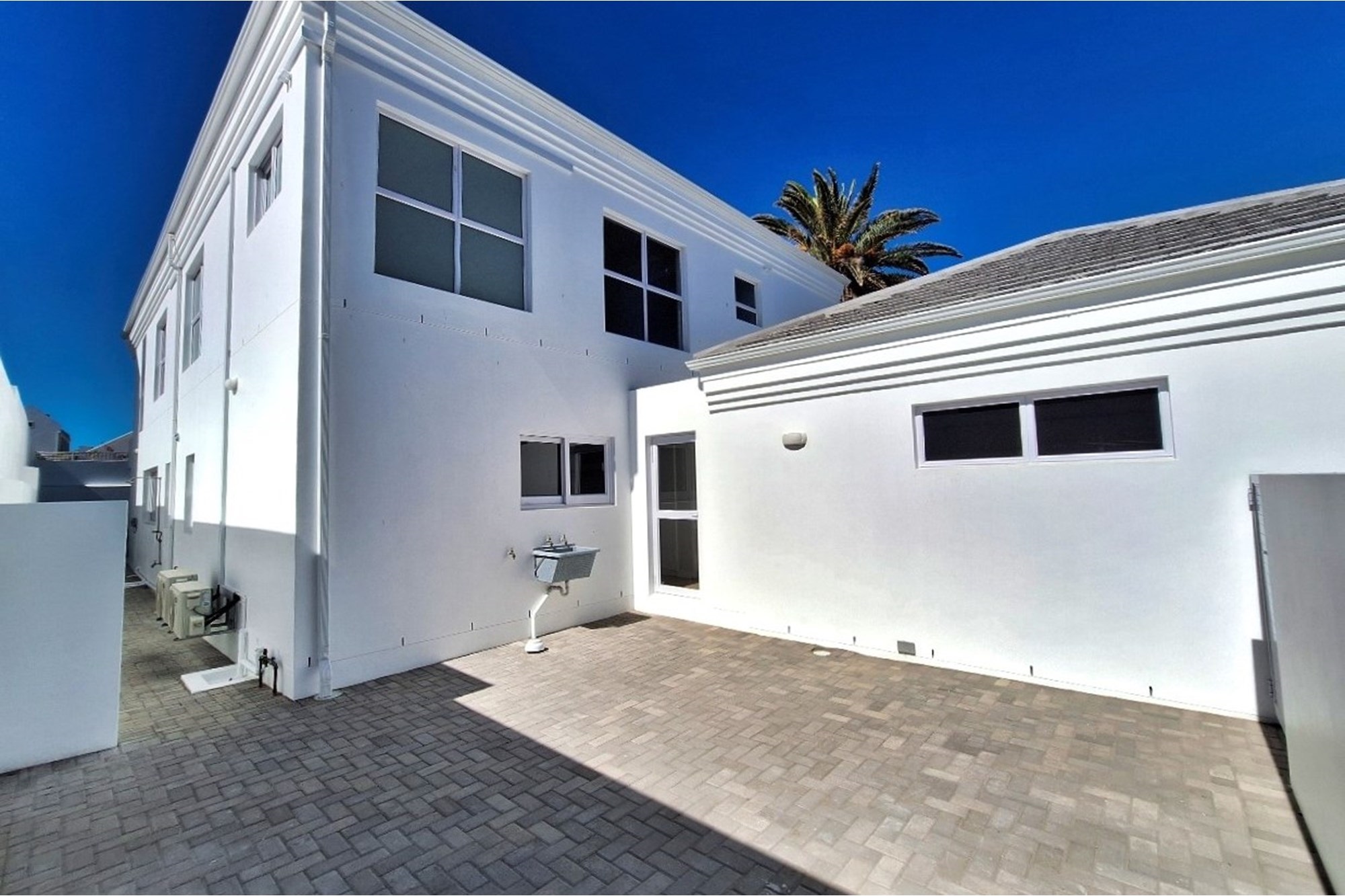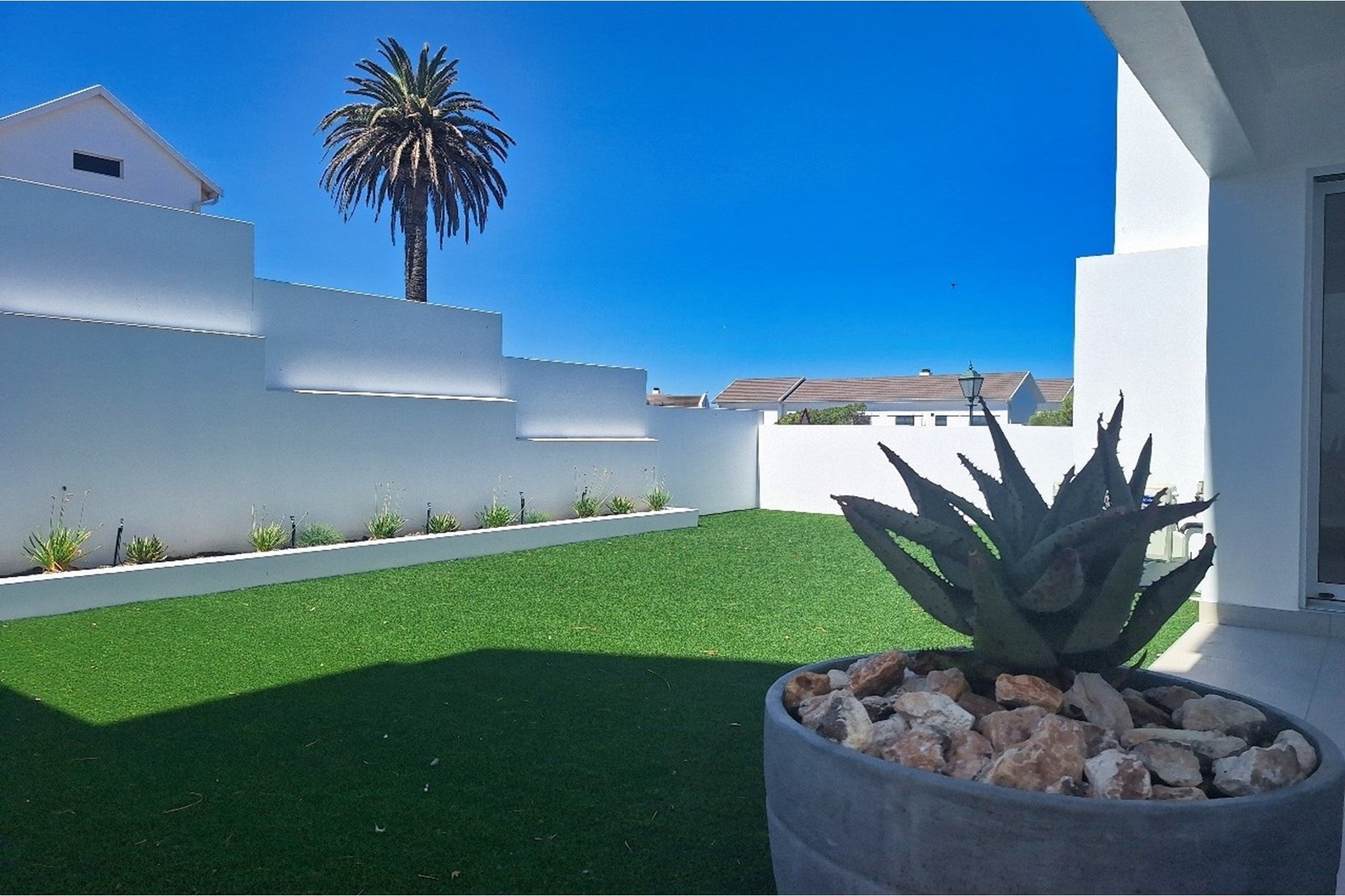 Landscaped, low-maintenance garden with synthetic lawn ensures greenery with minimal upkeep, and paved exterior areas provide additional space for relaxation or play.