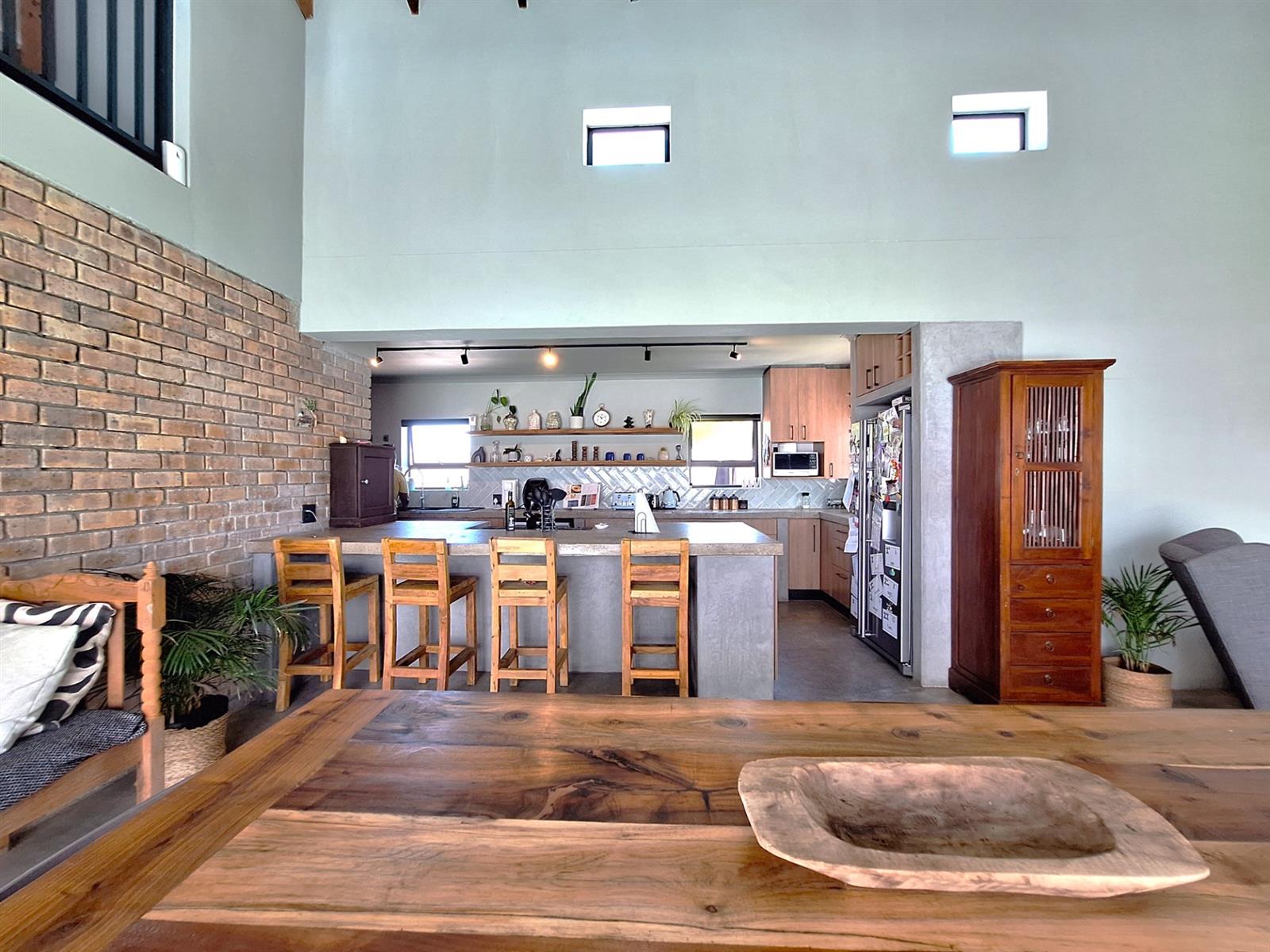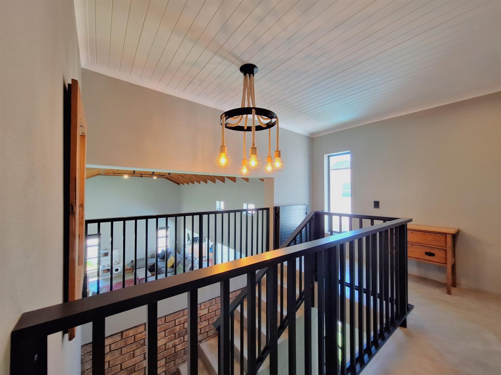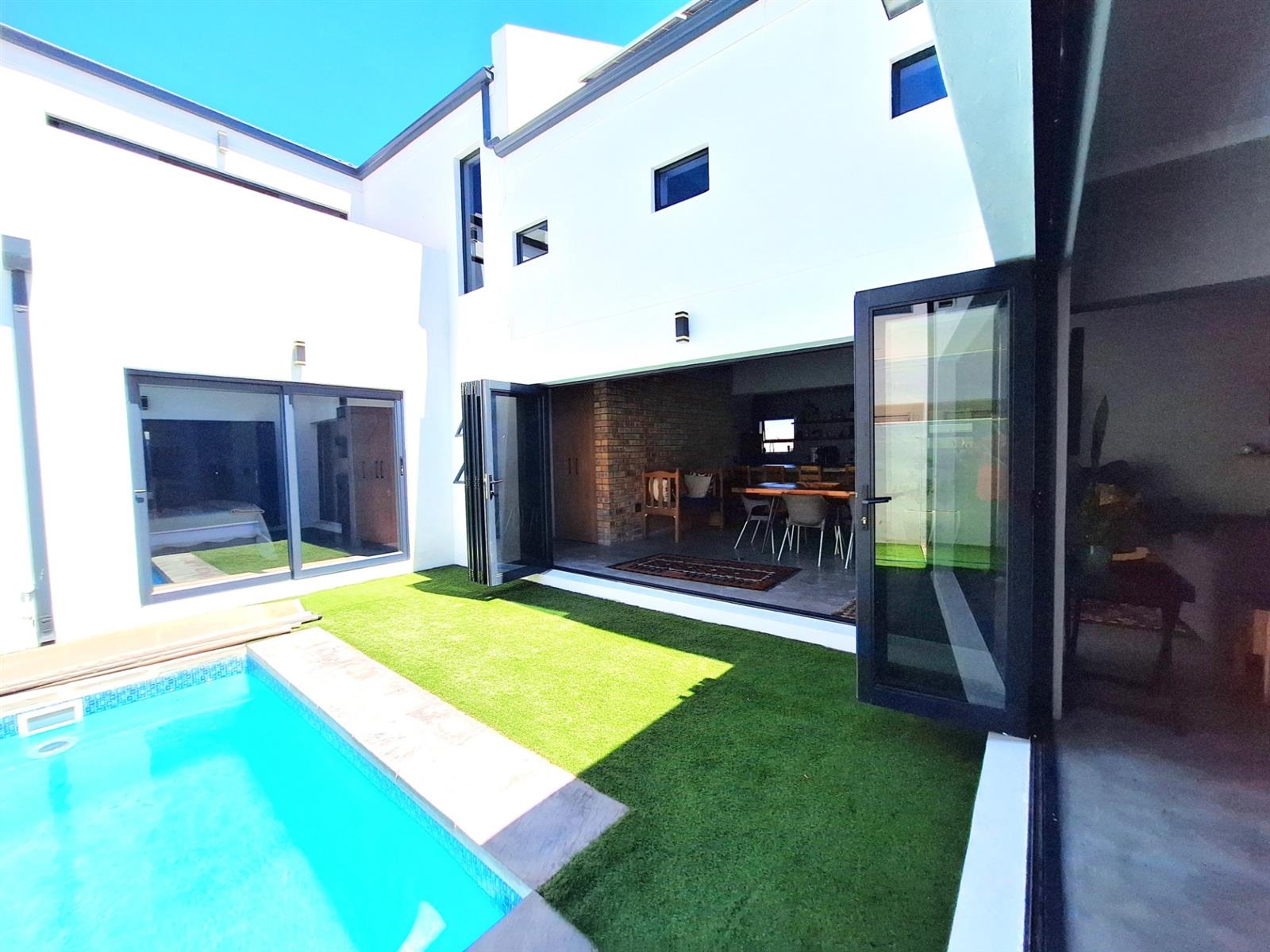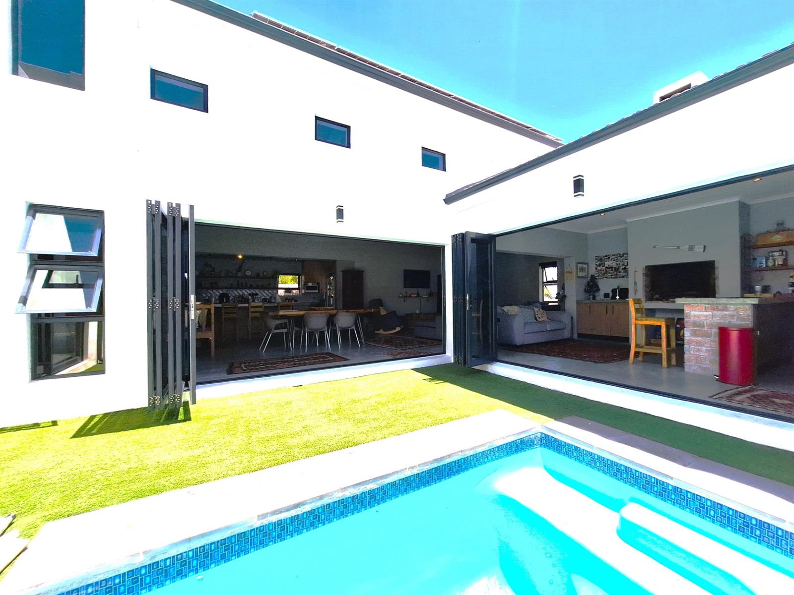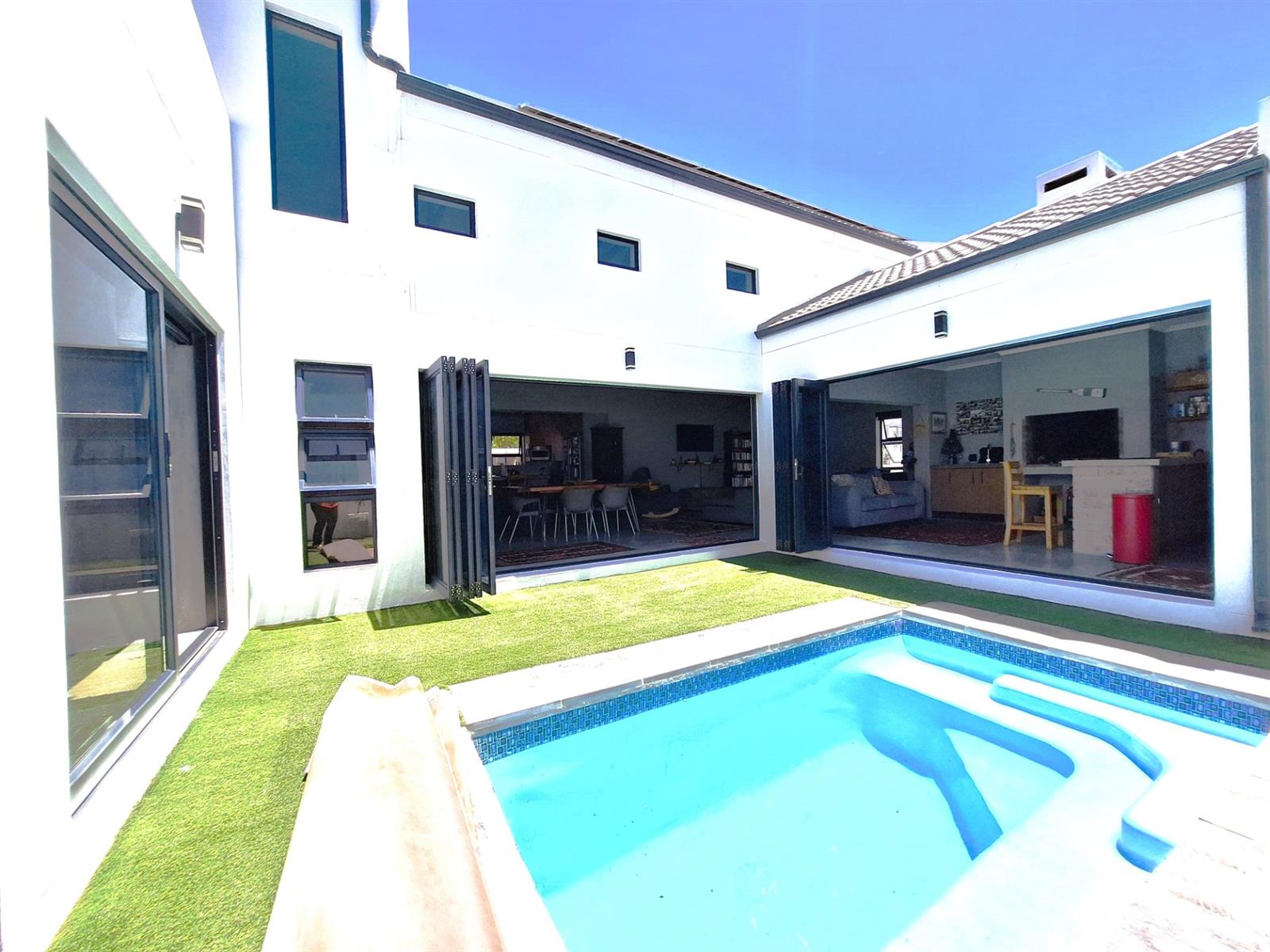 The home’s layout wraps smartly around a central pool, giving it a relaxed resort feel in your own backyard. Downstairs, there`s a handy guest suite with its own full en-suite and sliding doors straight to the pool and garden—great for visitors or extended family. The open-plan kitchen and living area has those lovely high ceilings, flowing into a modern industrial-style kitchen with a big centre island, plenty of cupboards, a pantry, and matching counters. Stacker doors open to the built-in braai, bar area, and pool for seamless entertaining. There is also a guest toilet downstairs for convenience. A separate scullery, laundry, double linen cupboard, and paved drying yard help to keep everything running smoothly.