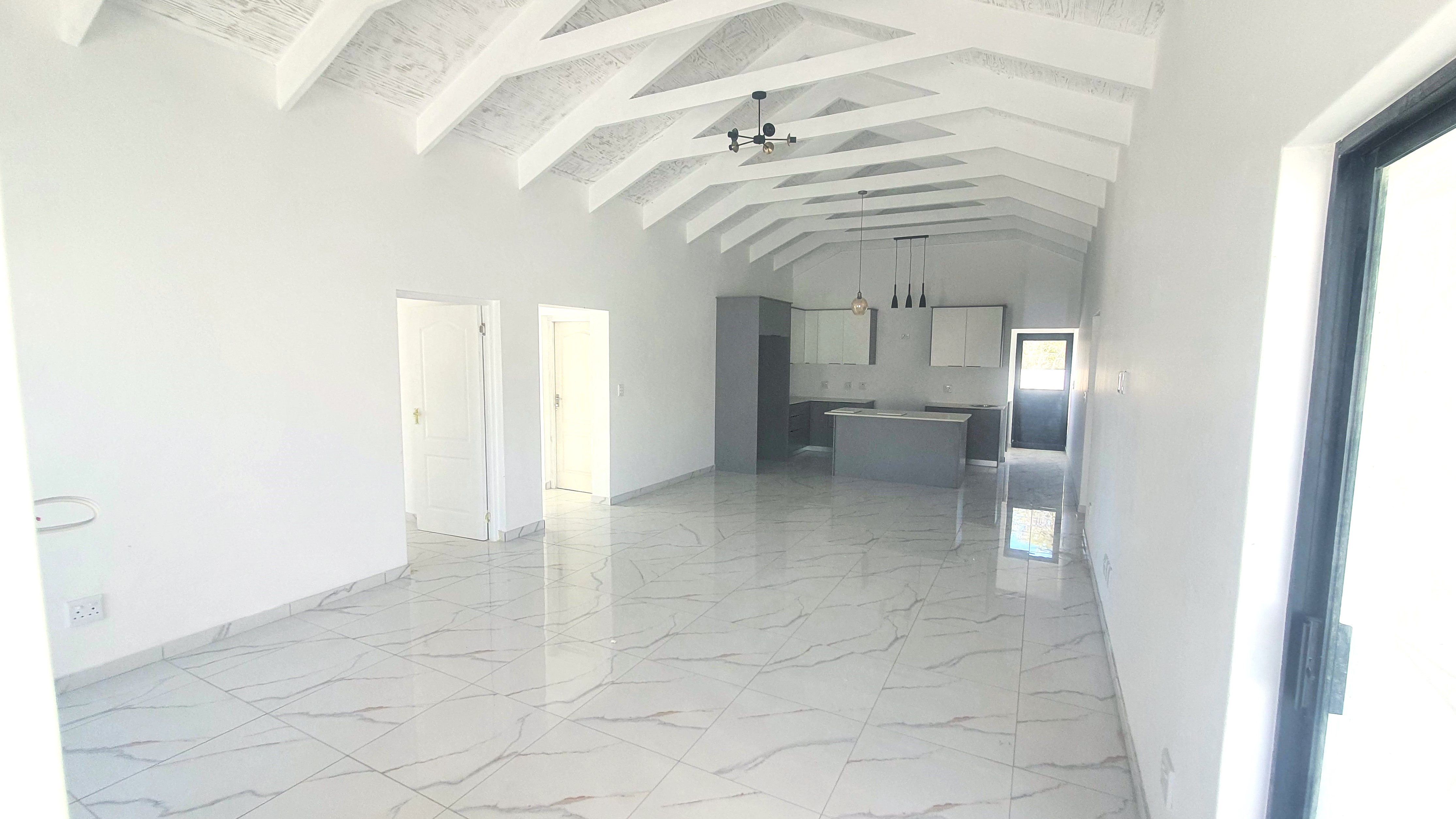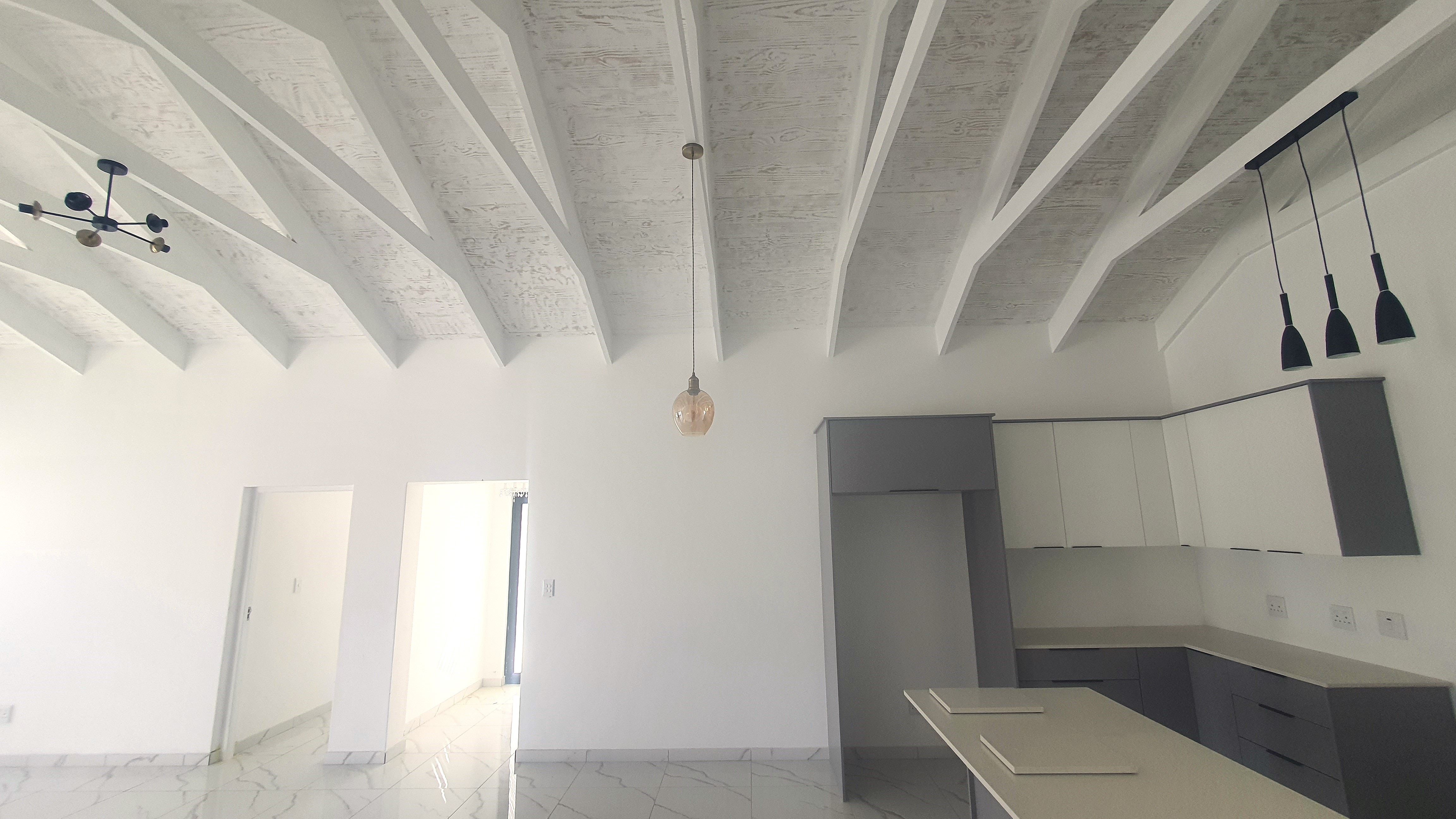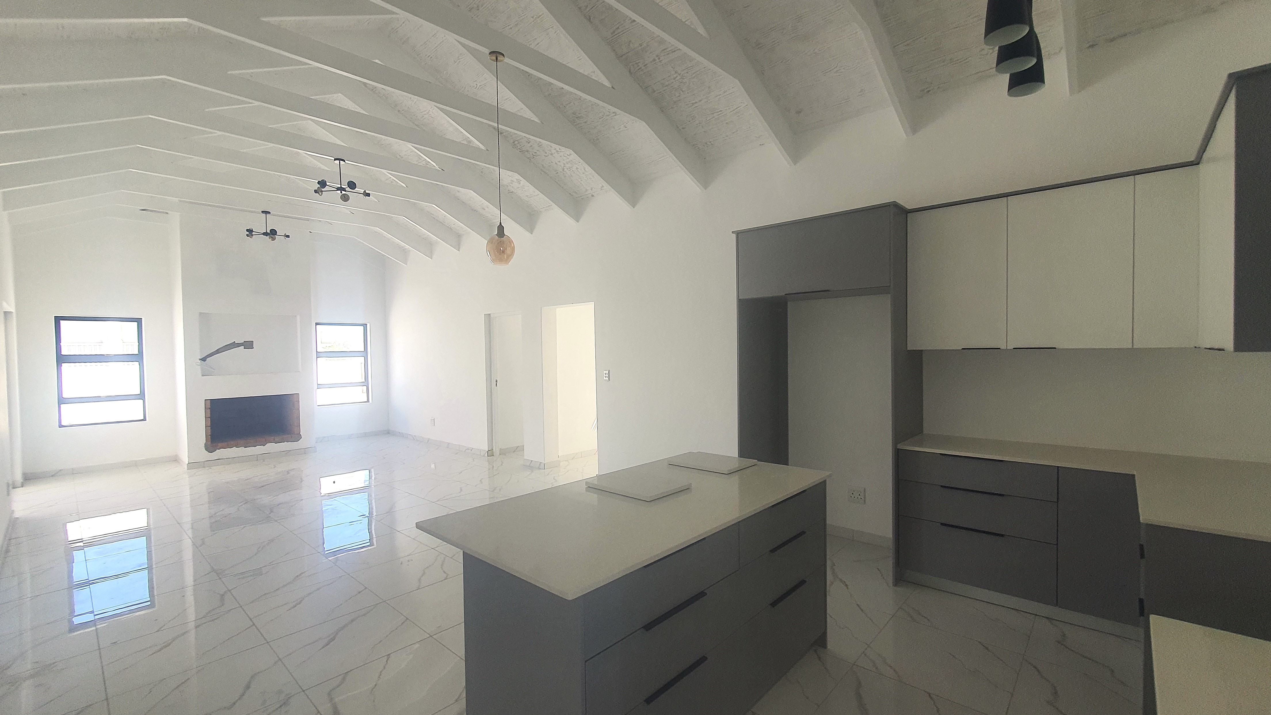As you enter the home, you are greeted by an expansive open-plan high-beam ceiling living and kitchen area. This luxurious yet homely space is filled with stylish modern features, including sleek cabinetry, high-end finishes and lighting, ensuring comfort and elegance. The kitchen is well-equipped with ample cupboard space, a gas hob and an oven, perfect for any cooking enthusiast. Additionally, a scullery provides convenience. There is direct access to the automated double garage, further enhancing the home’s practical layout.