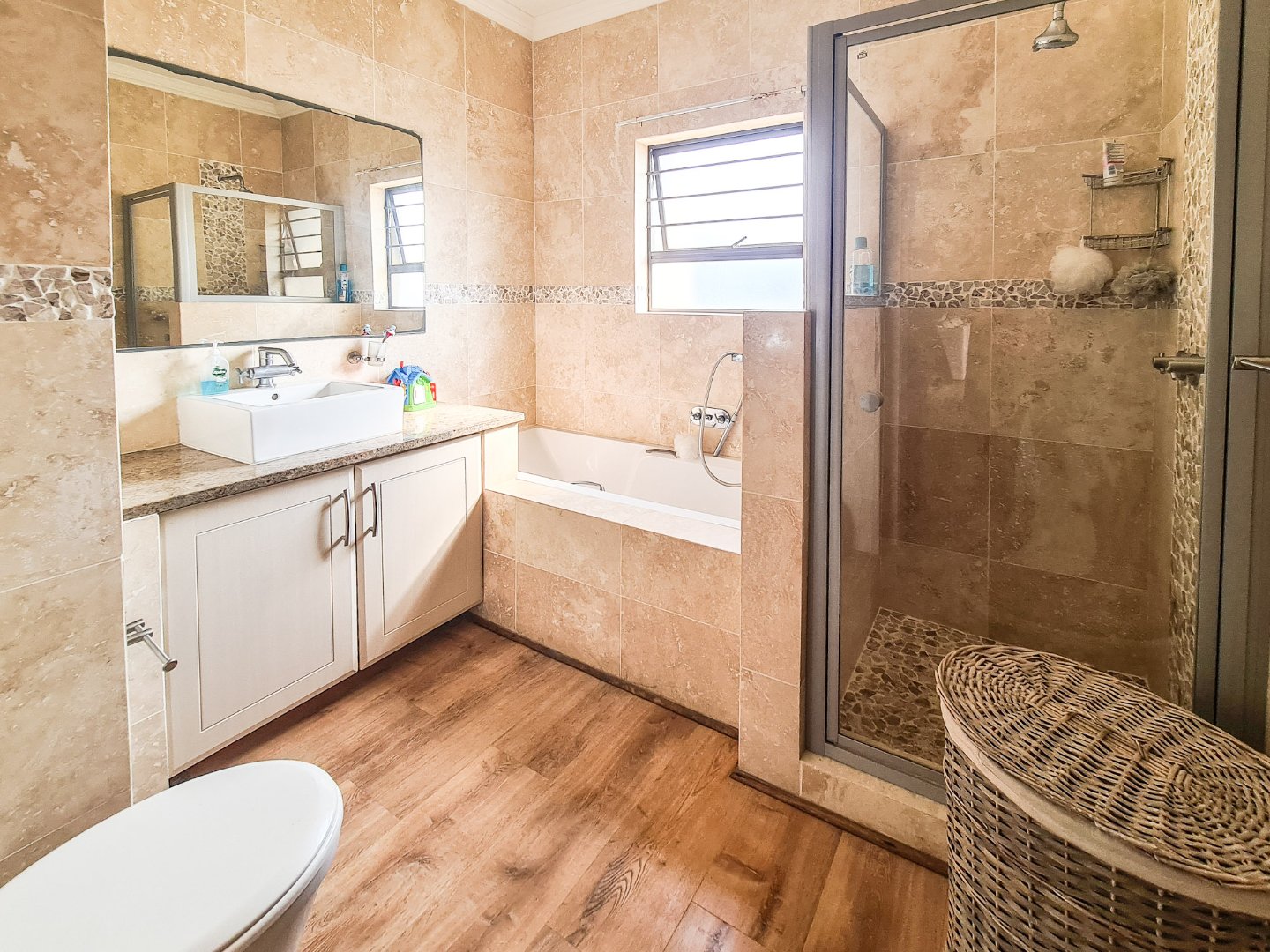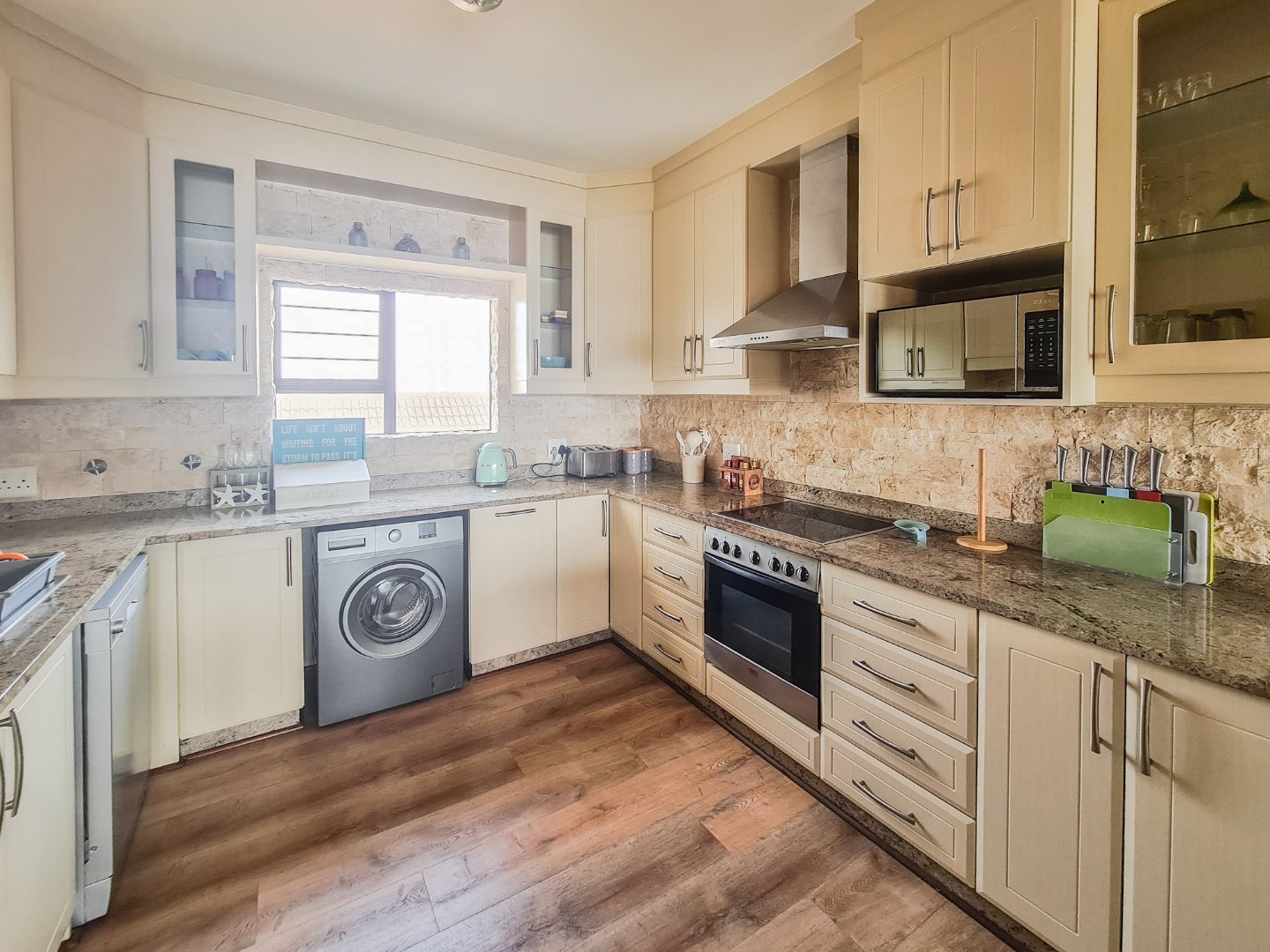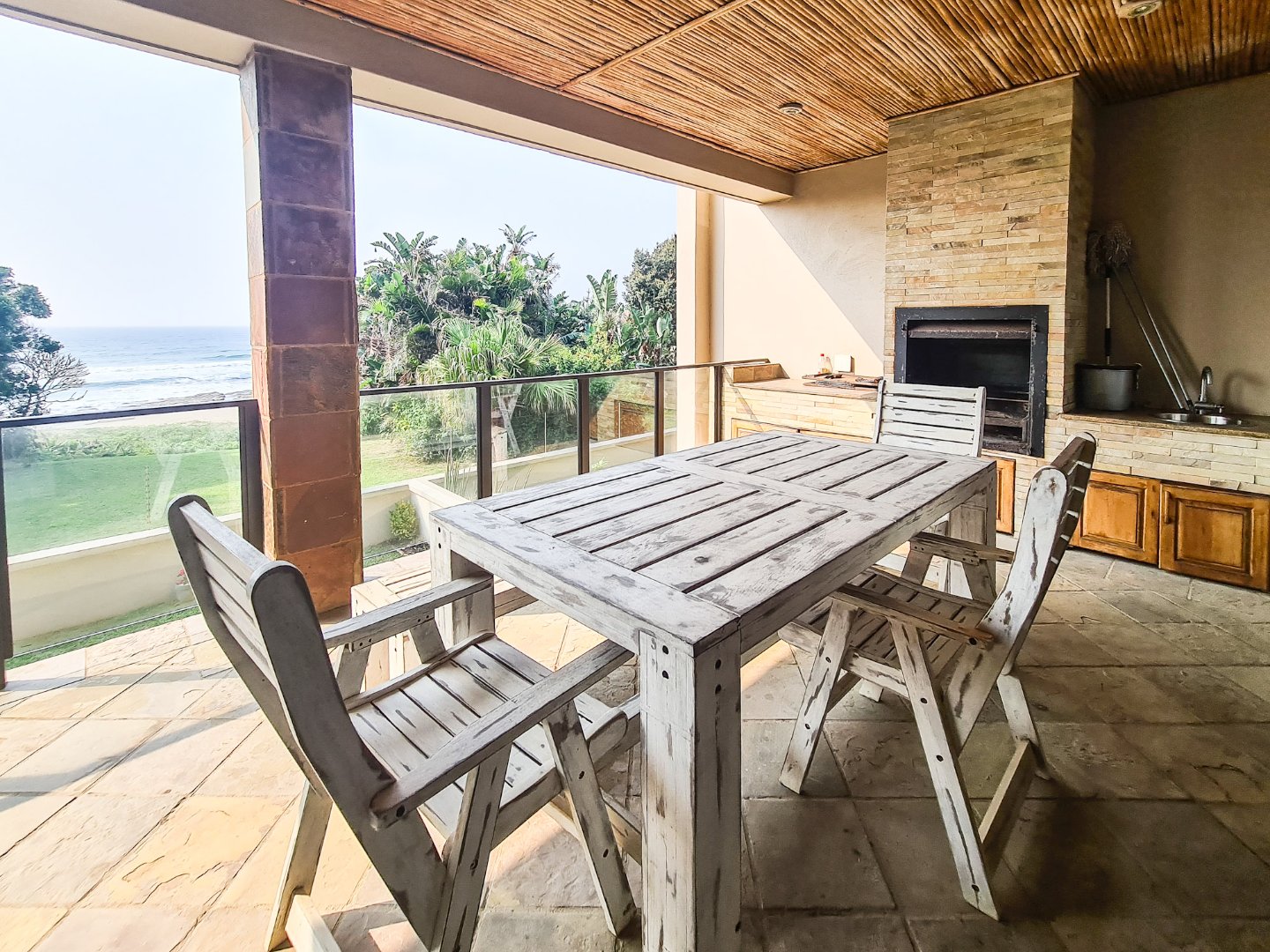 The apartment is open plan designed, has fully laminated flooring and is neat as a pin. The kitchen boasts granite tops, ample cupboard space and a breakfast nook. The lounge and dining area are spacious and leads, via sliding doors, to the balcony, which has sea breaker views and a built-in braai, perfect combination for outside dining. The bedrooms are well sized and all have built in cupboards. The main bedroom has its own main full en-suite and also opens to the balcony via sliding doors. The unit has its own designated lock up and go garage and there is space for guest parking.