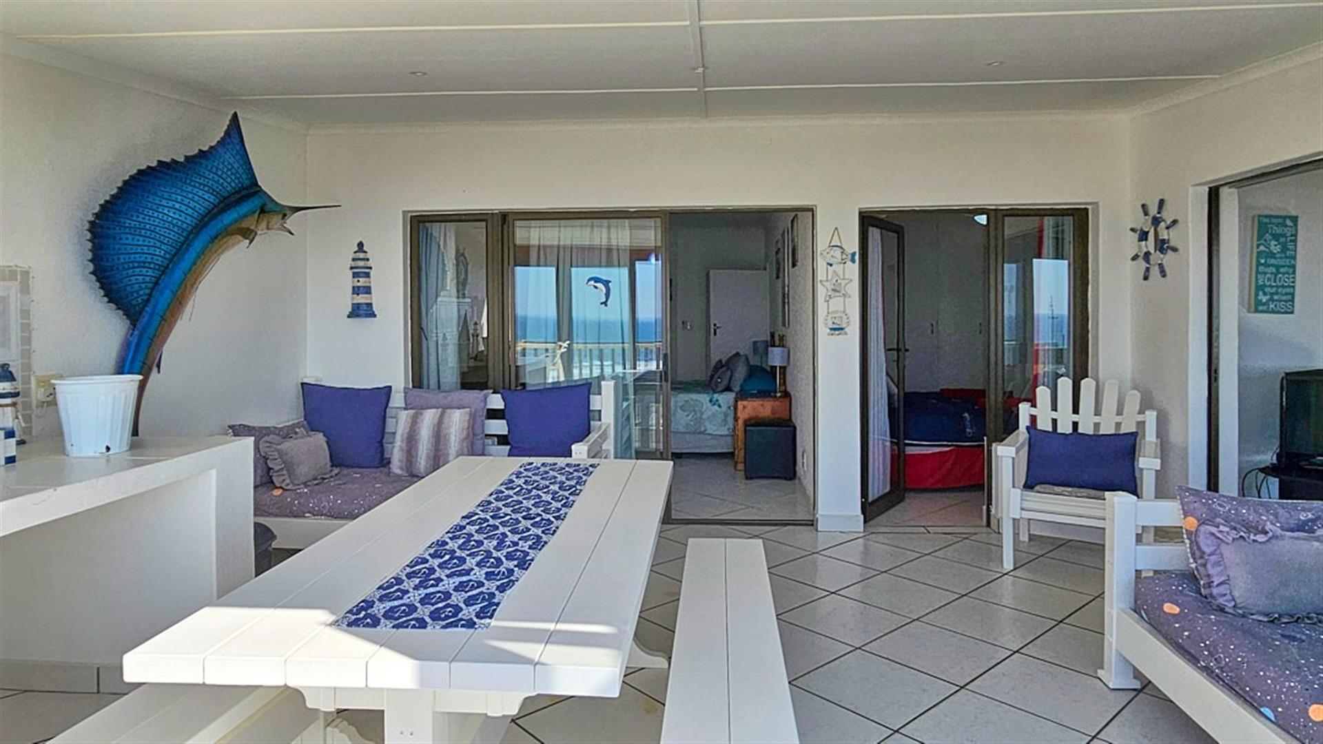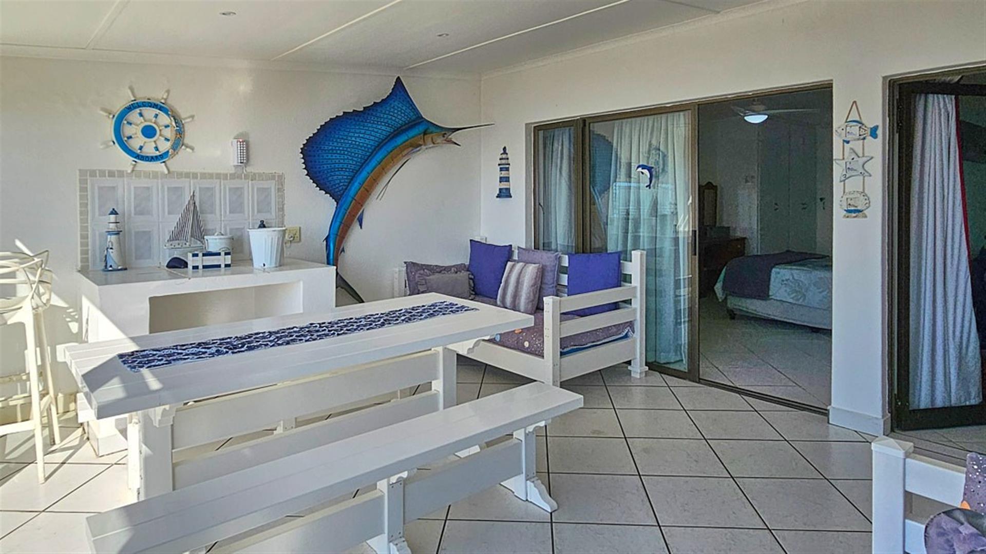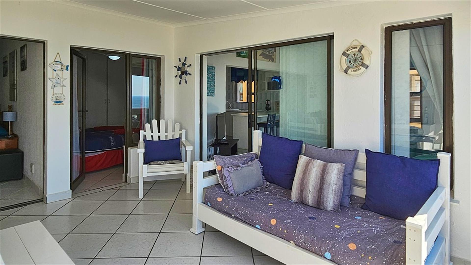 The 2 bedrooms are spacious with the main bedroom en-suite to a full bathroom. the second bedroom makes use of the second bathroom with a bath. This is THE PERFECT LOCK-UP AND GO!! There is a washing machine and a dryer for getting those outfits clean and dry for the next fishing session. Whether you are a fisherman or a beach baby, everything is sooo close to the complex. A short walk to the Shelly Beach Mall, overlooking the ocean. Once here, you actually don`t need to drive again until you leave for home. Park your car, and most of the amenities are close by. The complex is beautifully maintained and secure. There is even secure parking for your boat near the entrance inside the complex. There is a large, sparkling blue communal pool with braai areas, from where you can still be enchanted by overwhelming views of the ocean and it`s magnificence. The apartment comes with one undercover parking. There are parking available for visitors. There is a more private braai area close to your apartment. All the furnitute and appliances are negotiable. THE ULTIMATE BEACH BARGAIN!! GIVE ME A CALL.....