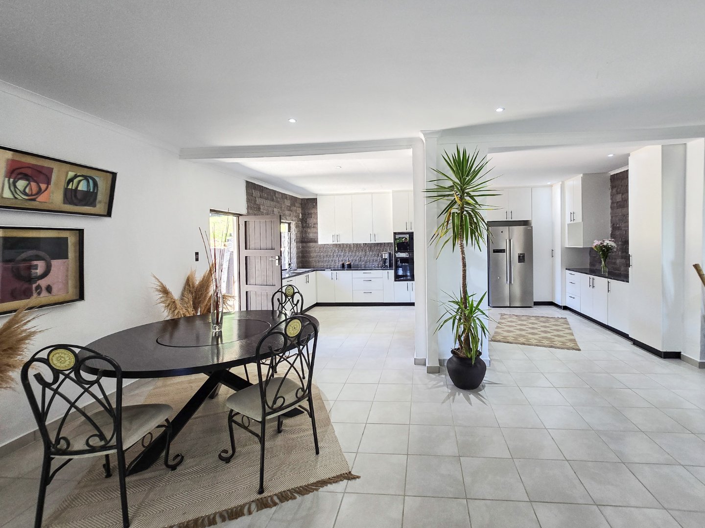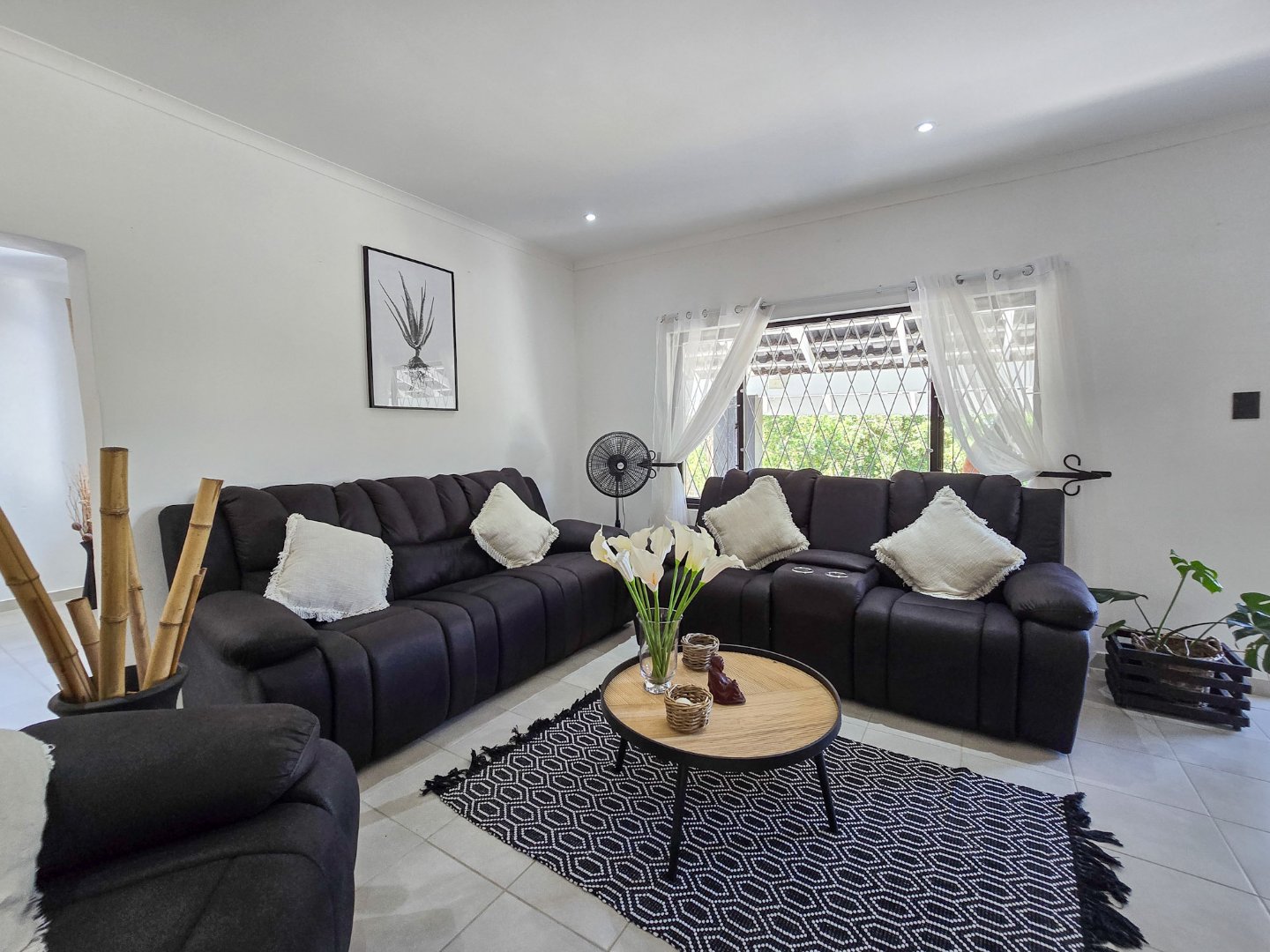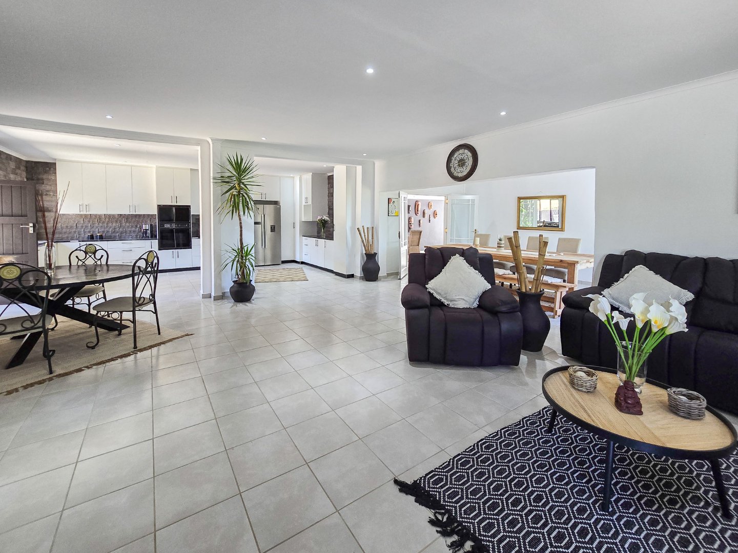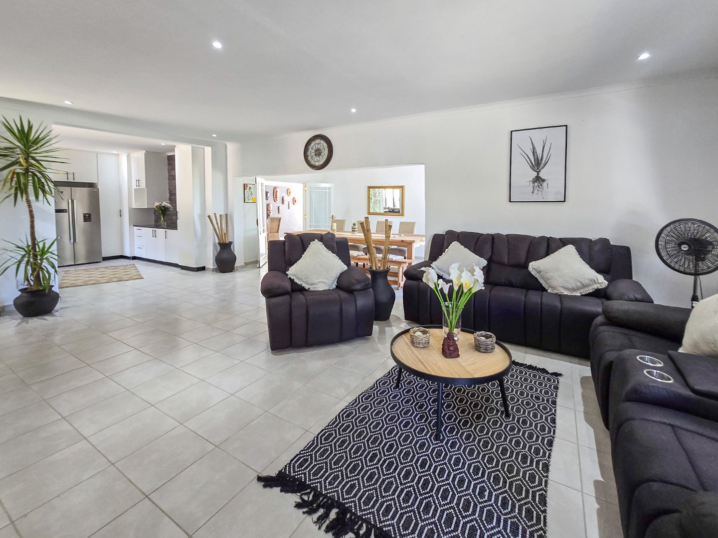 There are 4 bedrooms, two of which boasts ensuites. The one bedroom can easily serve as a cozy lounge, ideal for relaxing or hosting friends. This bedroom is currently used as a small lounge as there is no built-in cupboards. The large living area can accommodate two dining room tables, making it perfect for large family gatherings.