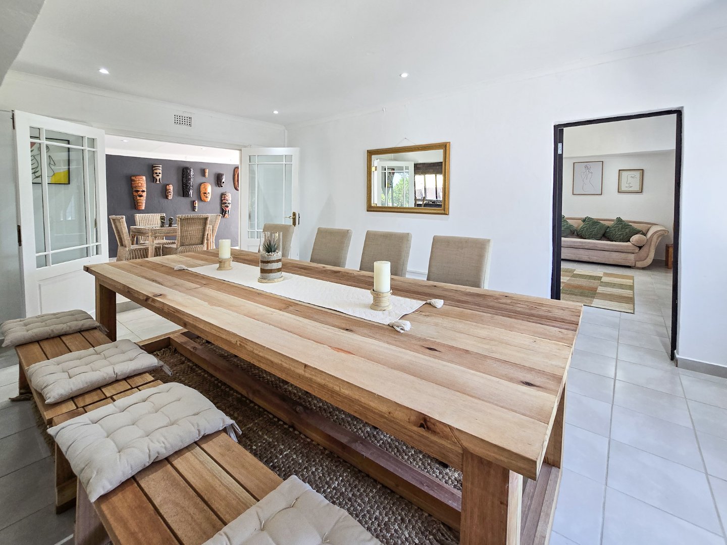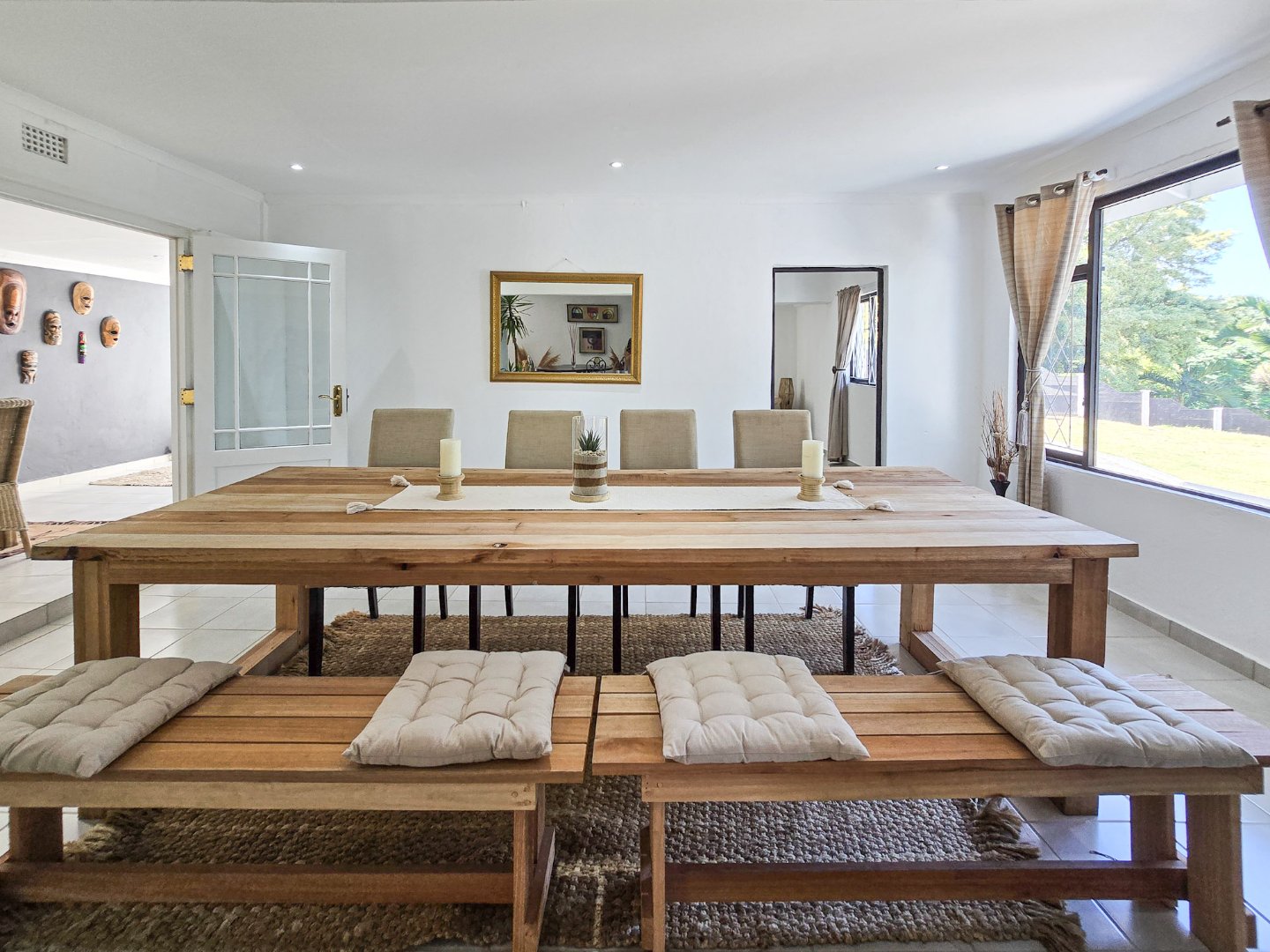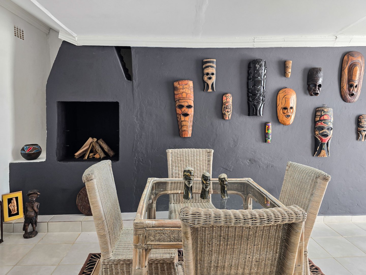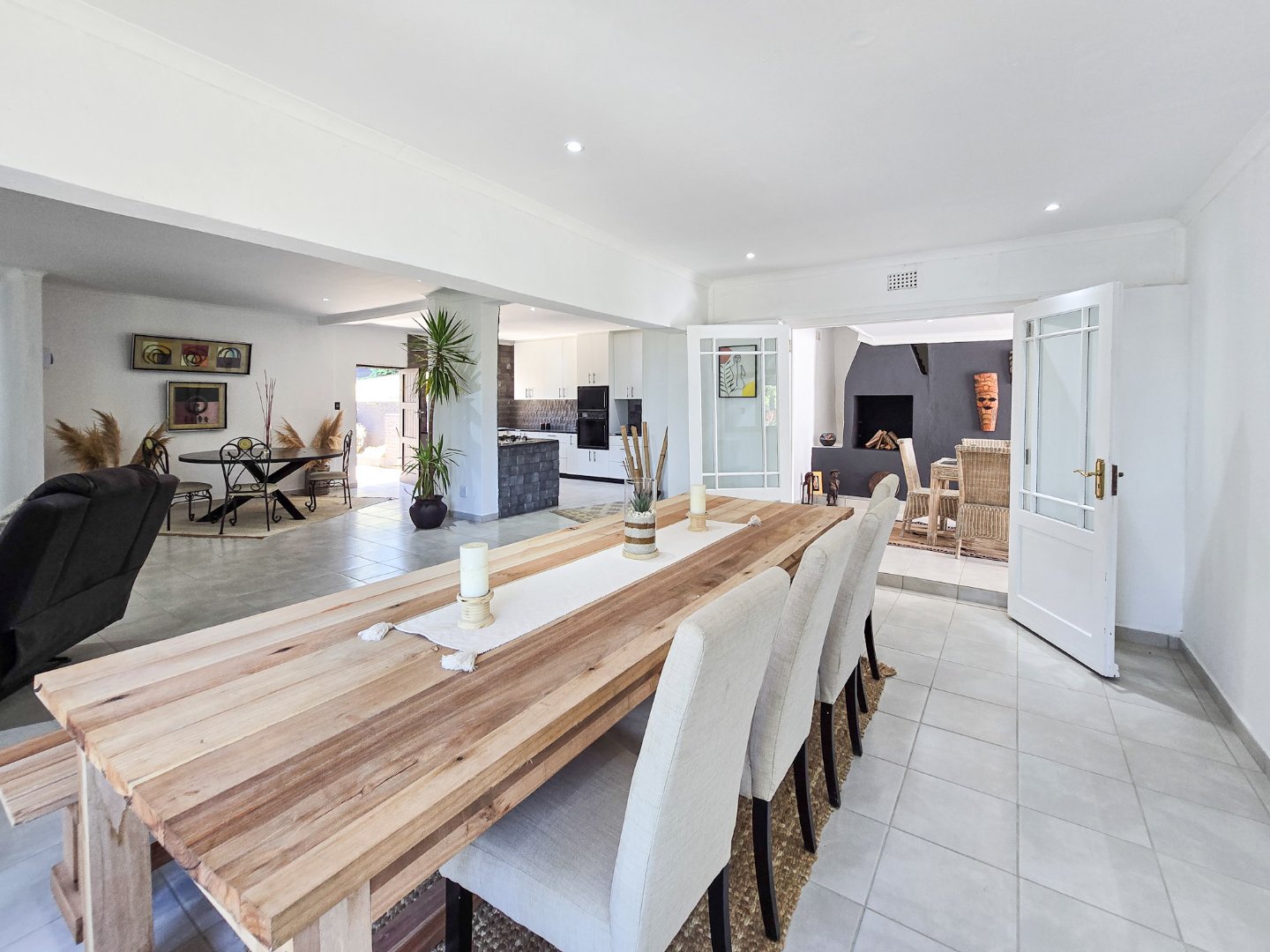 There are 4 bedrooms, two of which boasts ensuites. The one bedroom can easily serve as a cozy lounge, ideal for relaxing or hosting friends. This bedroom is currently used as a small lounge as there is no built-in cupboards. The large living area can accommodate two dining room tables, making it perfect for large family gatherings.