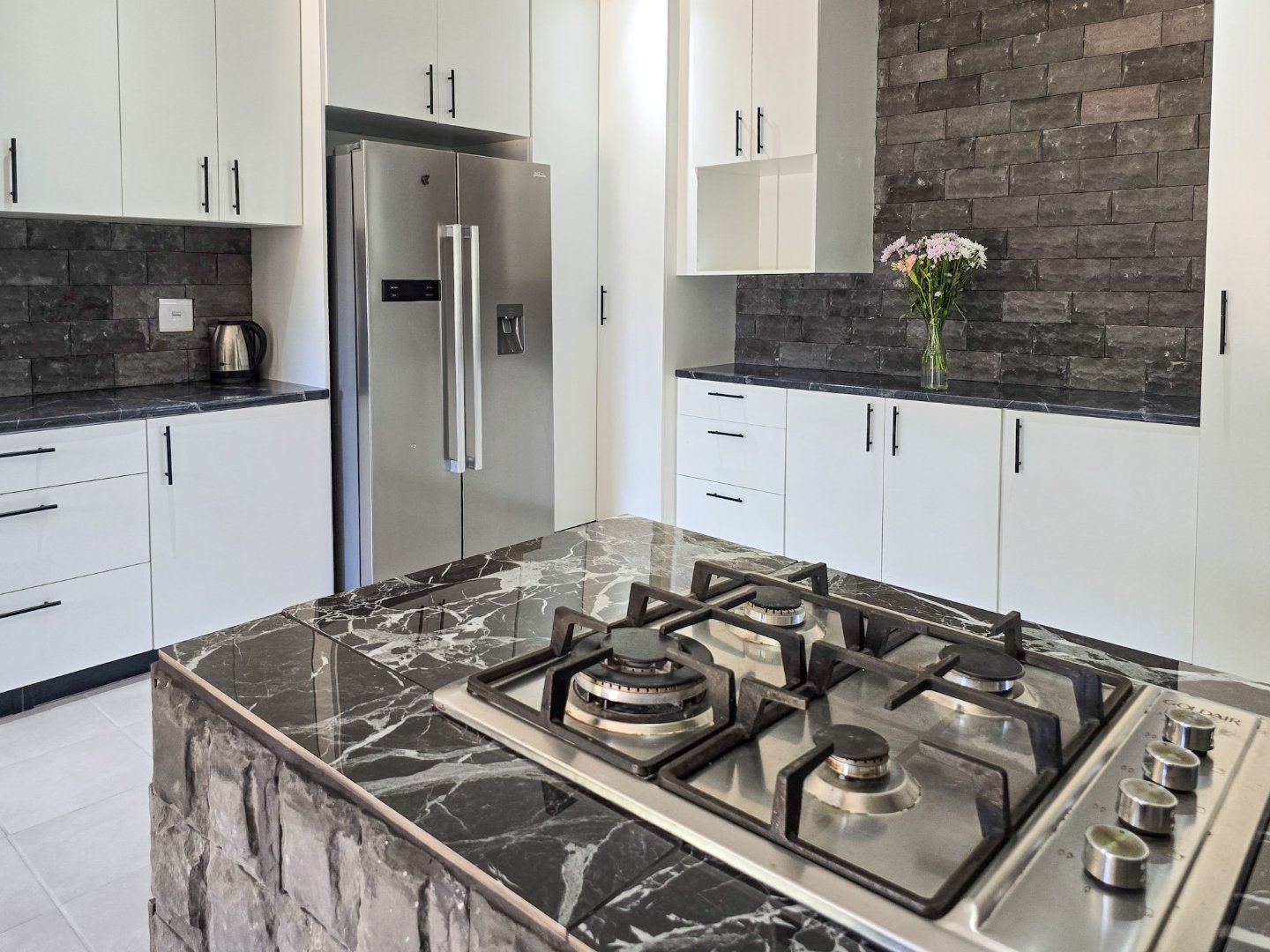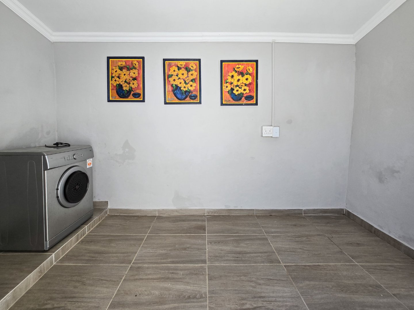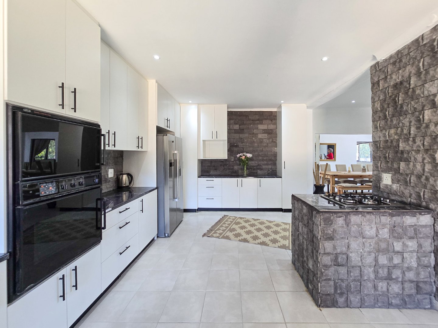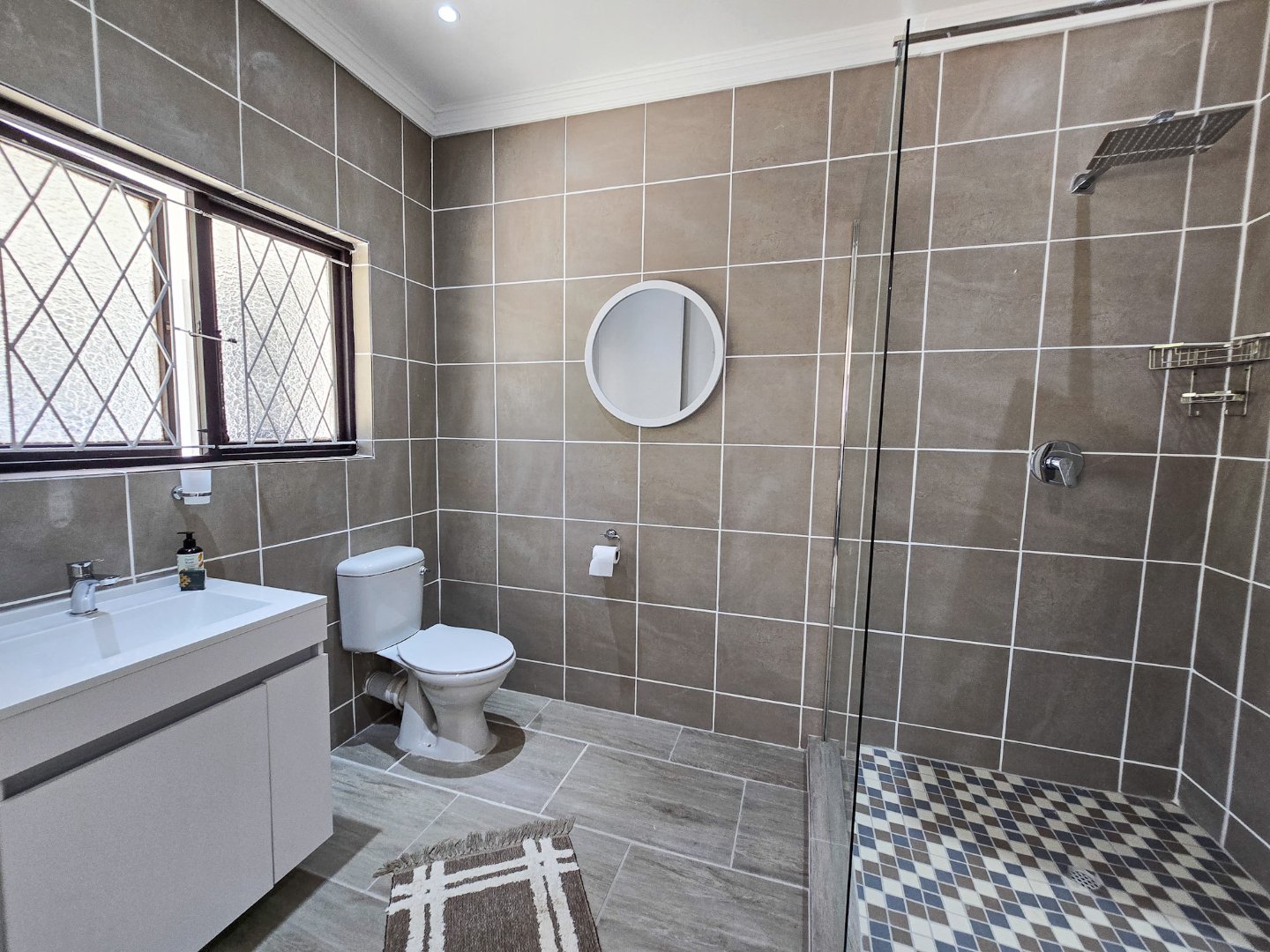 There are 4 bedrooms, two of which boasts ensuites. The one bedroom can easily serve as a cozy lounge, ideal for relaxing or hosting friends. This bedroom is currently used as a small lounge as there is no built-in cupboards. The large living area can accommodate two dining room tables, making it perfect for large family gatherings.