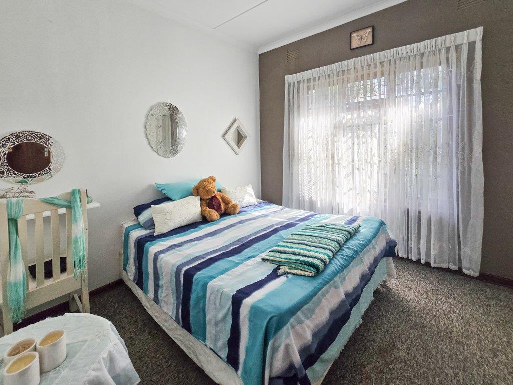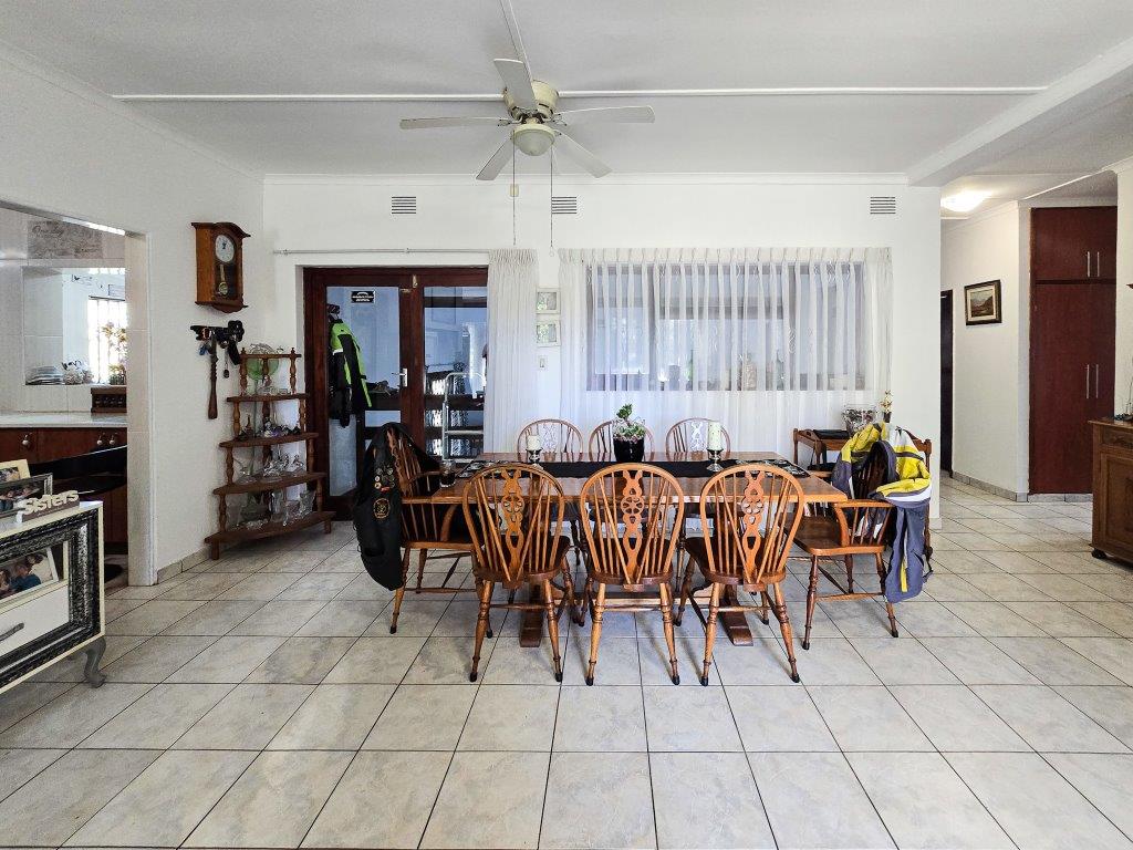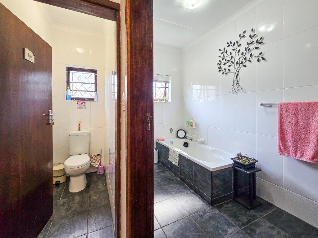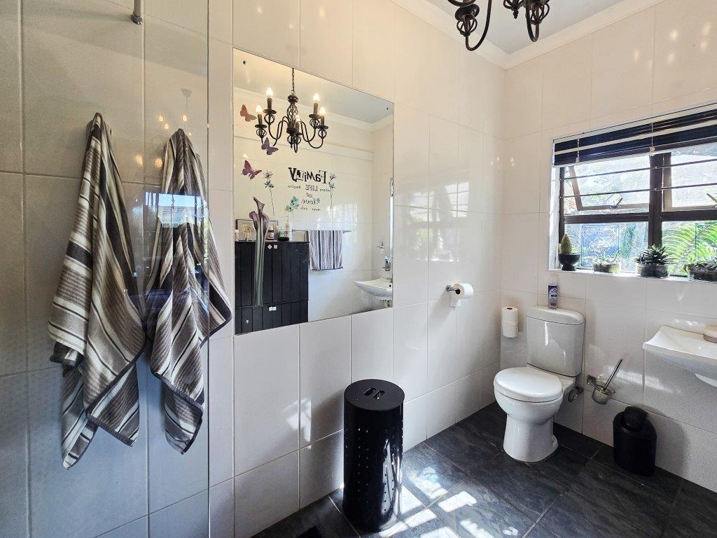 The main bedroom is a real statement, complete with a chandelier, sliding doors to a private patio, and a luxurious full en-suite bathroom that also features a chandelier for that extra touch of glamour. Down the passage, a family bathroom with a bath and basin, plus a separate toilet, serves the two additional spacious bedrooms.