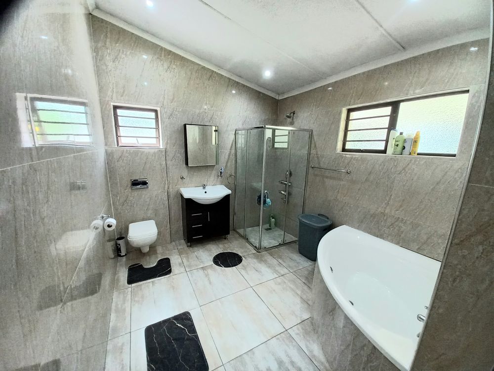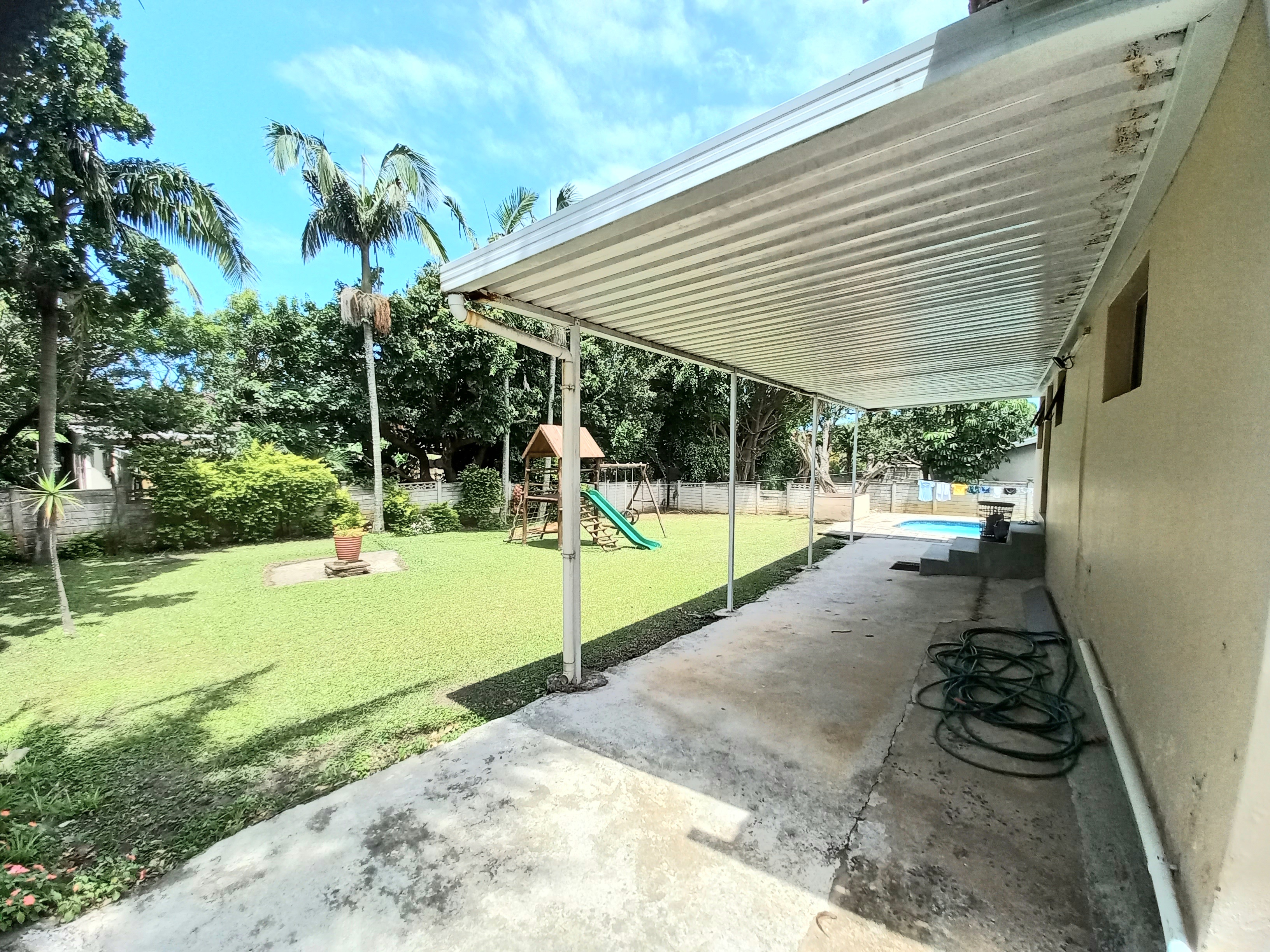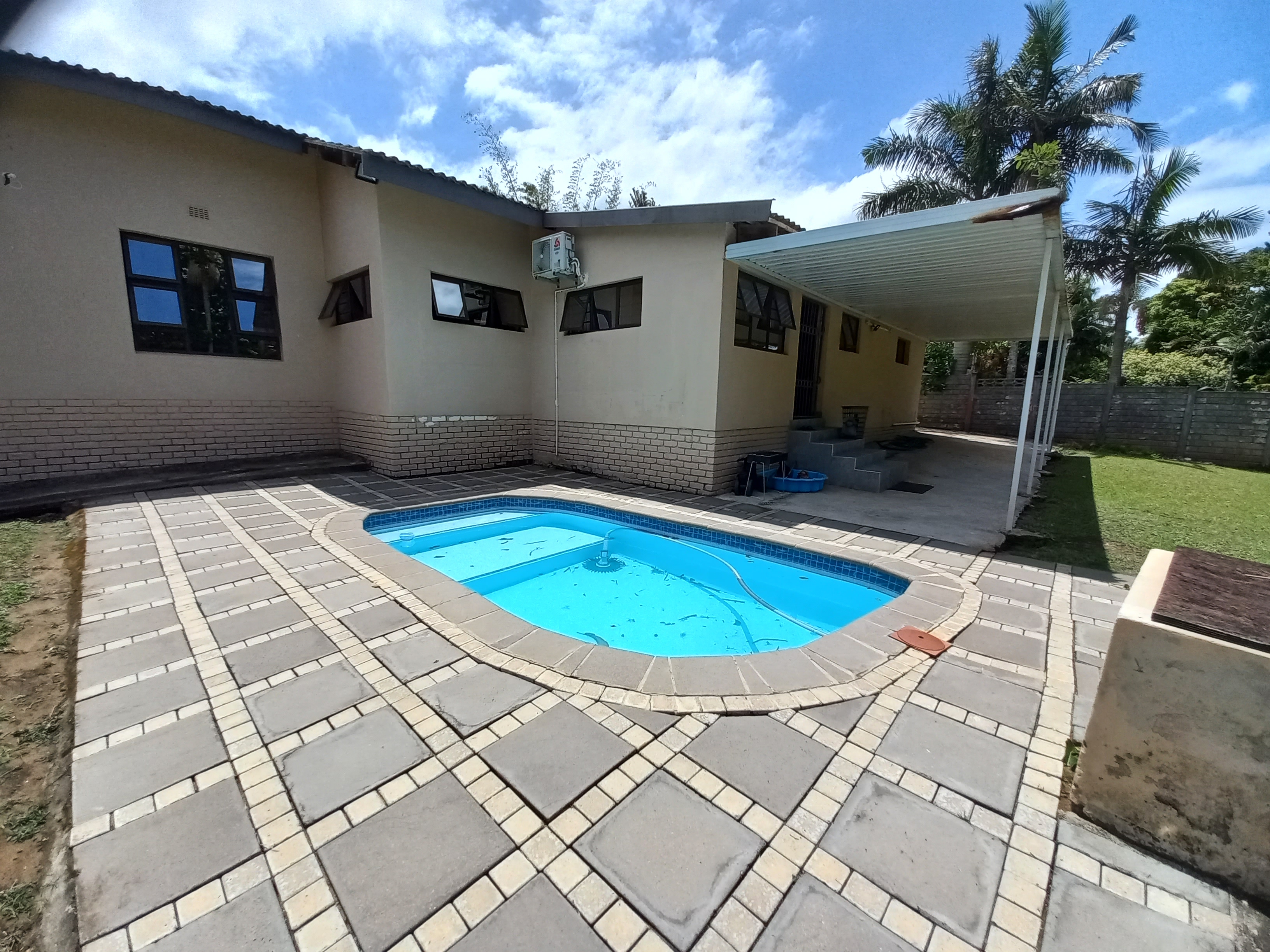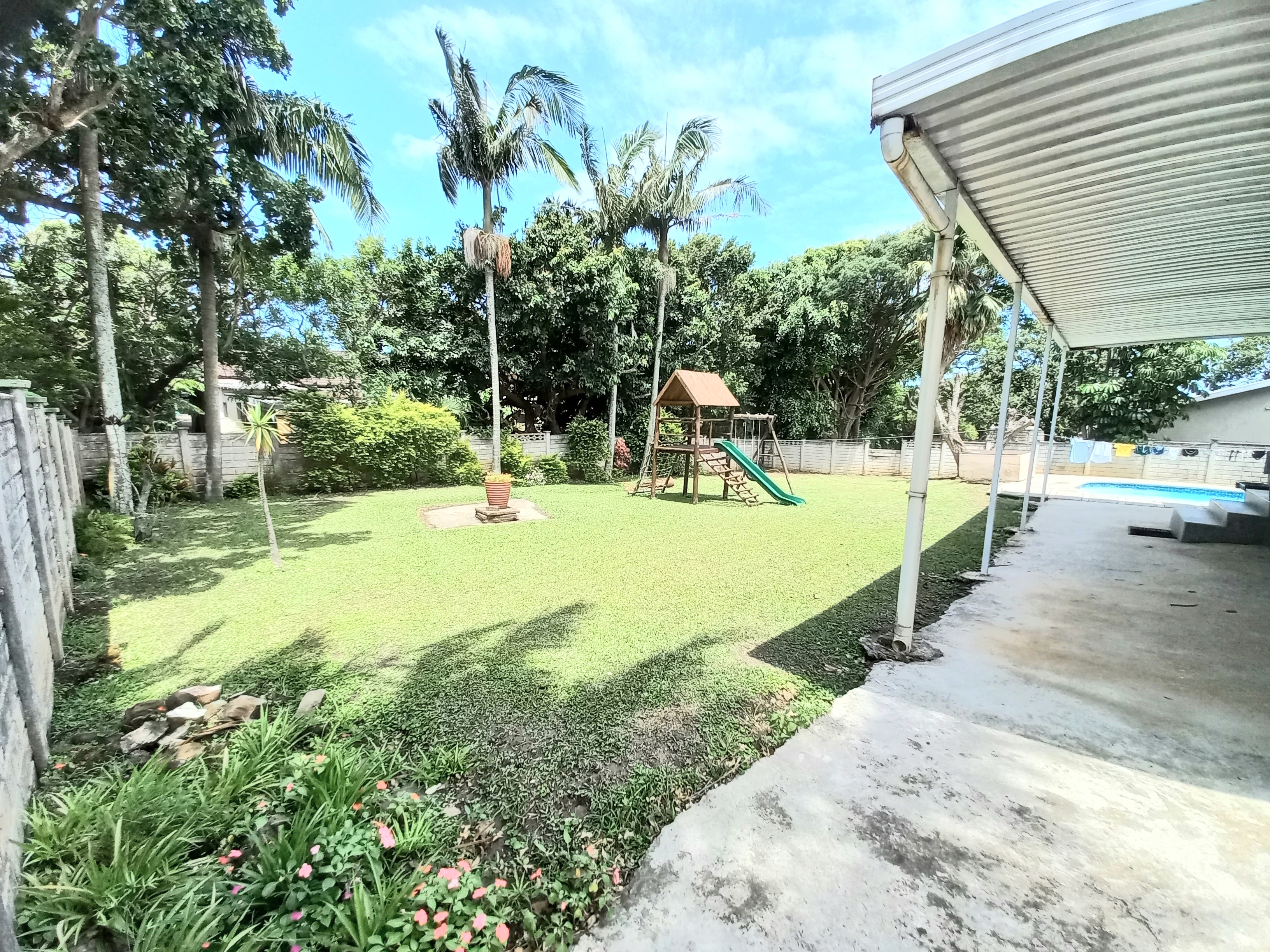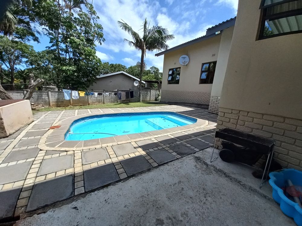 Beautiful 4 - bedroom, 3 bathroom home offering modern living at its best. The spacious main bedroom features ample built-in cupboards and a luxurious en-suite bathroom with a corner bath and shower. The second bedroom also boasts its own en-suite, perfect for guests or family convenience. This home offers a sleek, fully tiled modern interior with a stylish kitchen flowing seamlessly into the dining area and lounge - ideal for entertaining. Air conditioning in the main bedroom and lounge ensures year - round comfort. Security and practicality are well catered for with an alarm system, aluminium doors and windows throughout, burglar bars, security gates, and a fully walled year. The double tiled garage includes a toilet, basin, and shower for added functinality. Outside, enjoy a neat garden with plenty of space for kids and pets, a wooden jungle gym, and a sparkling pool - perfect for family living. Ideally situated in the sought - after Shelly Beach Area