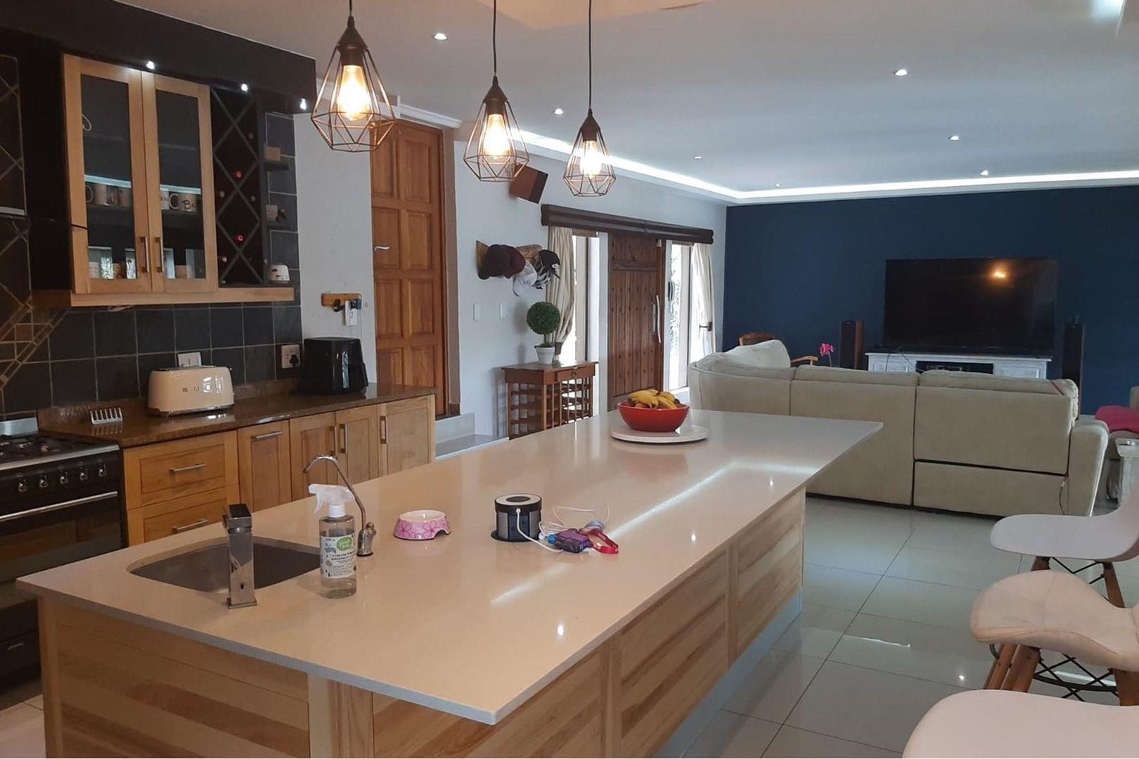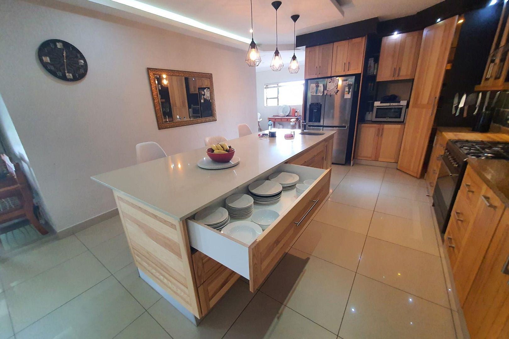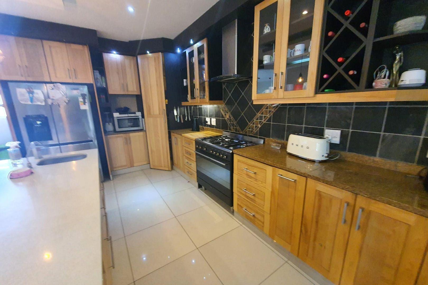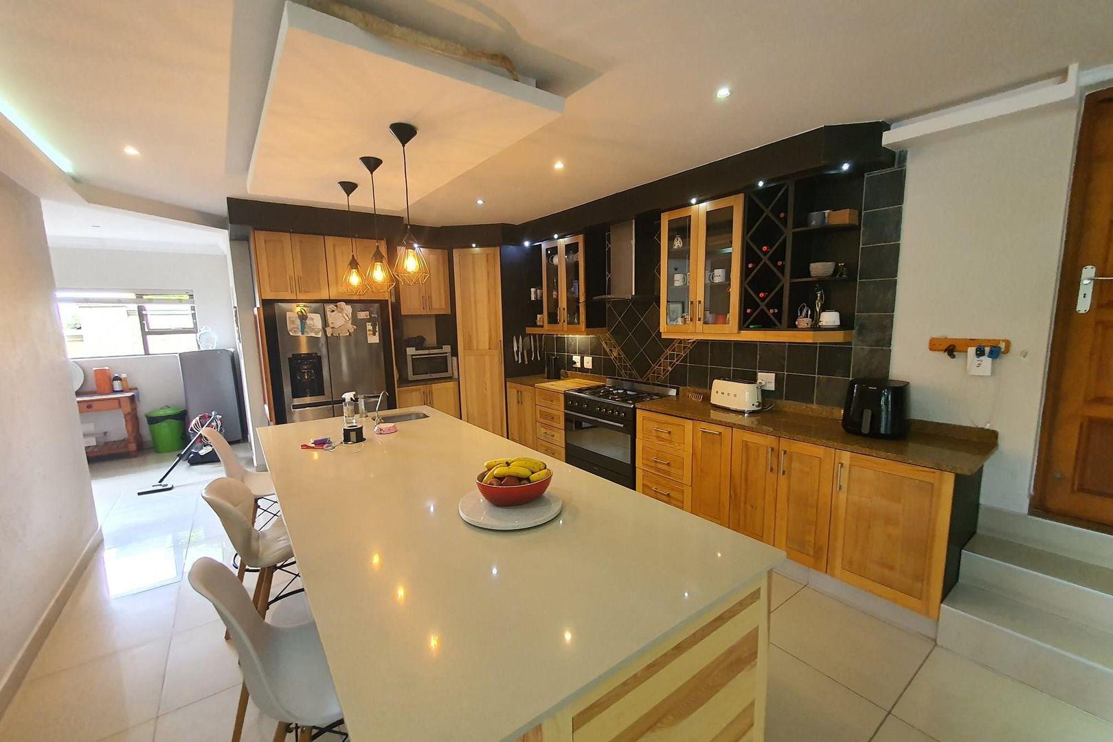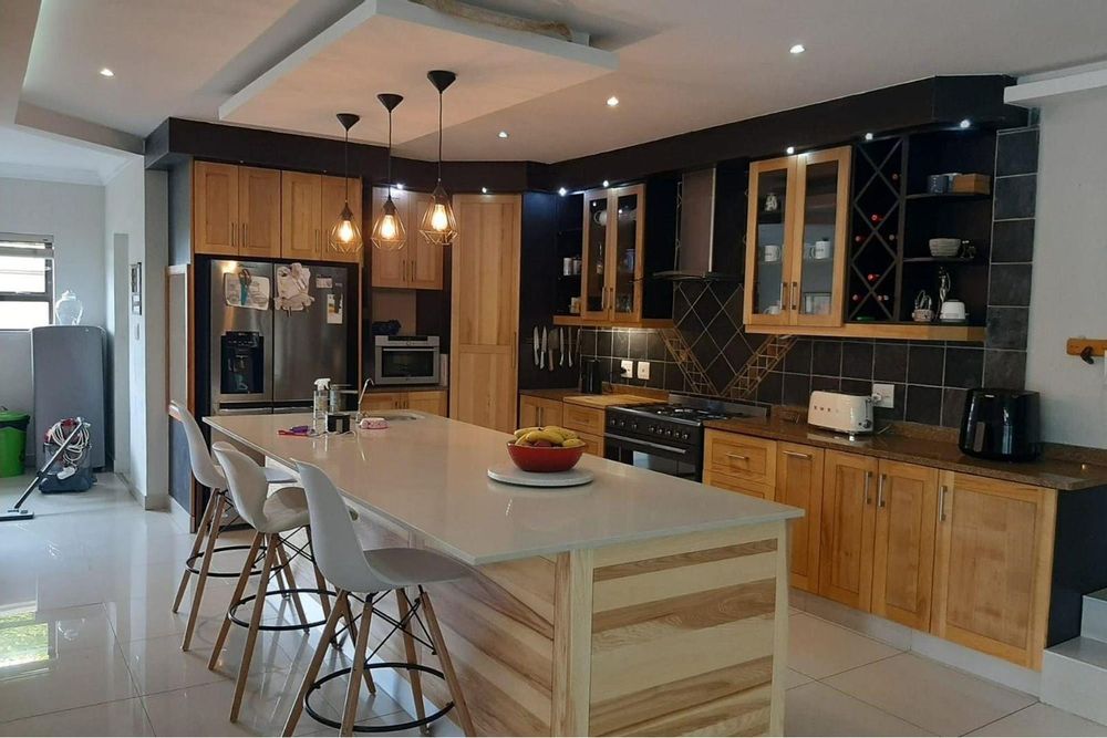 The expansive kitchen exudes luxury, featuring a central island with a Caesarstone top for dining and a prep basin with a tap. Well-appointed cupboards and beautiful granite countertops adorn the kitchen, complemented by a separate scullery and wash-up area also finished with granite tops.