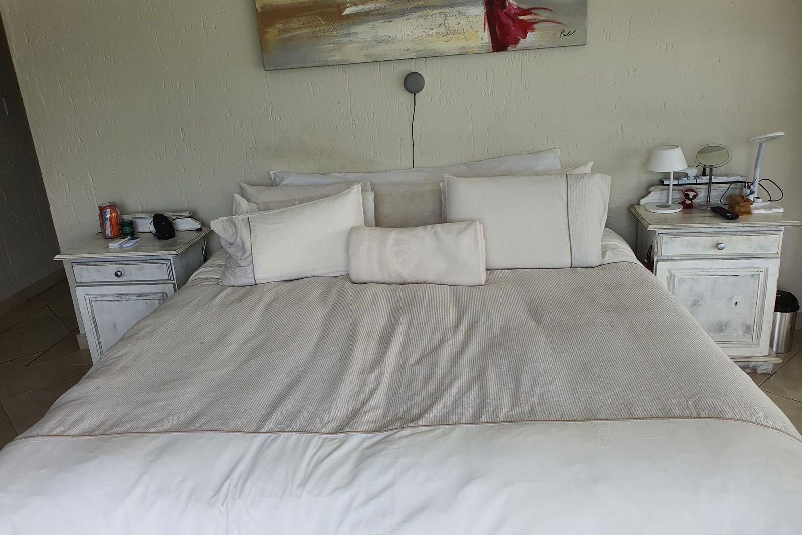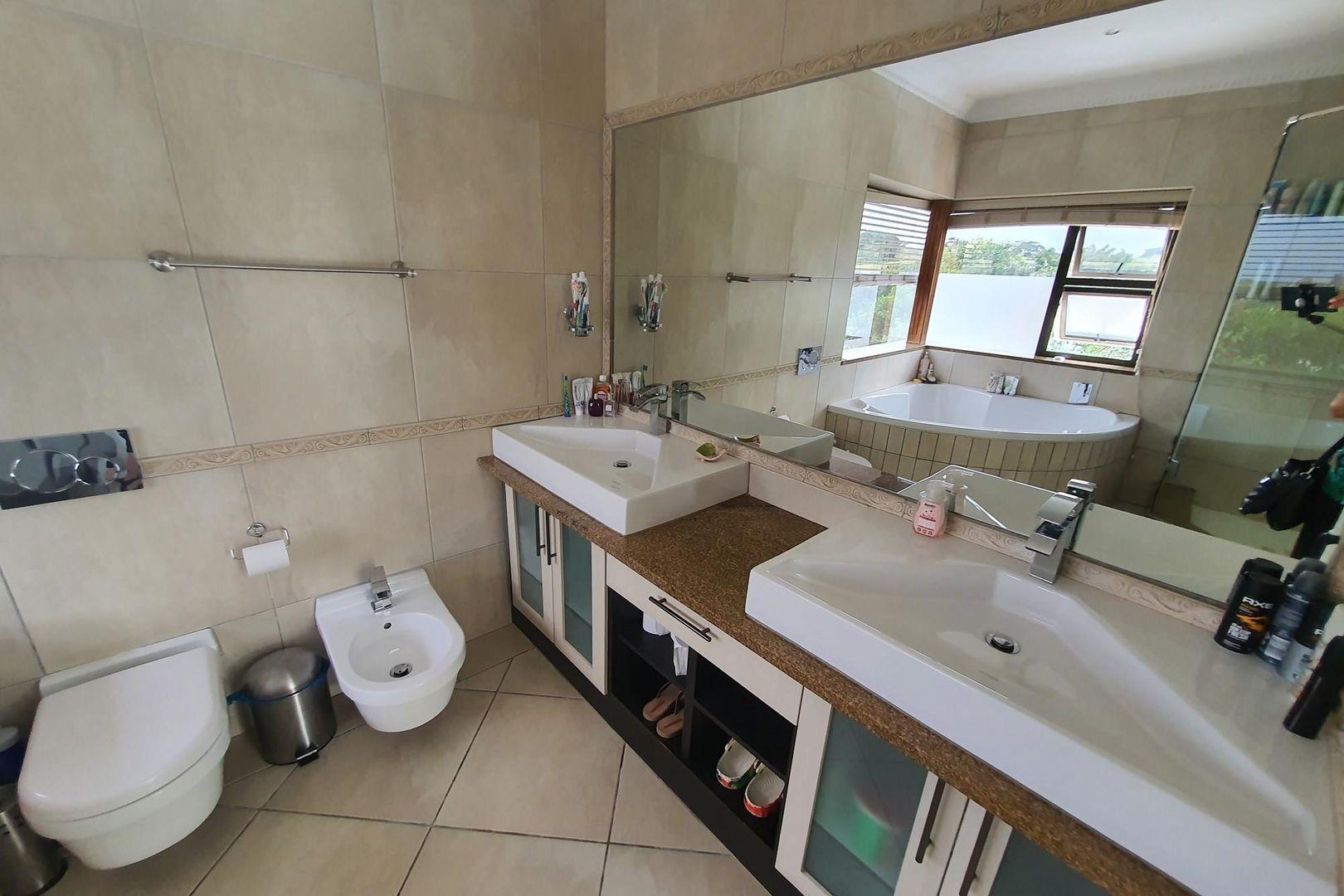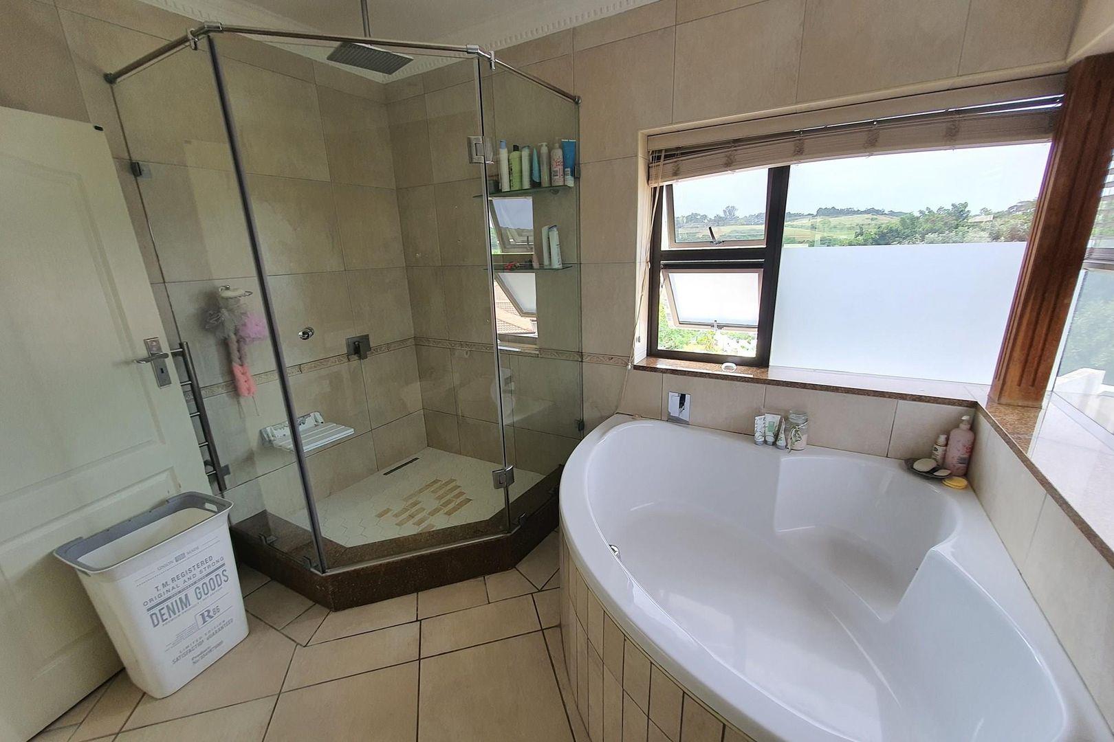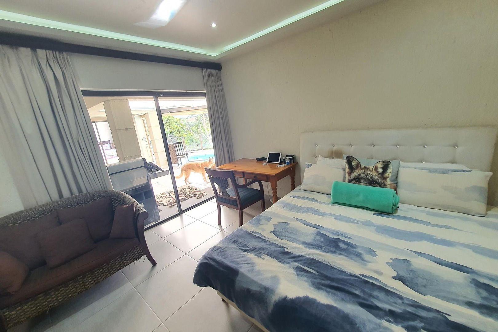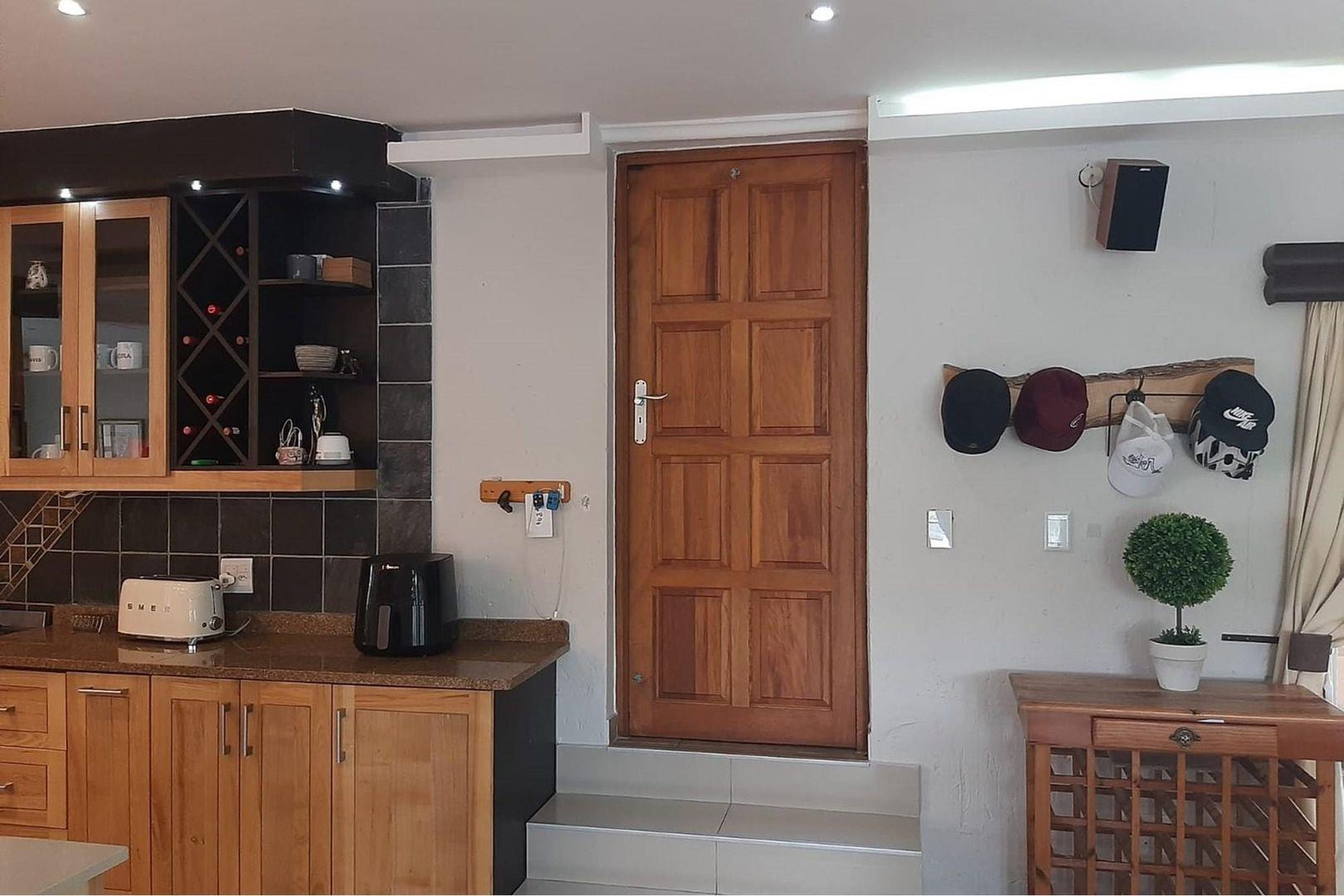 The expansive kitchen exudes luxury, featuring a central island with a Caesarstone top for dining and a prep basin with a tap. Well-appointed cupboards and beautiful granite countertops adorn the kitchen, complemented by a separate scullery and wash-up area also finished with granite tops.