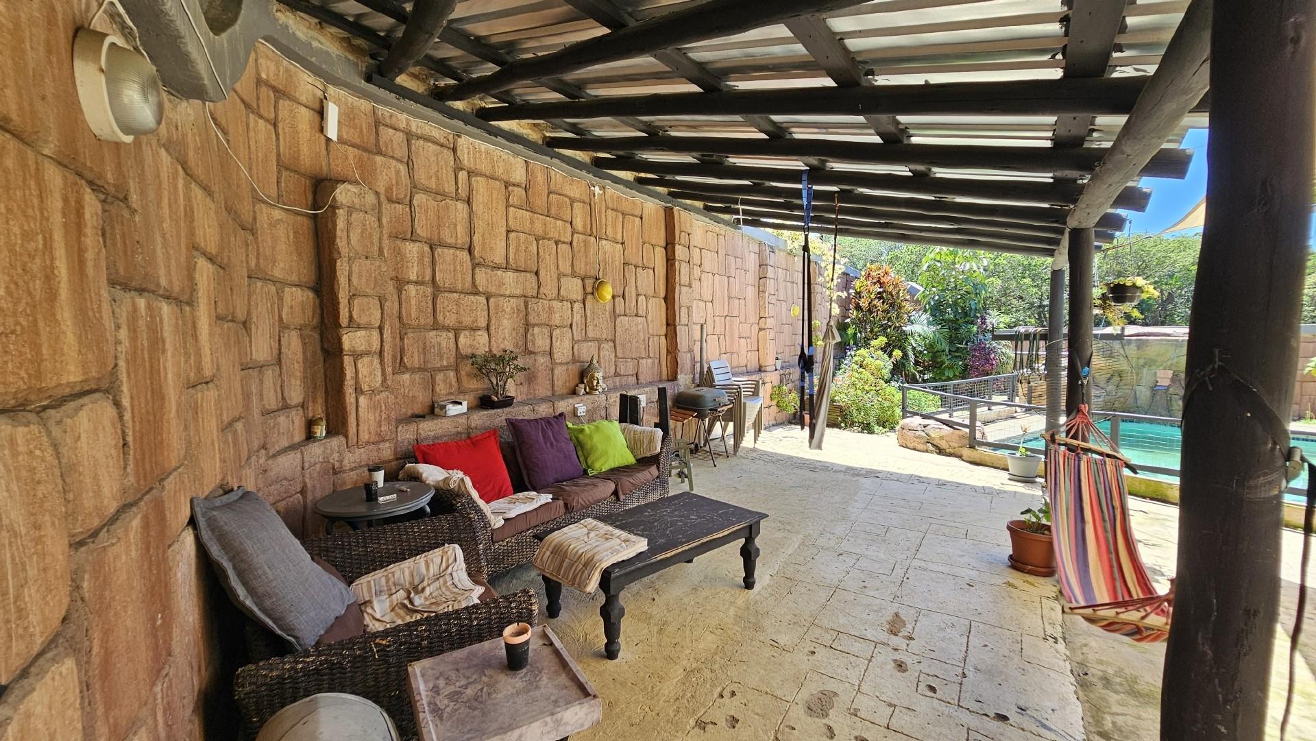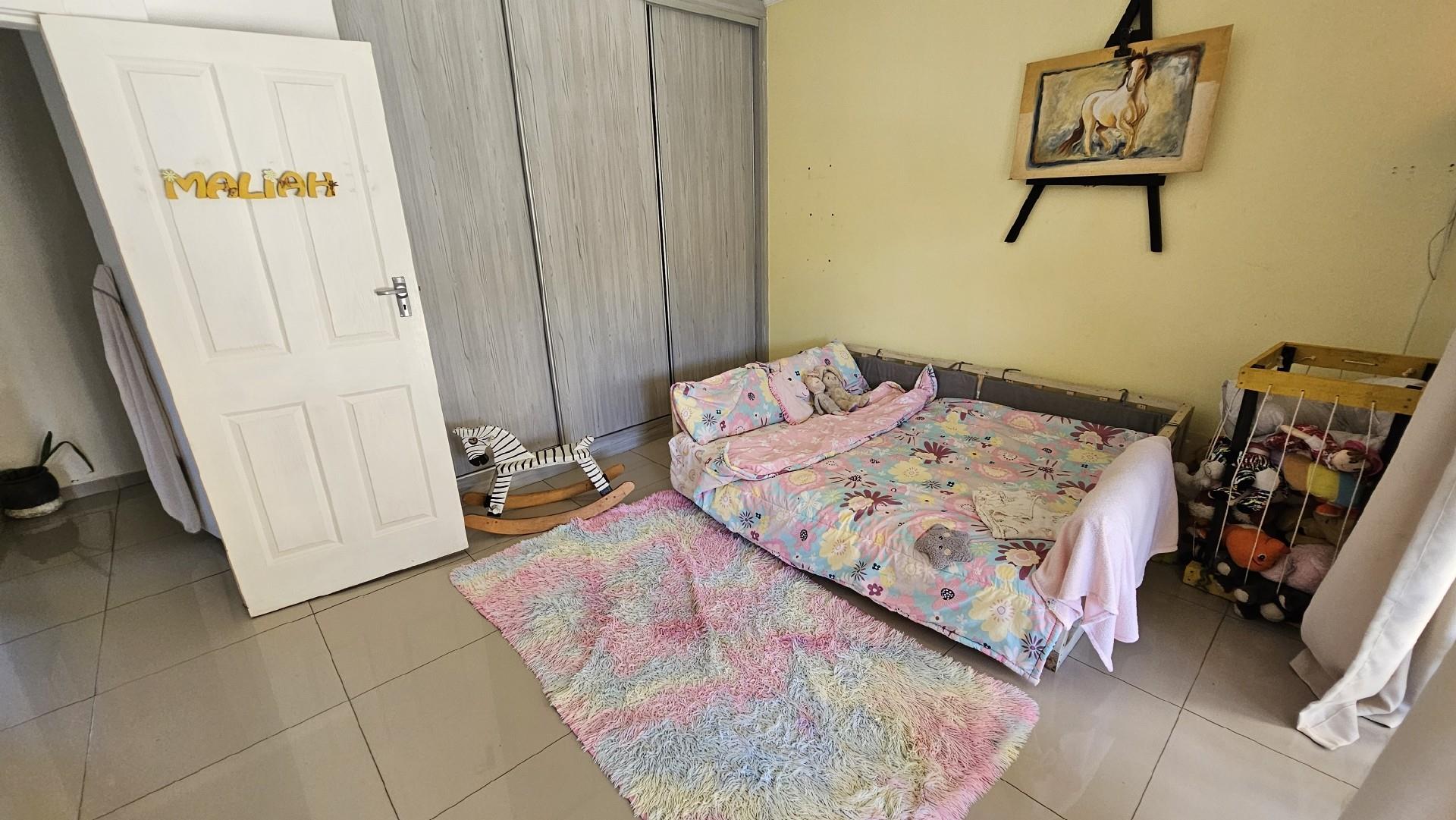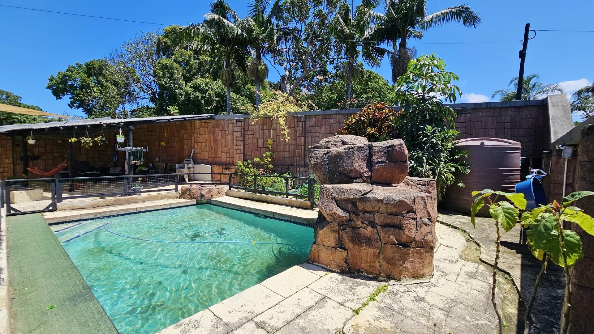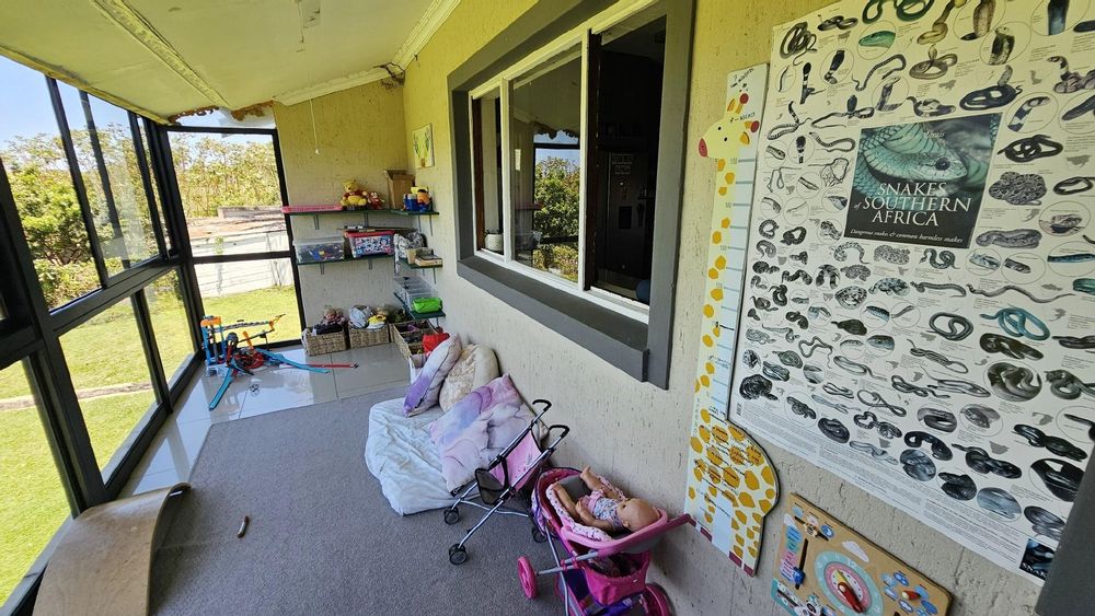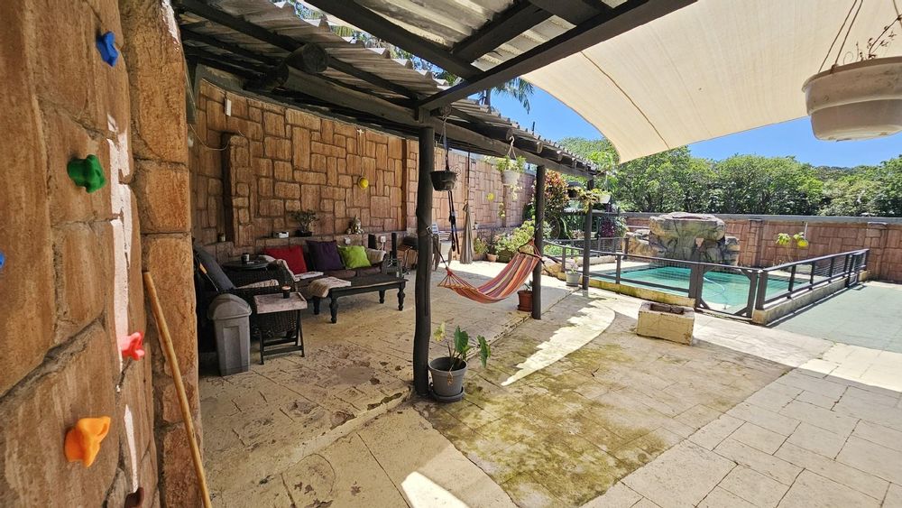 The open plan design of this home seamlessly connects the kitchen to a dining area, a comfortable lounge area and a children`s playroom/sunroom creating beautiful flow. This beautiful space has three spacious bedrooms, 2 of which are fitted with ensuite bathrooms. Each bedroom has ample wardrobe space and two of the bedrooms have direct patio access. The home also has additional office space perfect for a home run business, although it could also double up as a flatlet with a few modifications. Step outside to discover a private oasis, the lush garden and crisp blue swimming pool with a rock waterfall creates a tranquil escape. A covered patio makes this area ideal for outdoor dining and entertaining. The property is also totally walled and all entrance points have trellidoors ensuring peace of mind. The home offers adequate parking as well as a double garage with roll up doors. The additional benefit of this property is that it offers staff quarters making it possible for staff to live in if need be. The home also offers a reserve water tank as well as a filtration system that filters the water before it goes into the tank or into the home.