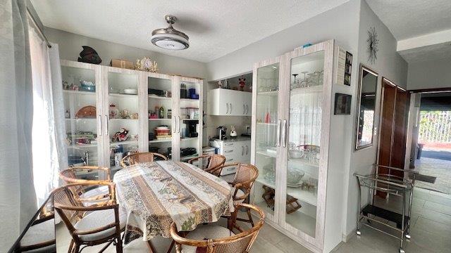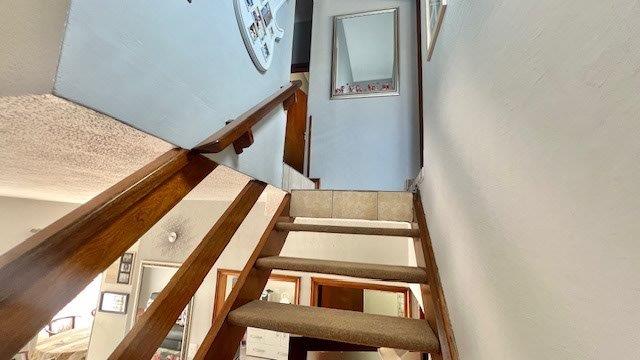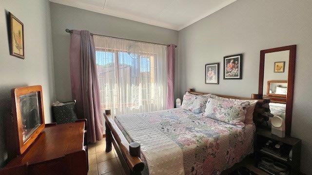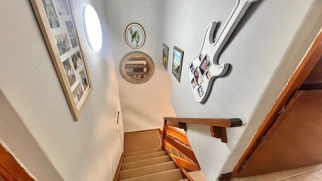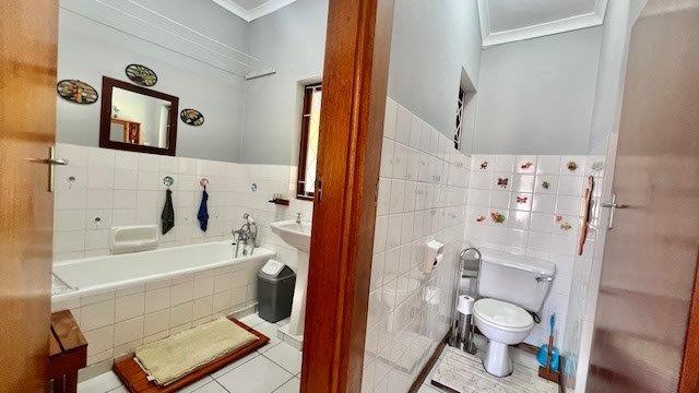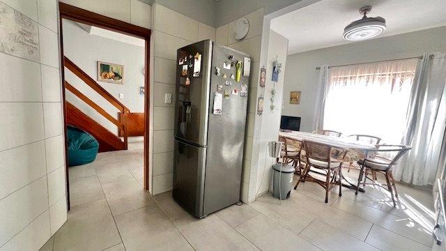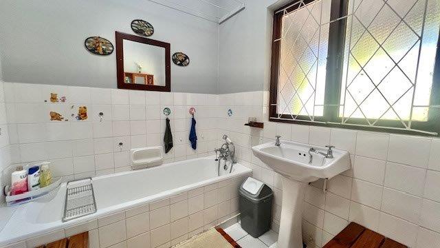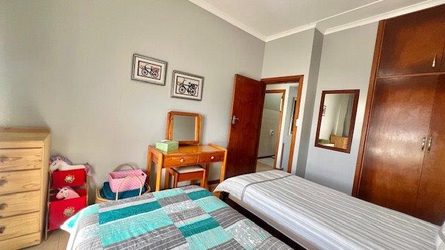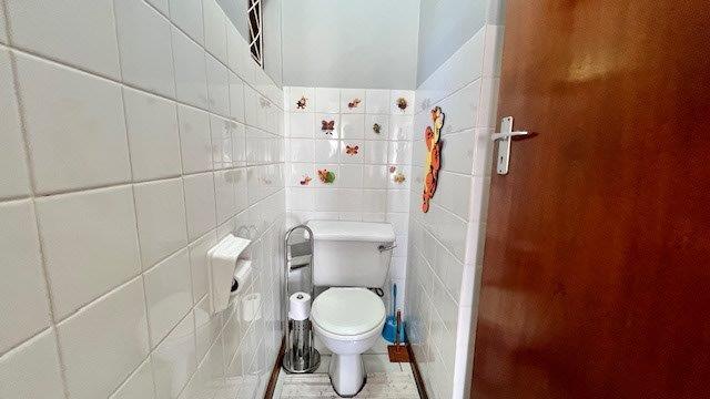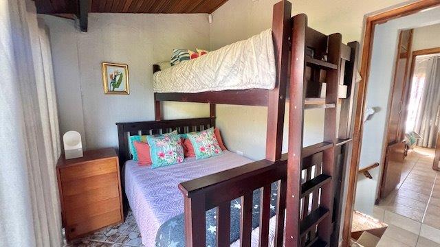 Upstairs, you’ll find three bedrooms, all with built-in cupboards. One bedroom opens onto a balcony with a glimpse of the sea, while the others provide ample space for family or guests. This level has a bathroom with a bath and basin, along with a separate toilet, making it practical for everyday family living.