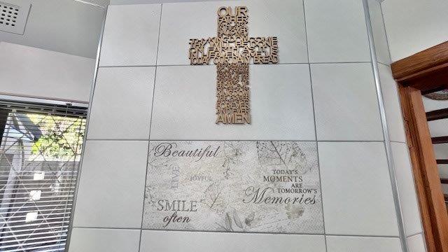 The lower level features a spacious open-plan lounge, dining area, and kitchen. The kitchen is beautifully finished with stylish cupboards and fitted with both a gas and electric stove—perfect for preparing meals with ease. The lounge flows out onto a private patio with a built-in braai, making it a great space for entertaining. This level also includes a guest bathroom for convenience, as well as an enclosed courtyard with a private outdoor shower. The tiled garage is plumbed for a washing machine.