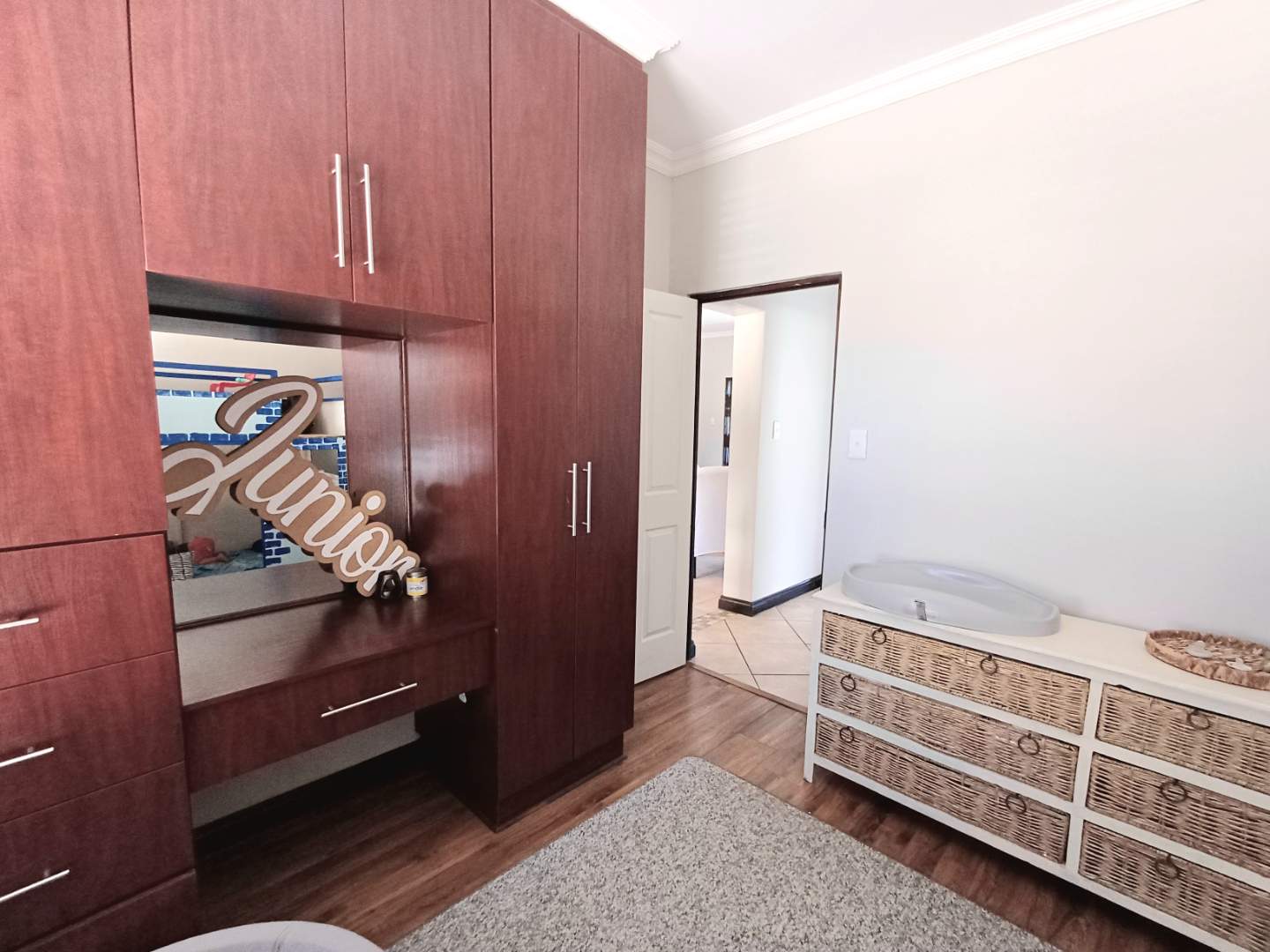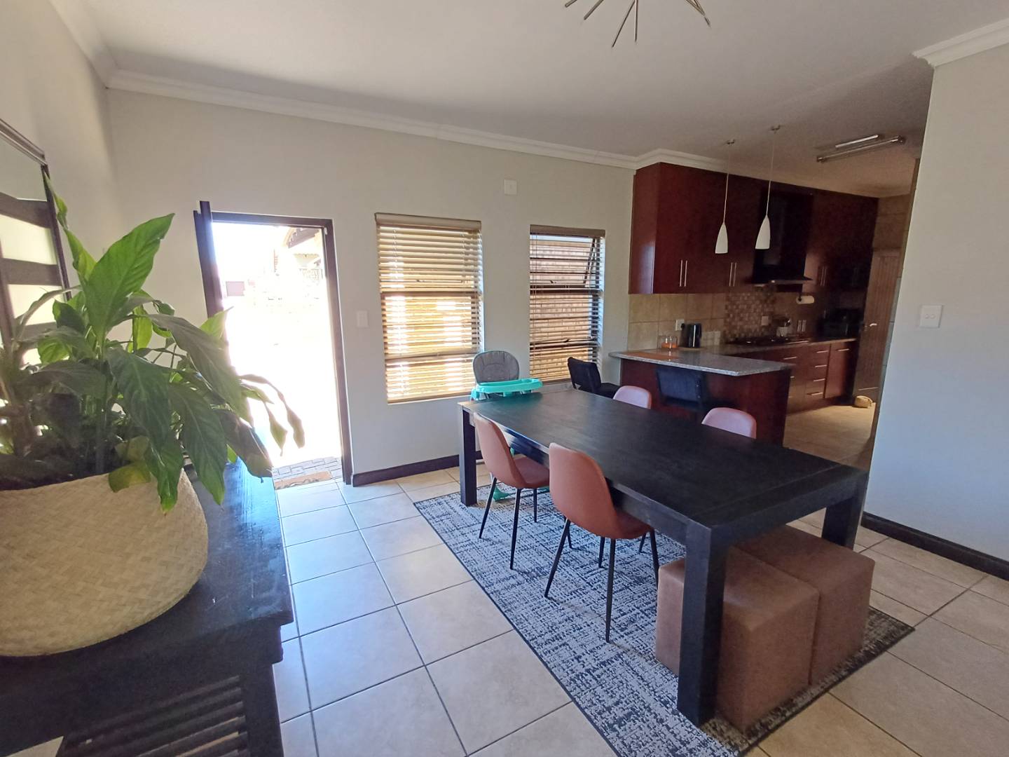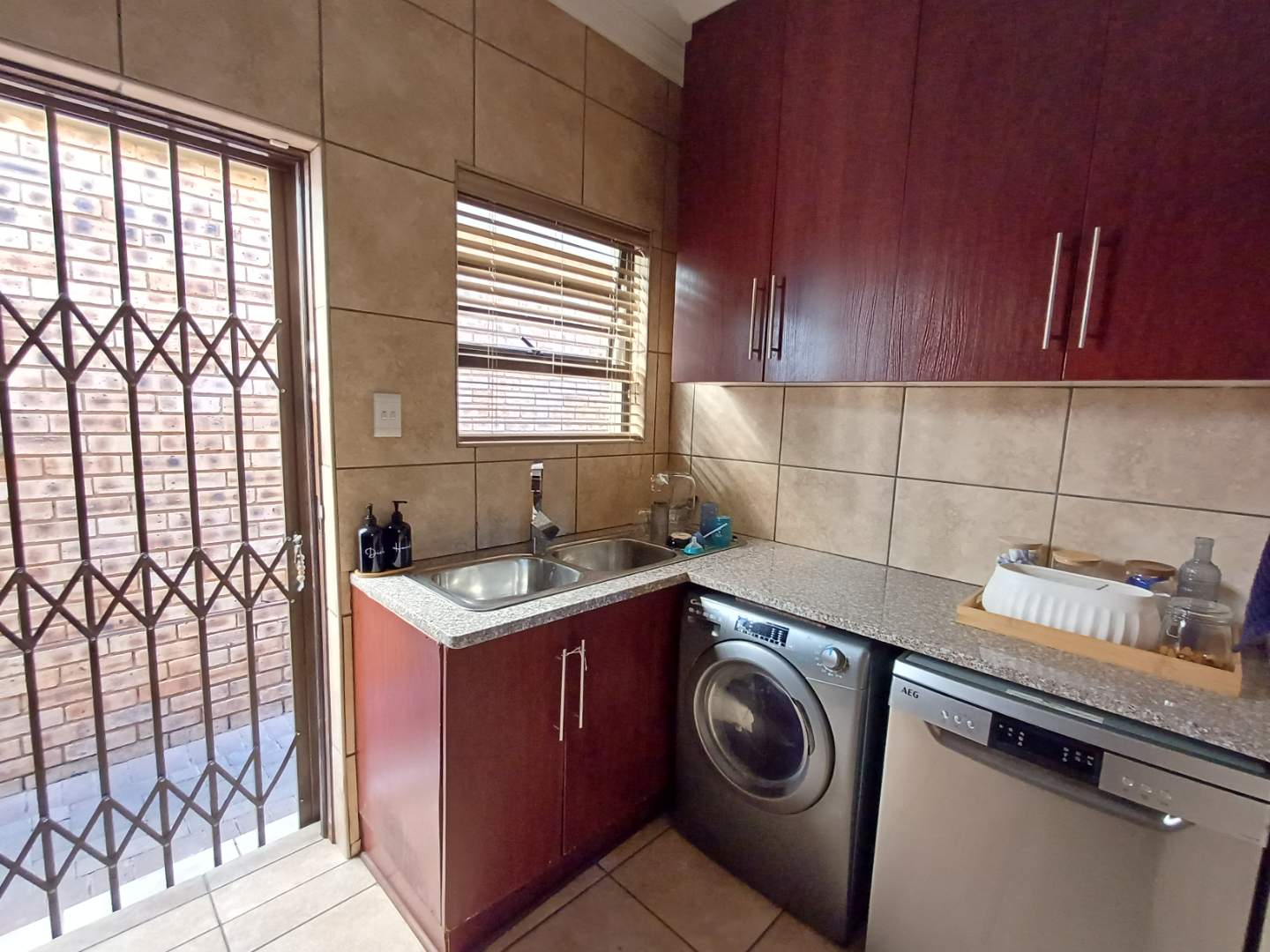 Outdoors is a covered, neatly tiled stoep with a build in braai overlooking the maintainable garden.