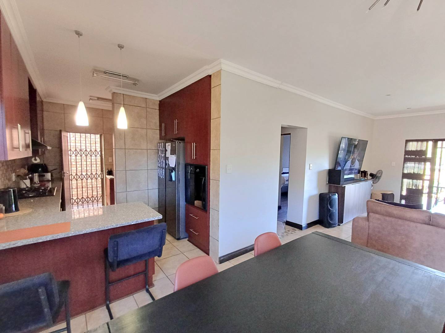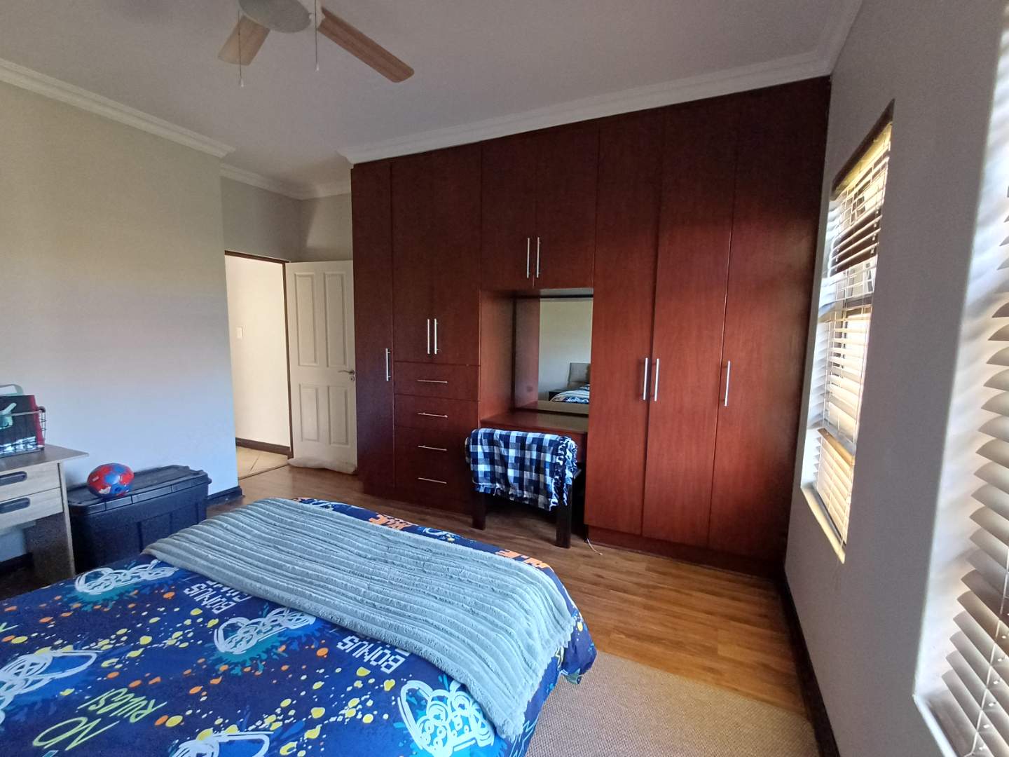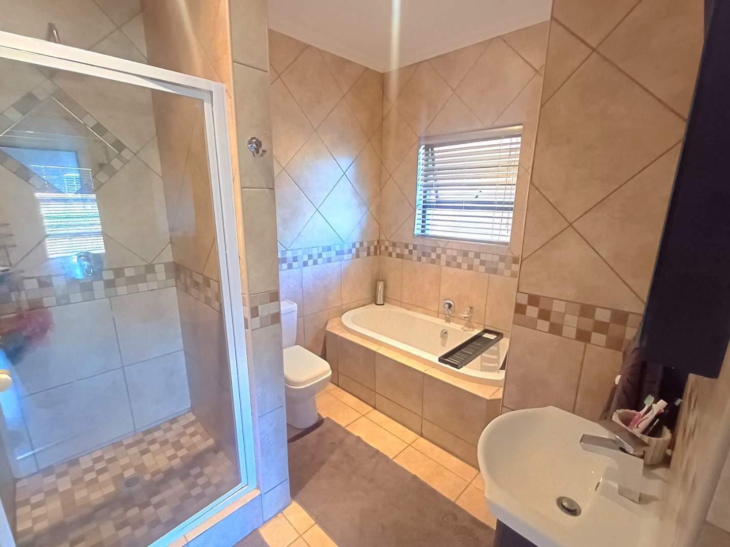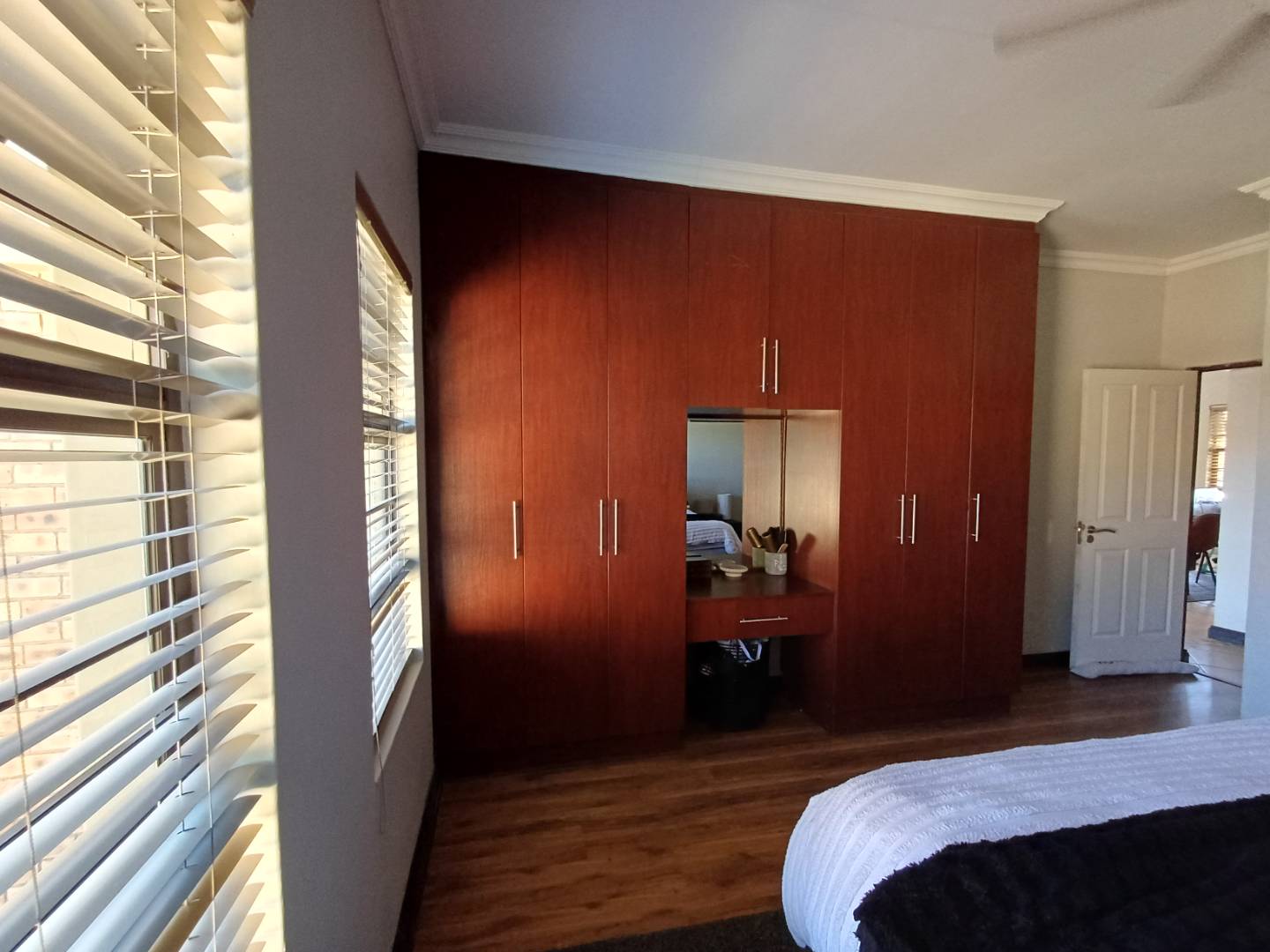 Outdoors is a covered, neatly tiled stoep with a build in braai overlooking the maintainable garden.