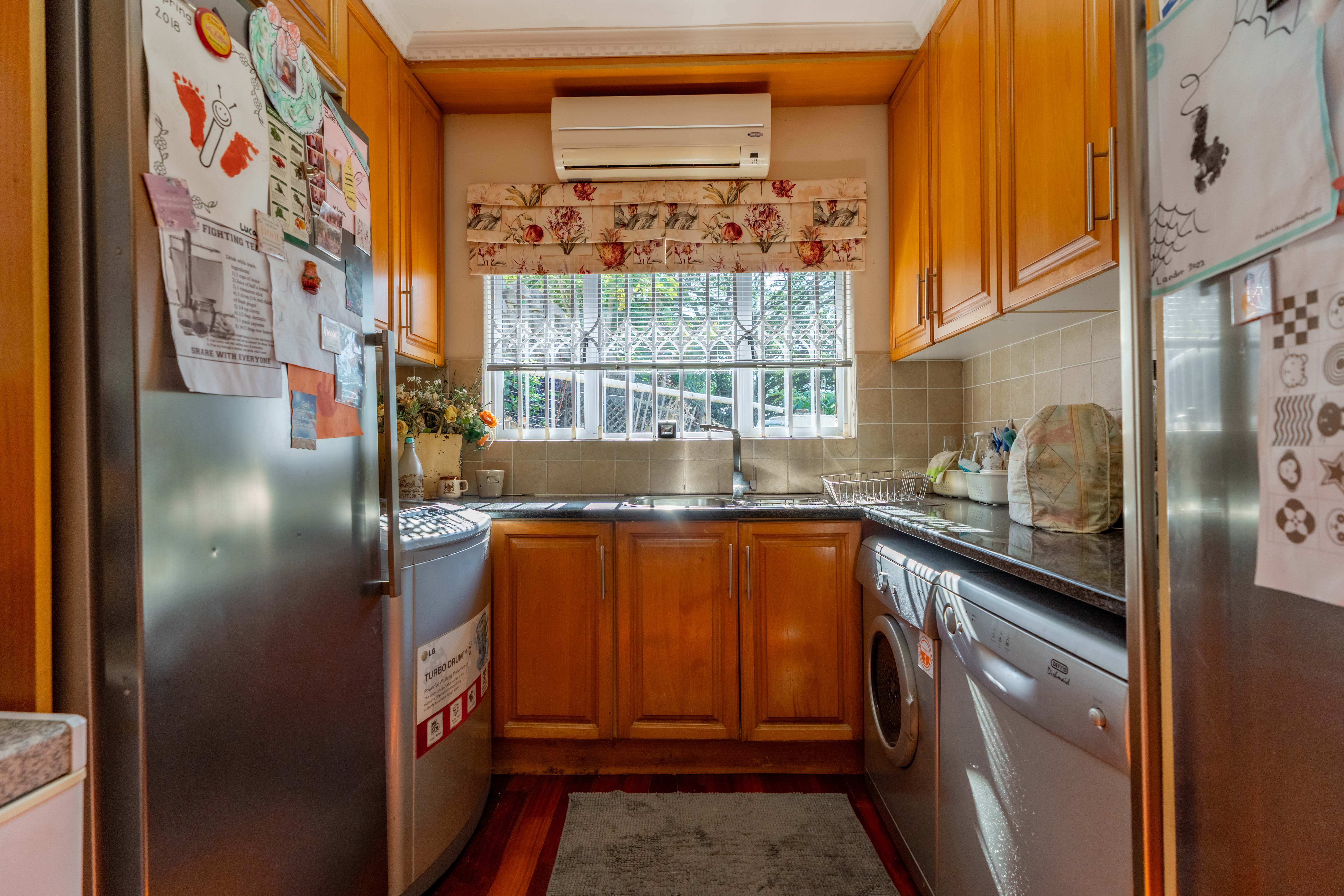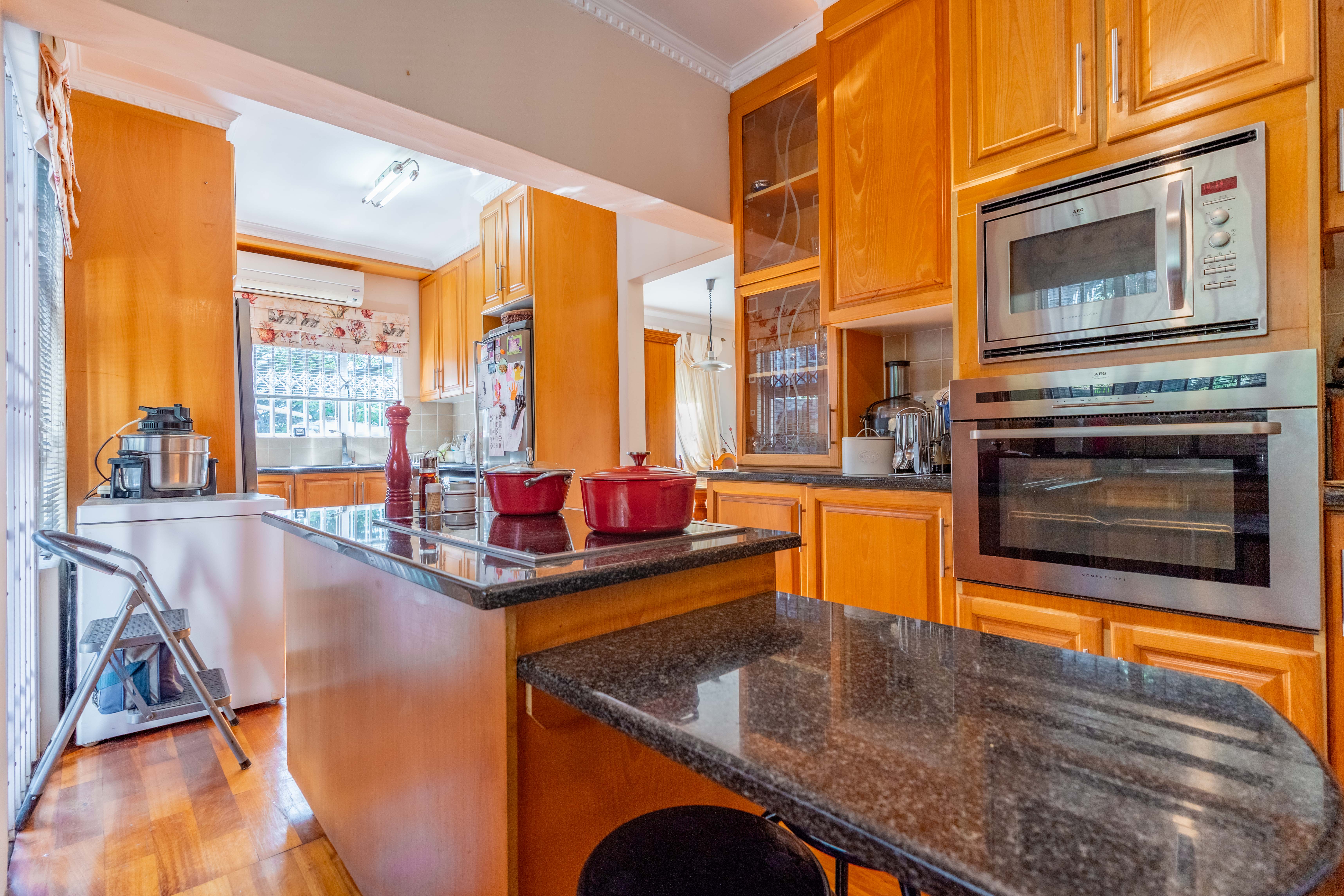 The heart of the home is a light-filled granite kitchen, featuring a centre-island, electric hob, oven, ample cupboard/counter space, and scullery/laundry facilities, which connects to a separate dining room perfect for memorable gatherings.