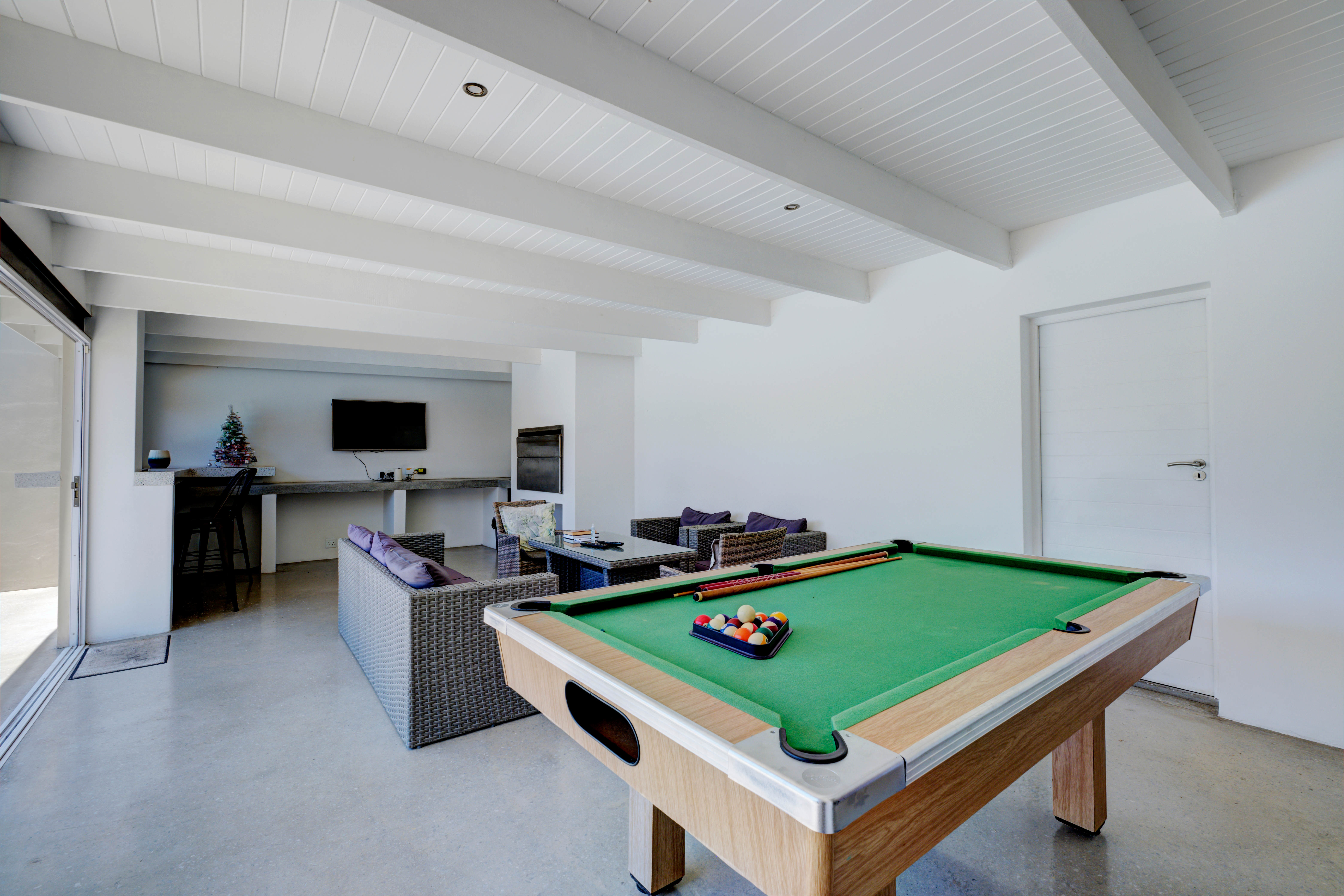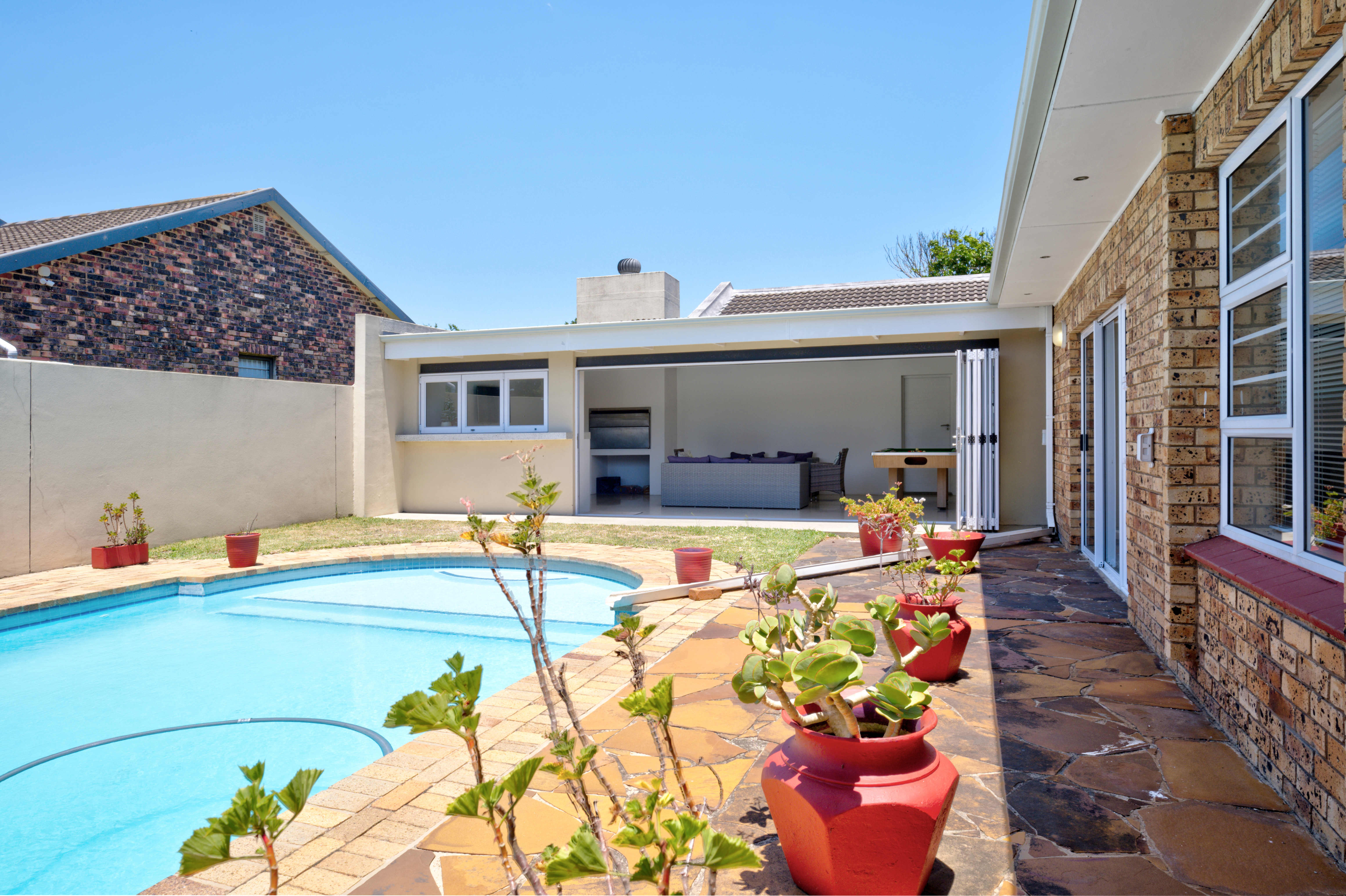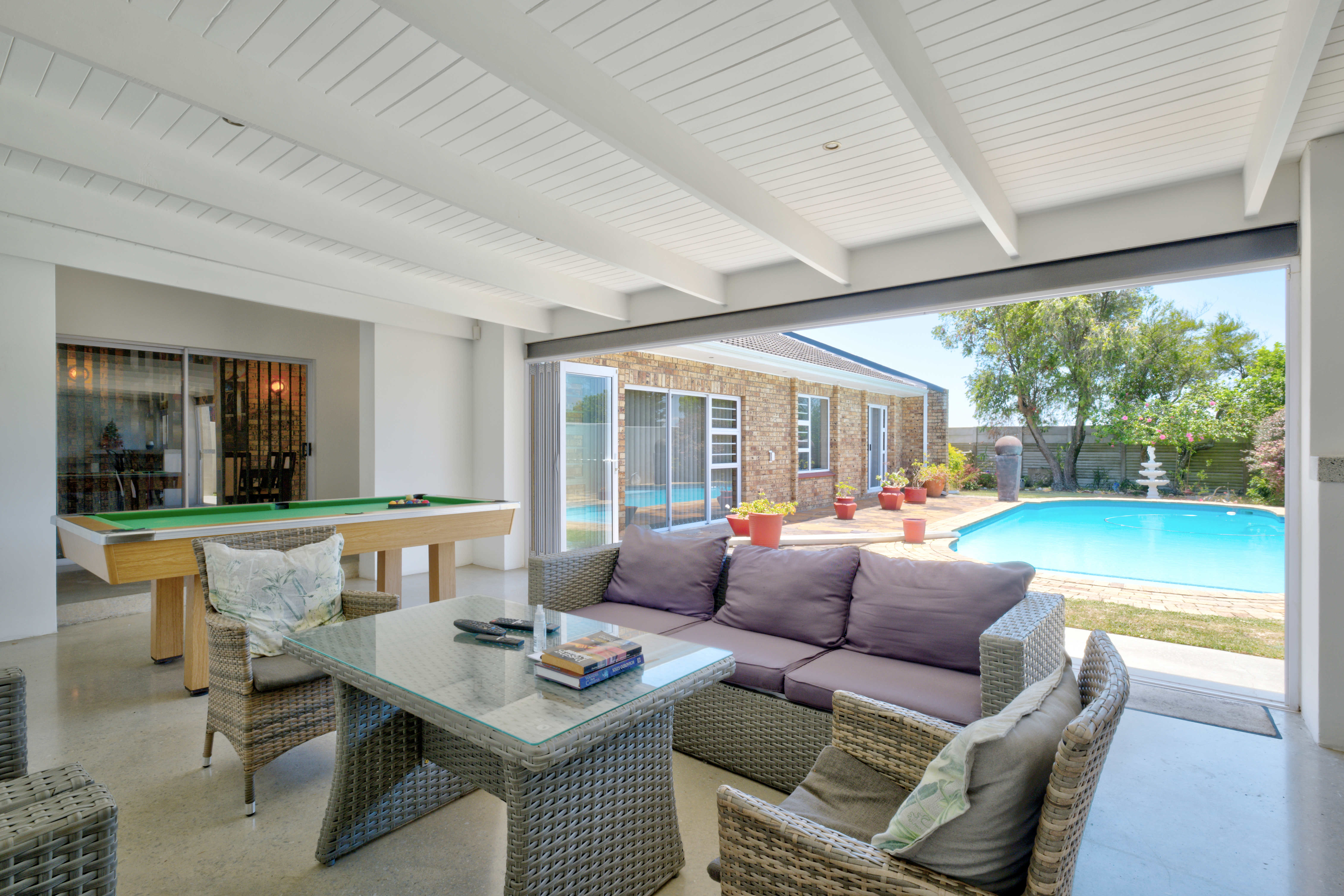 The entertainment area opens out to a sparkling swimming pool, making it ideal for relaxed family time and memorable gatherings.