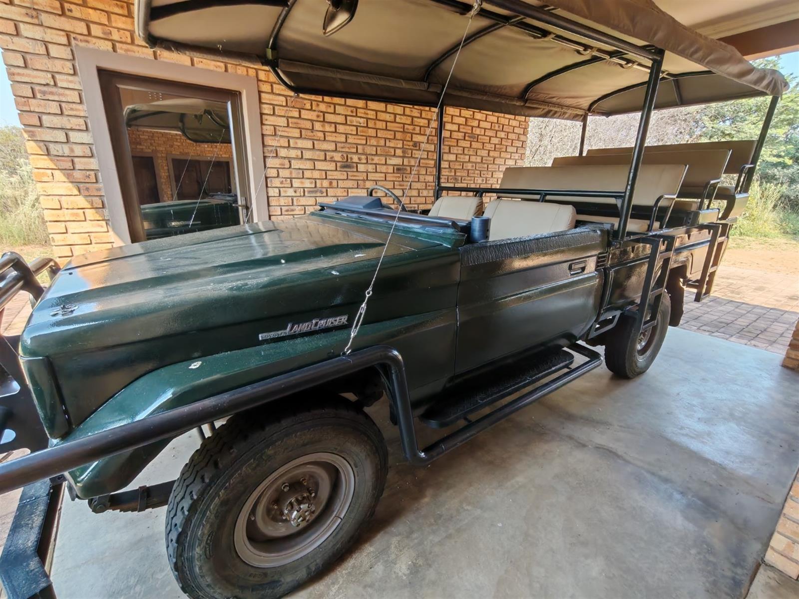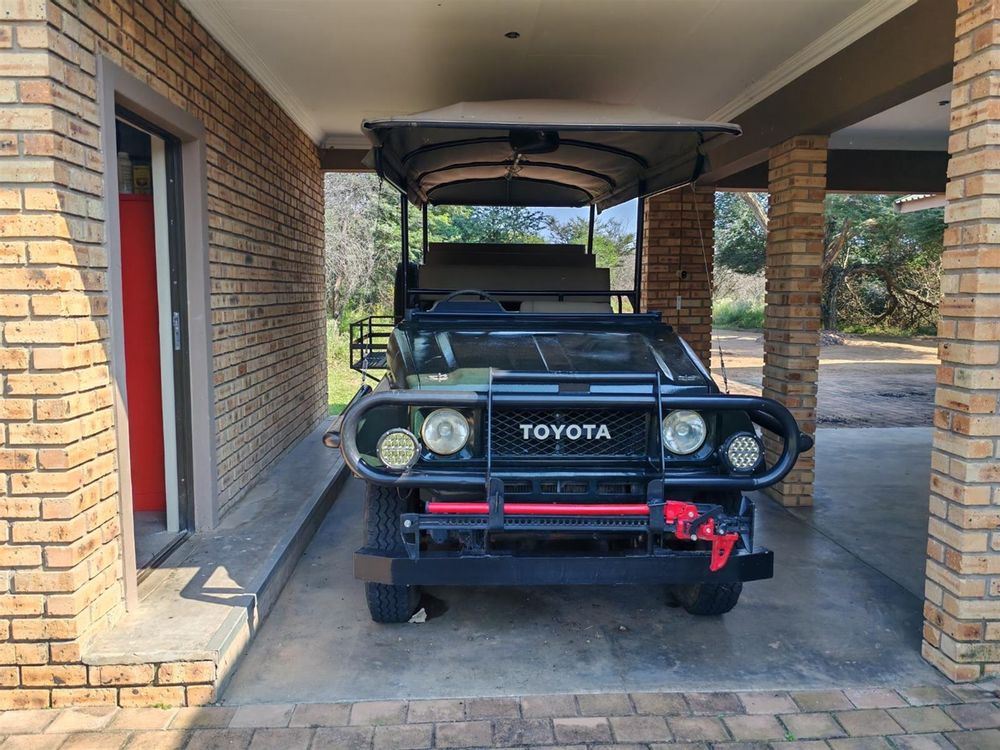 Practical Features and Self-Sufficiency A triple vehicle carport is conveniently located near the front door, complemented by an outside storeroom. The property is powered by a 16kVA generator, an 12kW inverter with 10kW batteries and solar panels, and two geysers (150L and 200L). The Chromodek roof and stone finishings enhance durability and aesthetic appeal. Included is a game viewer vehicle (Toyota Landcruiser 4x4, off-road only).