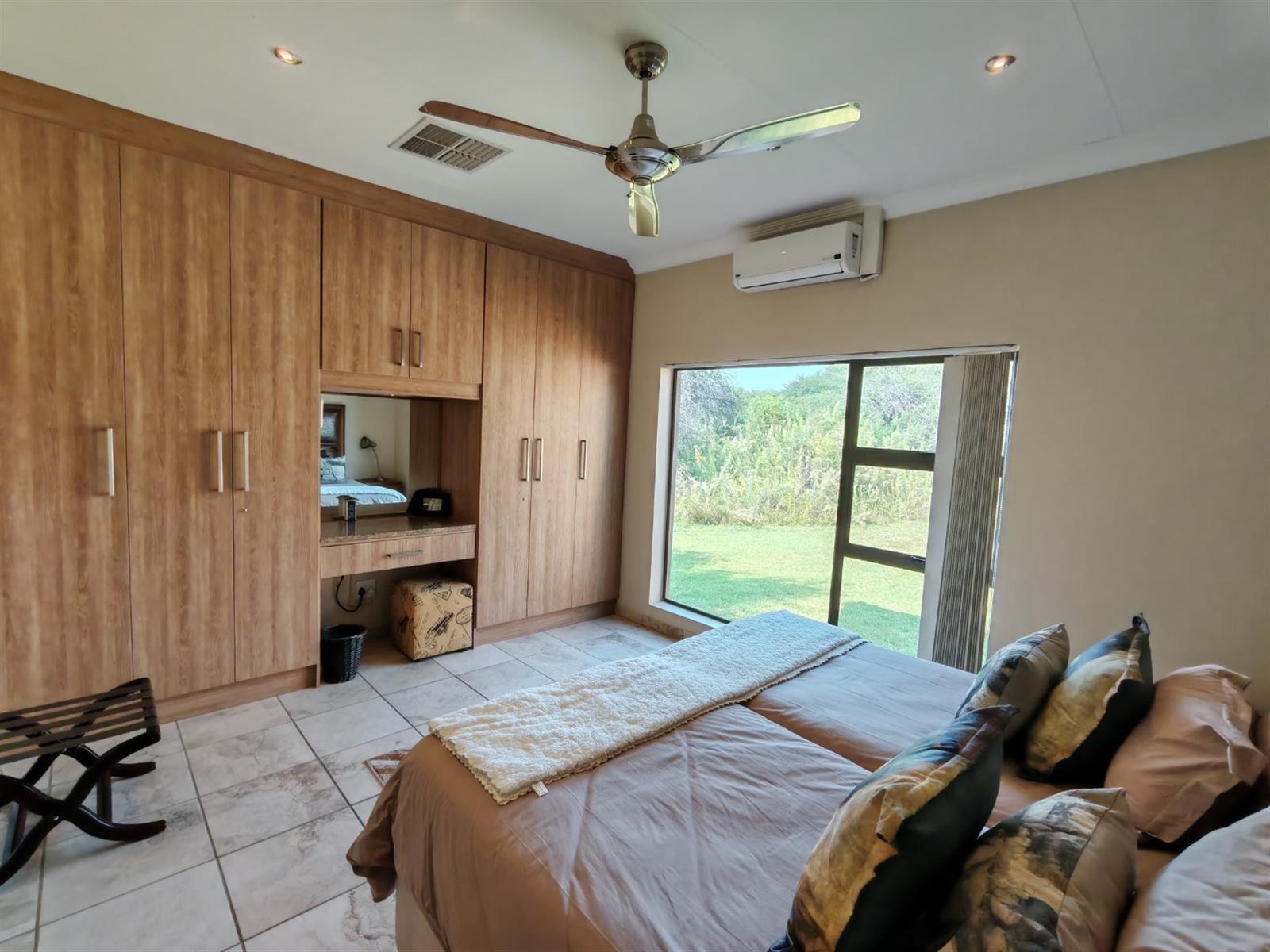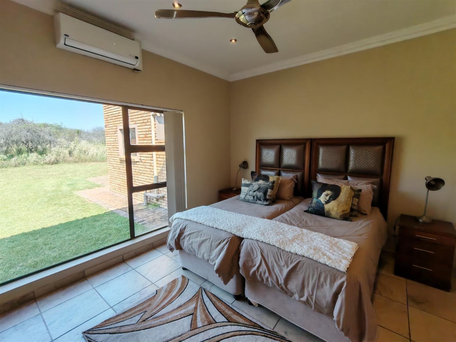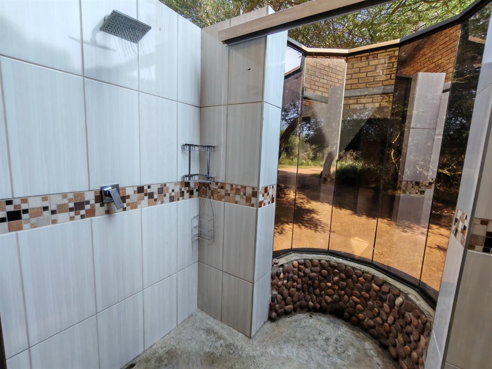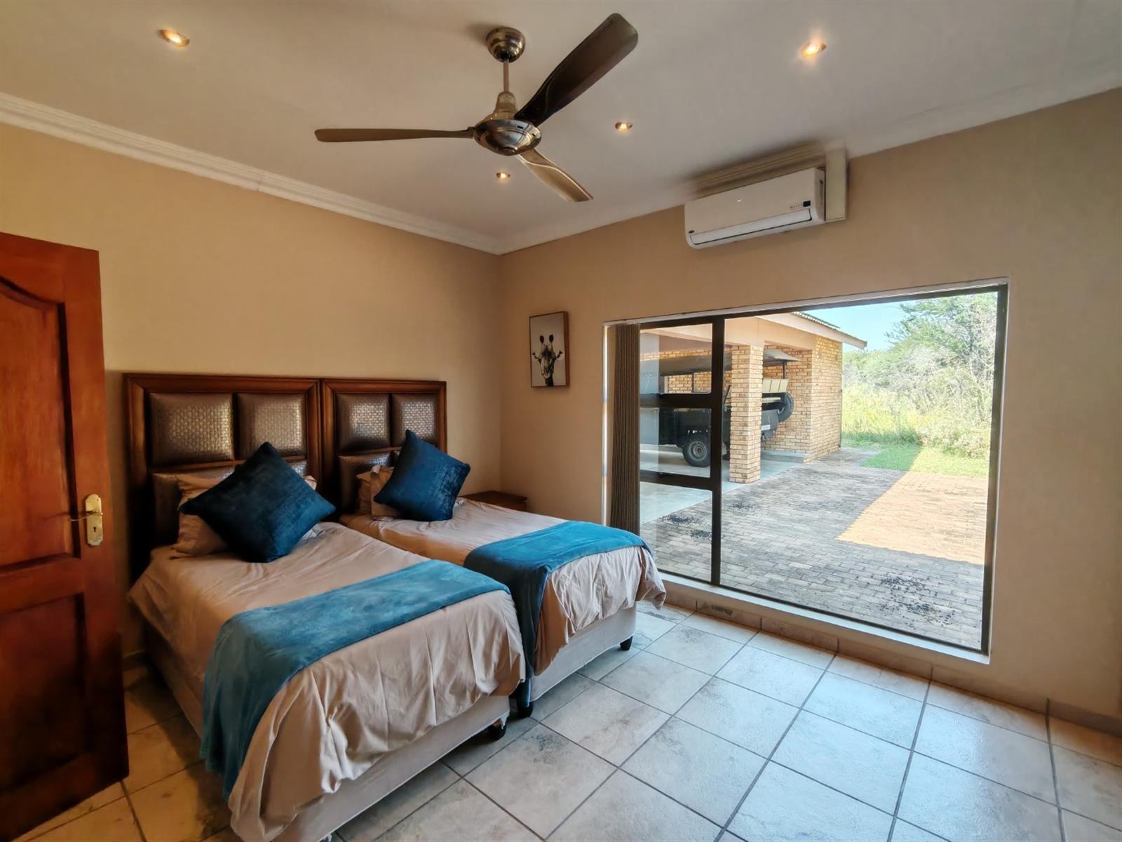 Elegant Bathrooms and Additional Conveniences Two fully equipped bathrooms provide baths, toilets, double vanity basins, and an outdoor shower for that refreshing bushveld touch. A dedicated linen room with shelving ensures effortless organization, while an air-conditioned guest outside room offers two three-quarter beds and an en-suite bathroom (vanity, toilet, shower).