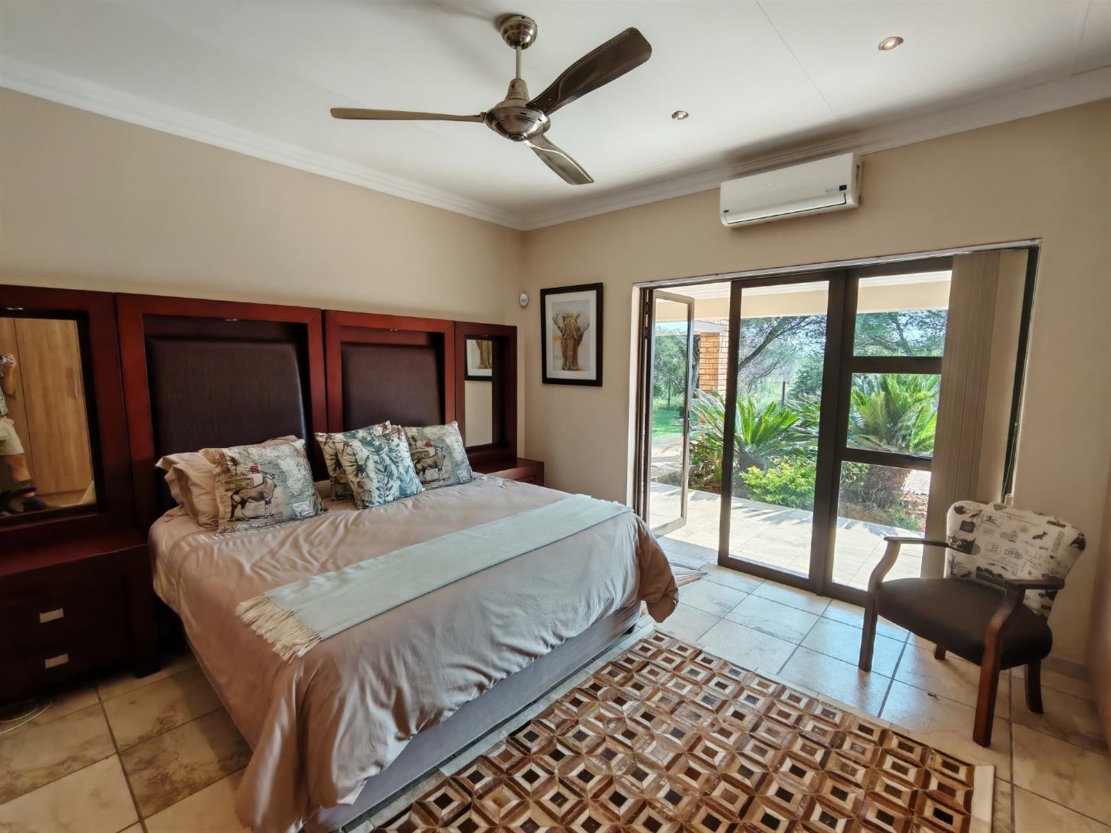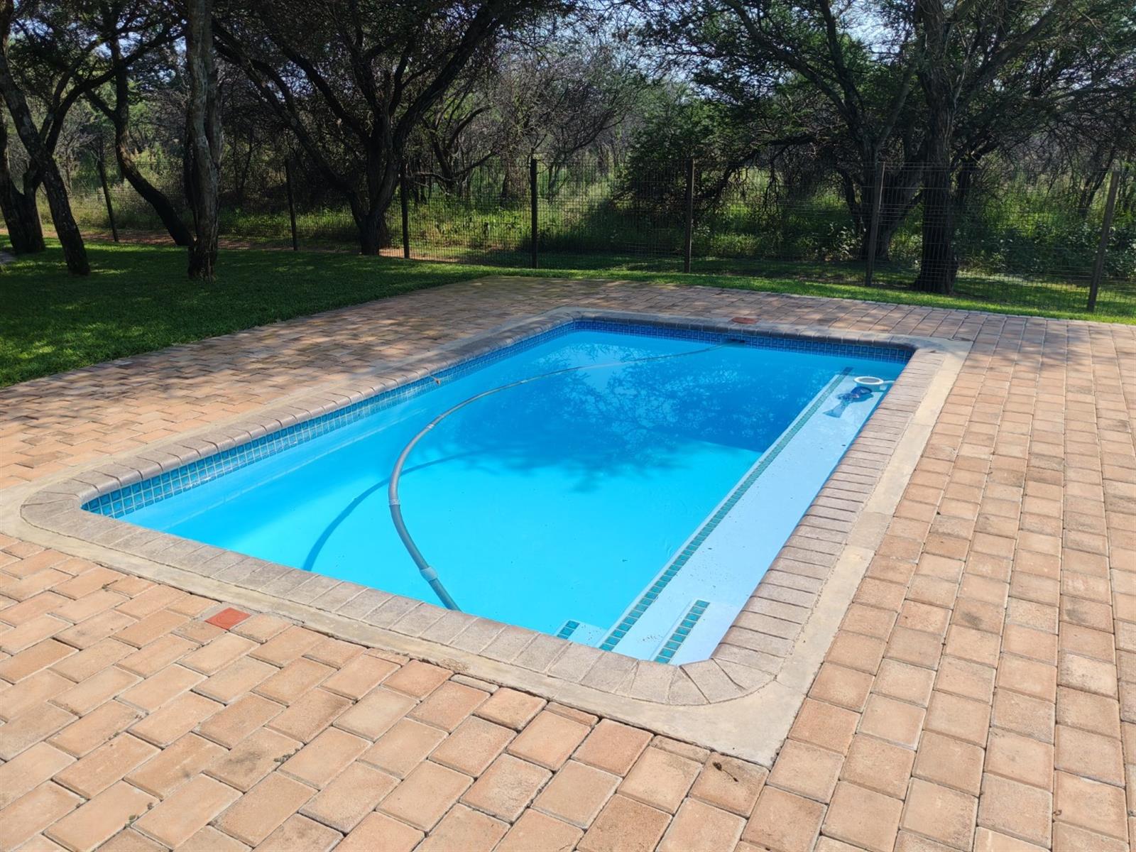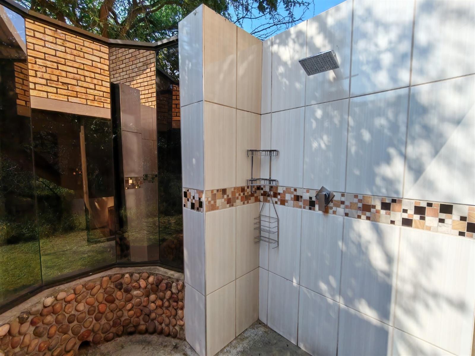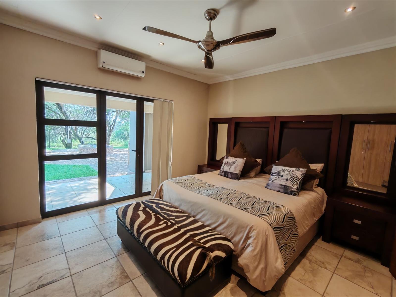 Elegant Bathrooms and Additional Conveniences Two fully equipped bathrooms provide baths, toilets, double vanity basins, and an outdoor shower for that refreshing bushveld touch. A dedicated linen room with shelving ensures effortless organization, while an air-conditioned guest outside room offers two three-quarter beds and an en-suite bathroom (vanity, toilet, shower).