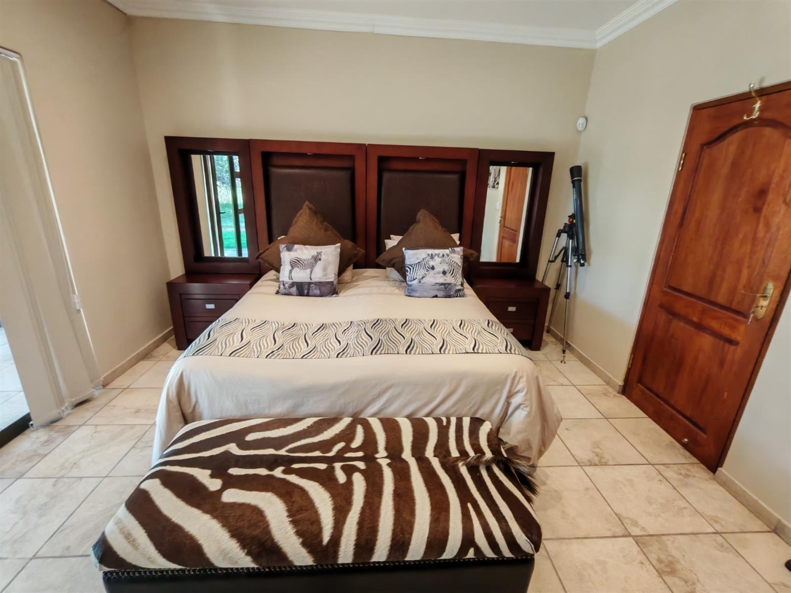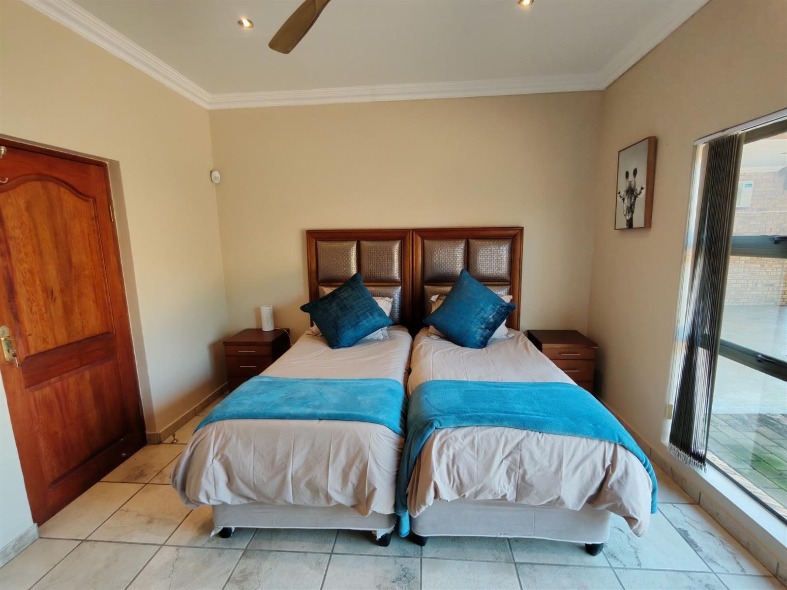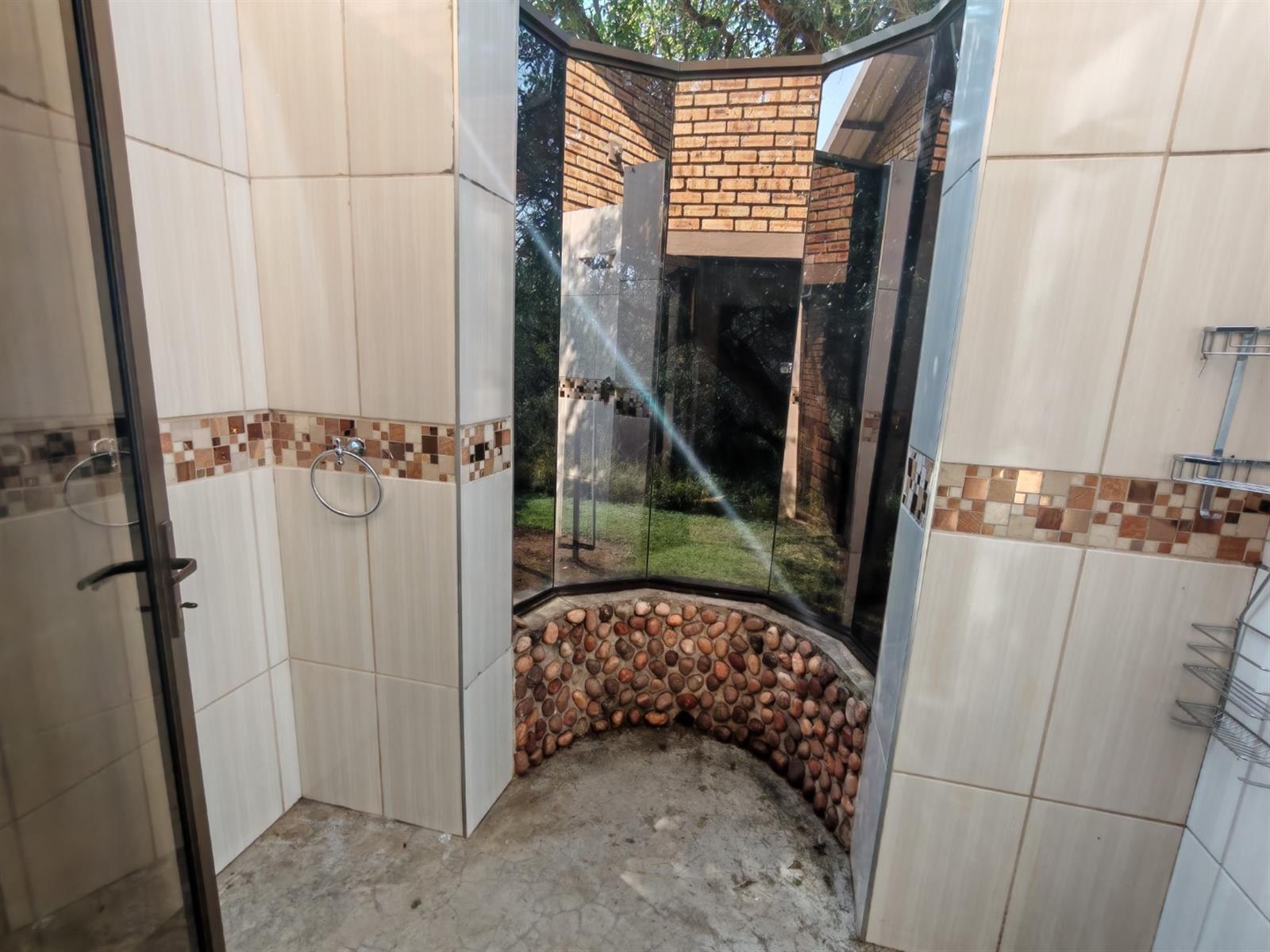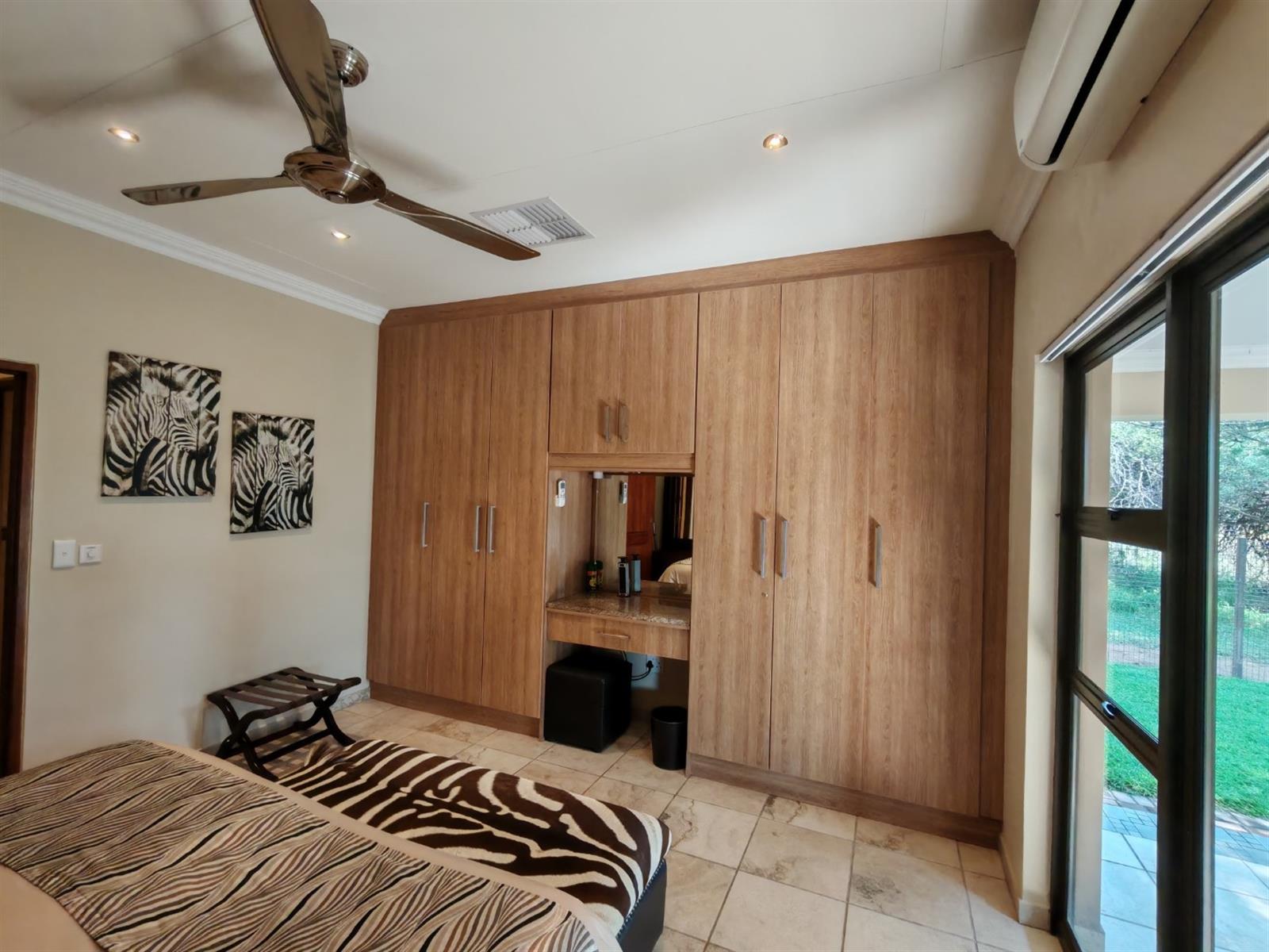 Elegant Bathrooms and Additional Conveniences Two fully equipped bathrooms provide baths, toilets, double vanity basins, and an outdoor shower for that refreshing bushveld touch. A dedicated linen room with shelving ensures effortless organization, while an air-conditioned guest outside room offers two three-quarter beds and an en-suite bathroom (vanity, toilet, shower).