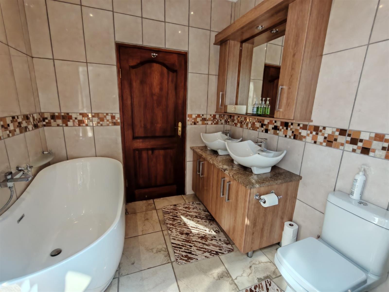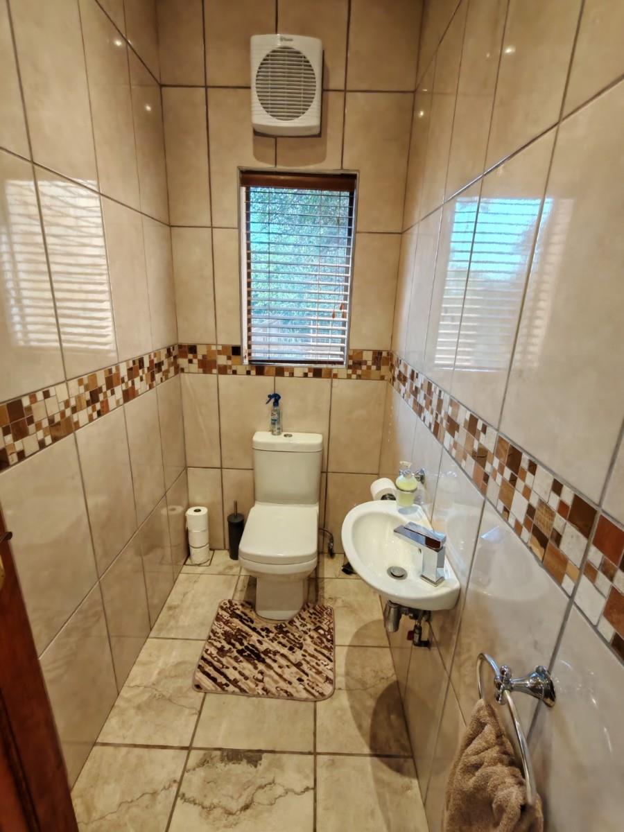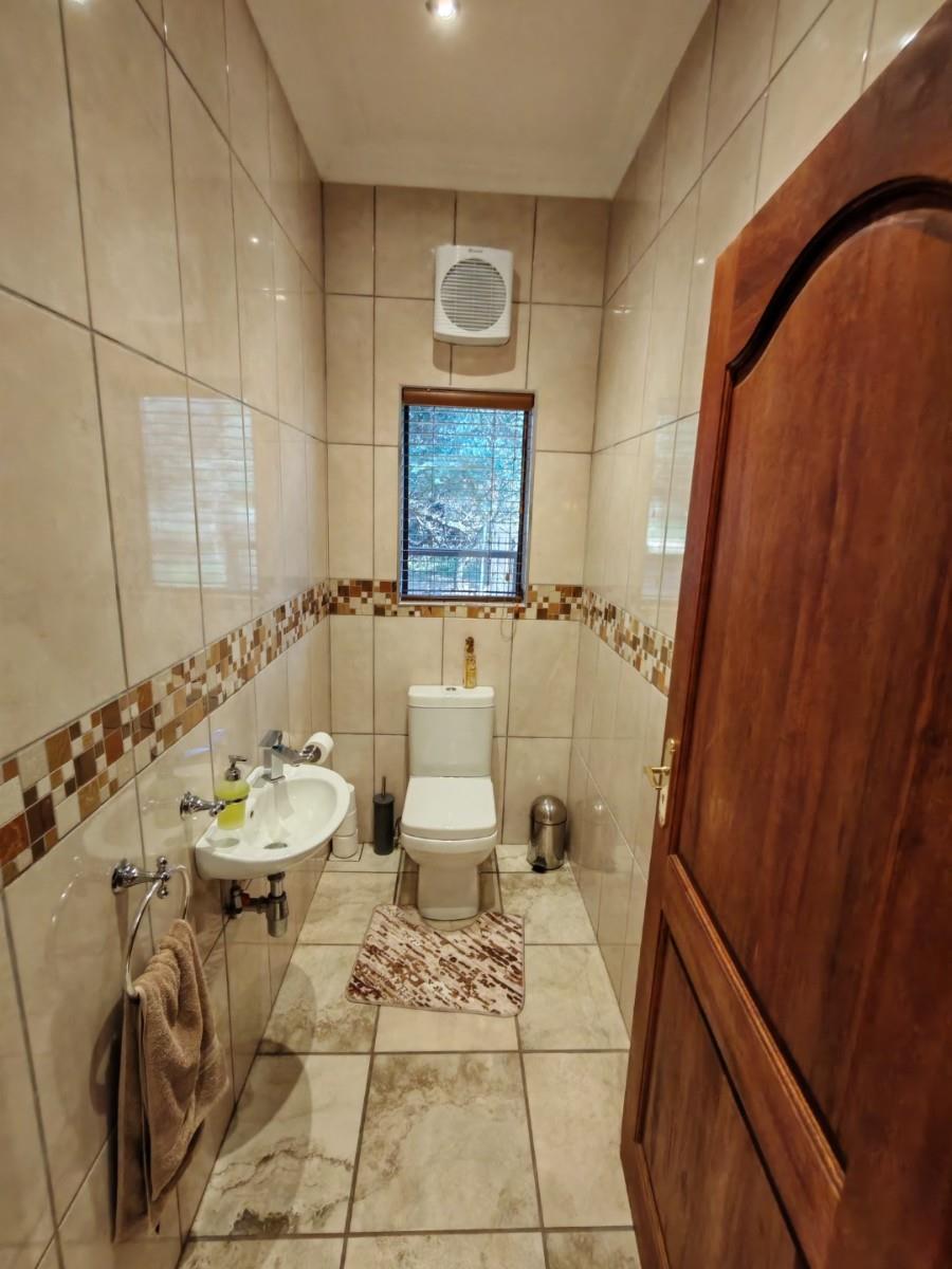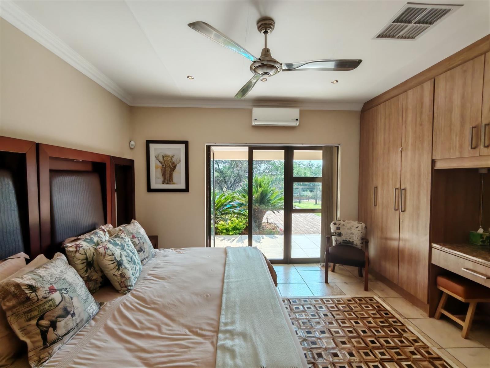 Elegant Bathrooms and Additional Conveniences Two fully equipped bathrooms provide baths, toilets, double vanity basins, and an outdoor shower for that refreshing bushveld touch. A dedicated linen room with shelving ensures effortless organization, while an air-conditioned guest outside room offers two three-quarter beds and an en-suite bathroom (vanity, toilet, shower).