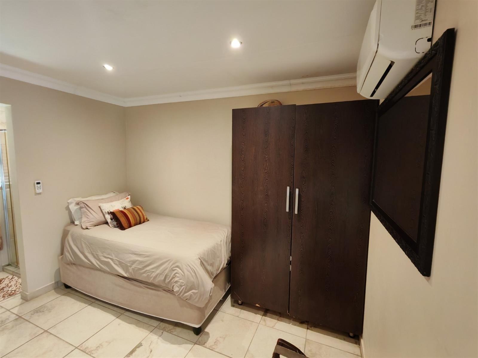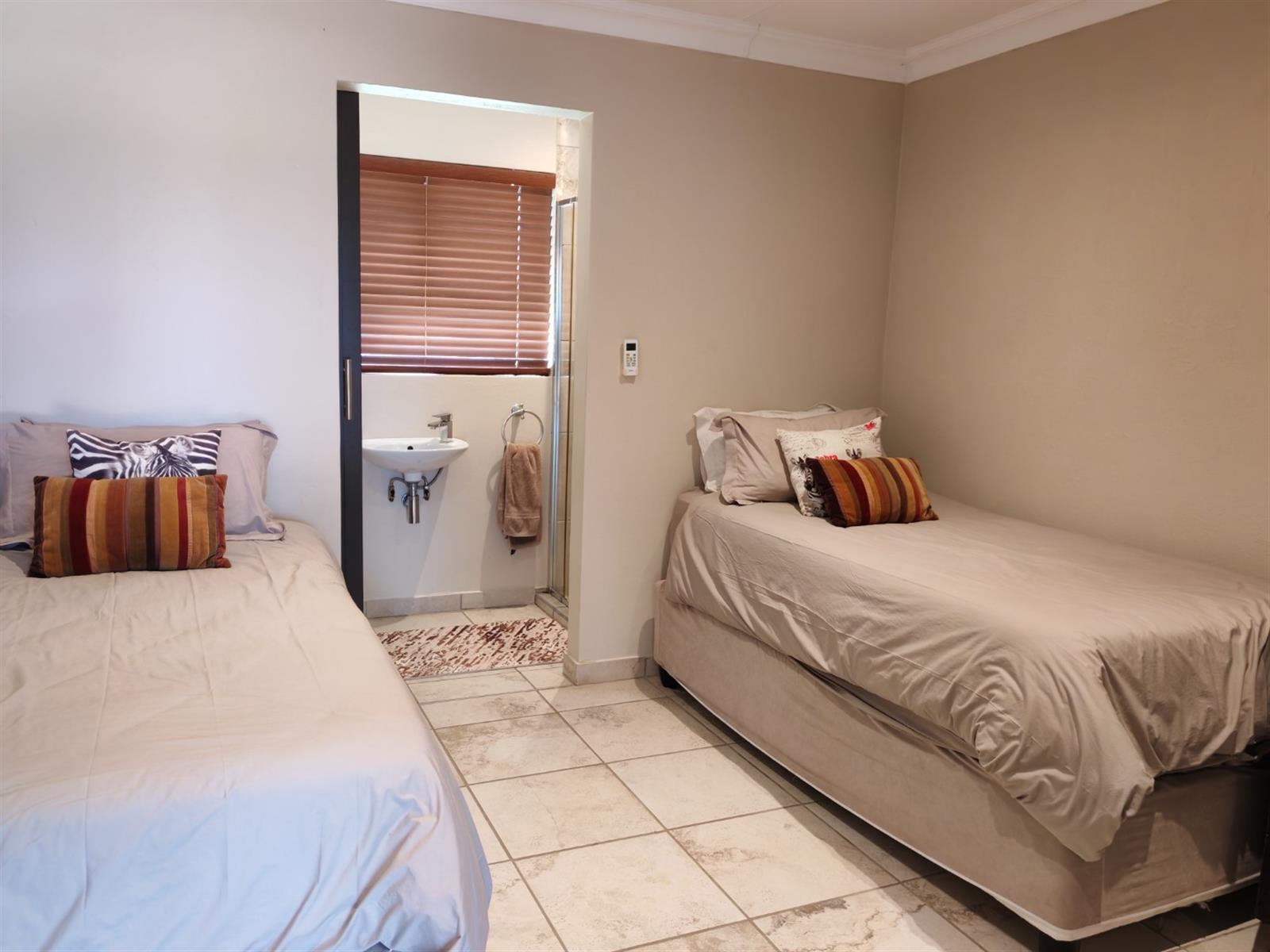 Spacious and Luxurious Bedrooms The home features four beautifully appointed bedrooms, all fully furnished with two king-size beds and four three-quarter beds. Each room includes bedside tables, loose mats, vertical blinds, a vanity chair, air conditioning/central cooling, and ample built-in cupboards. Two bedrooms boast sliding doors opening directly onto the stoep and garden, inviting the tranquility of nature indoors.