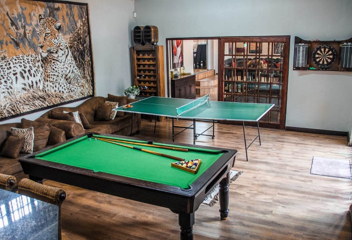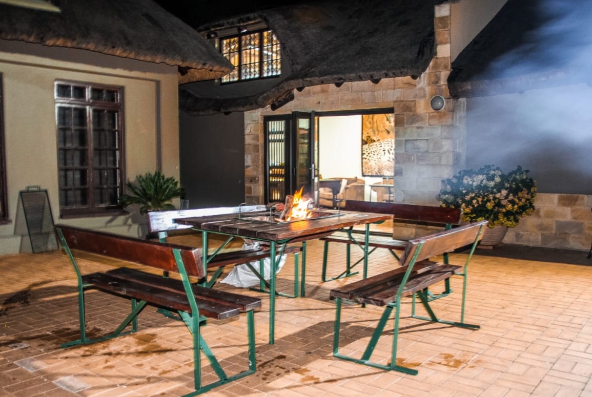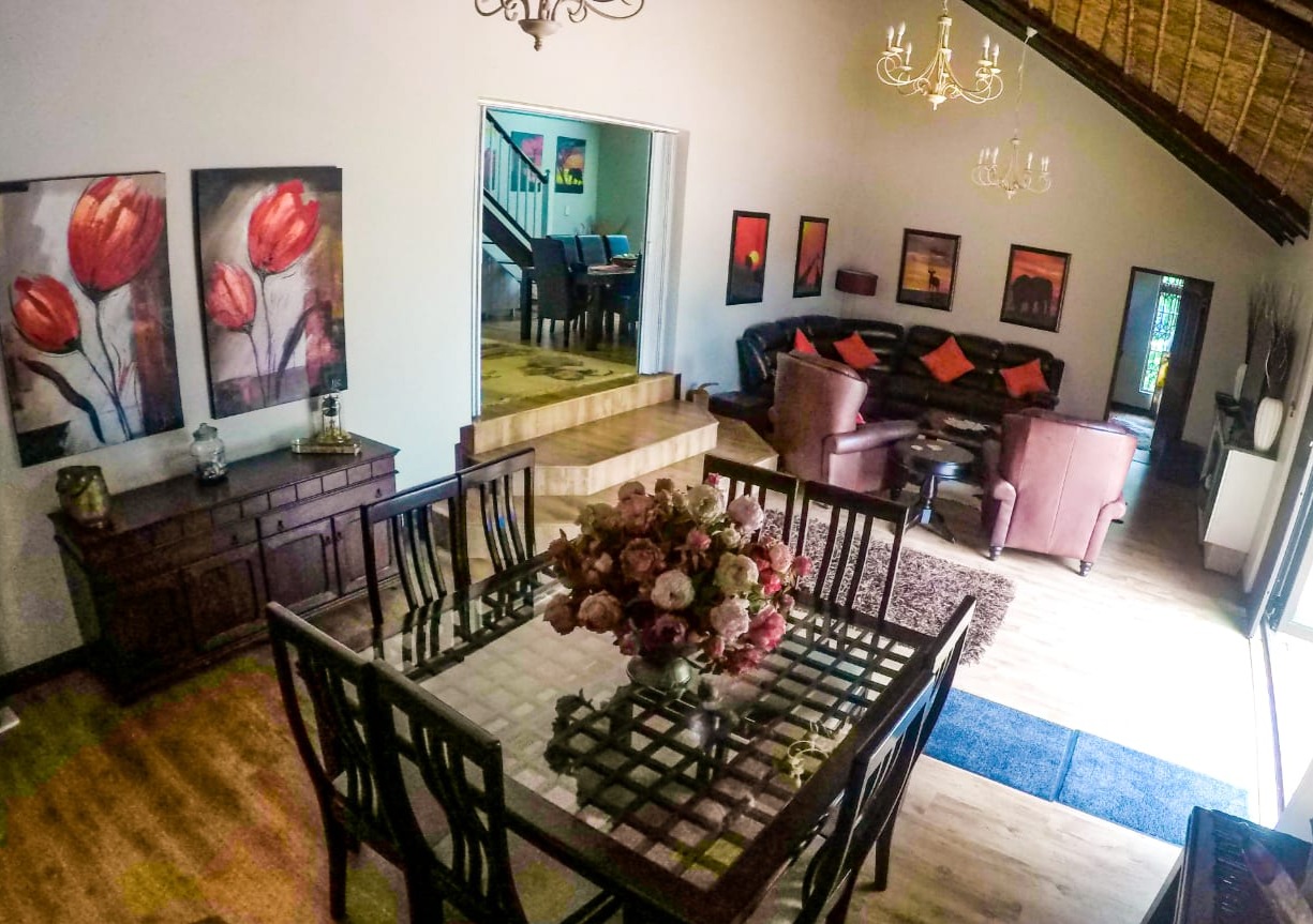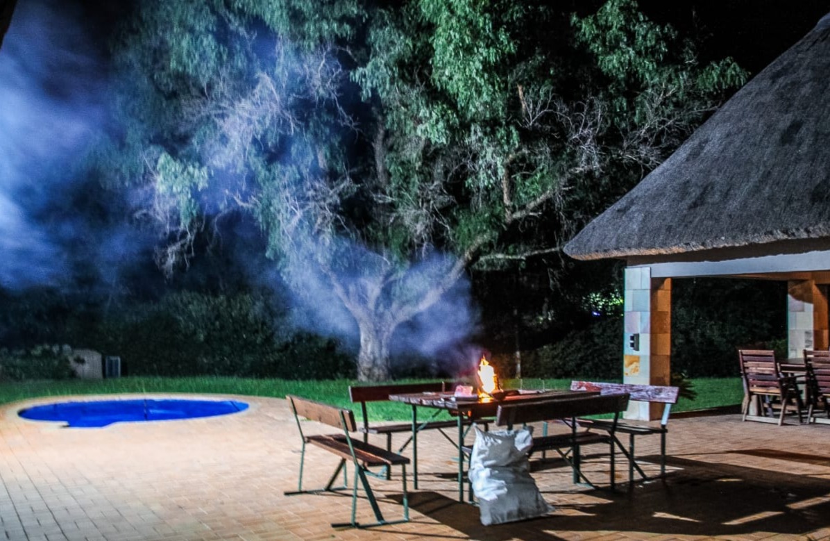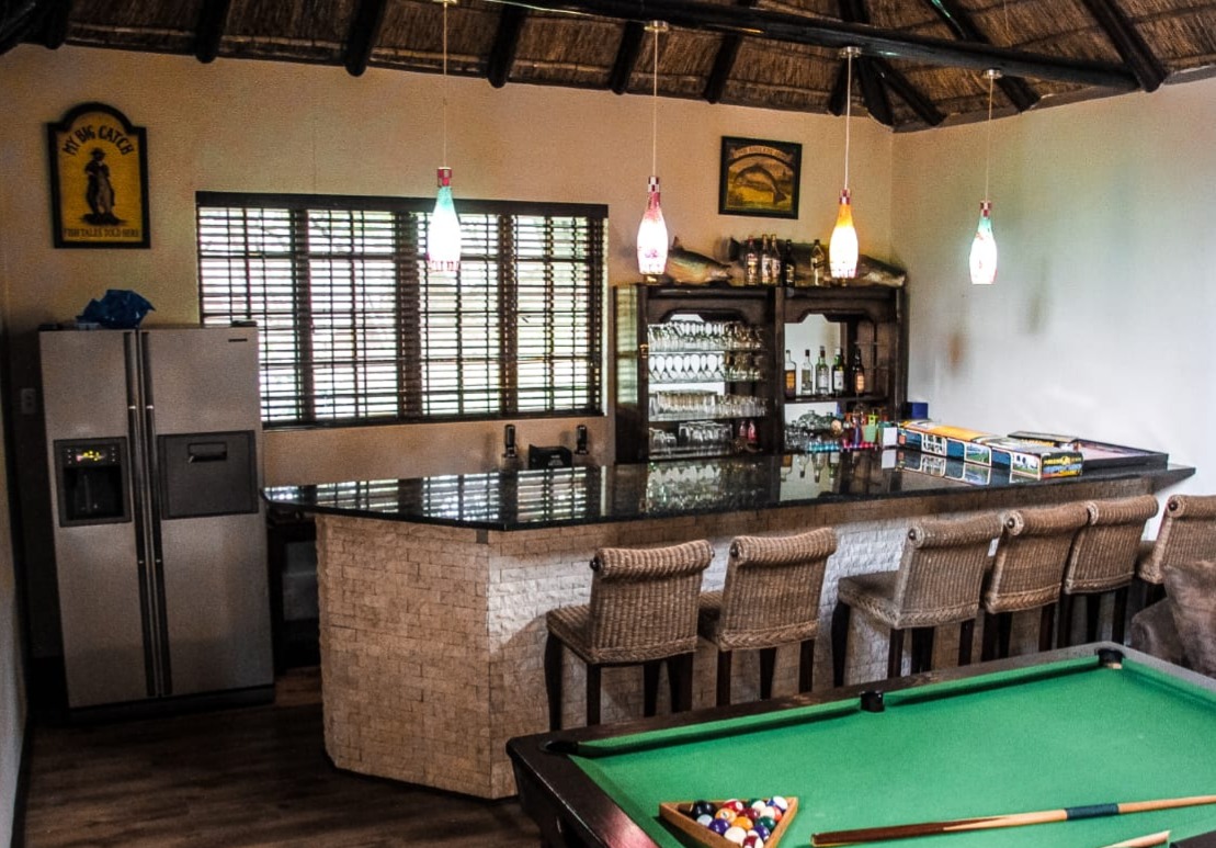 Outdoor entertaining area, lounge, with kitchen, dining area, jacuzzi, braai area, swimmingpool and at the riverside a lapa with own kitchen and a boma with 60m riverfront.