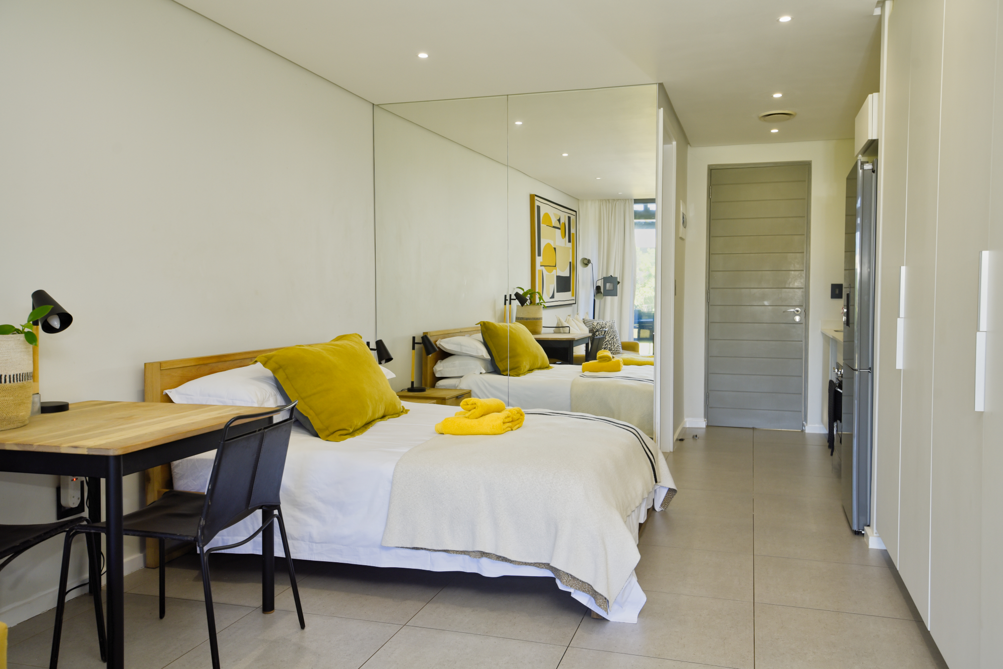 The open-plan layout seamlessly combines the kitchen, living, and sleeping area, flowing out to a private patio ideal for relaxing or entertaining. The contemporary kitchen is fitted with quality finishes, while the bathroom is sleek and well-appointed.