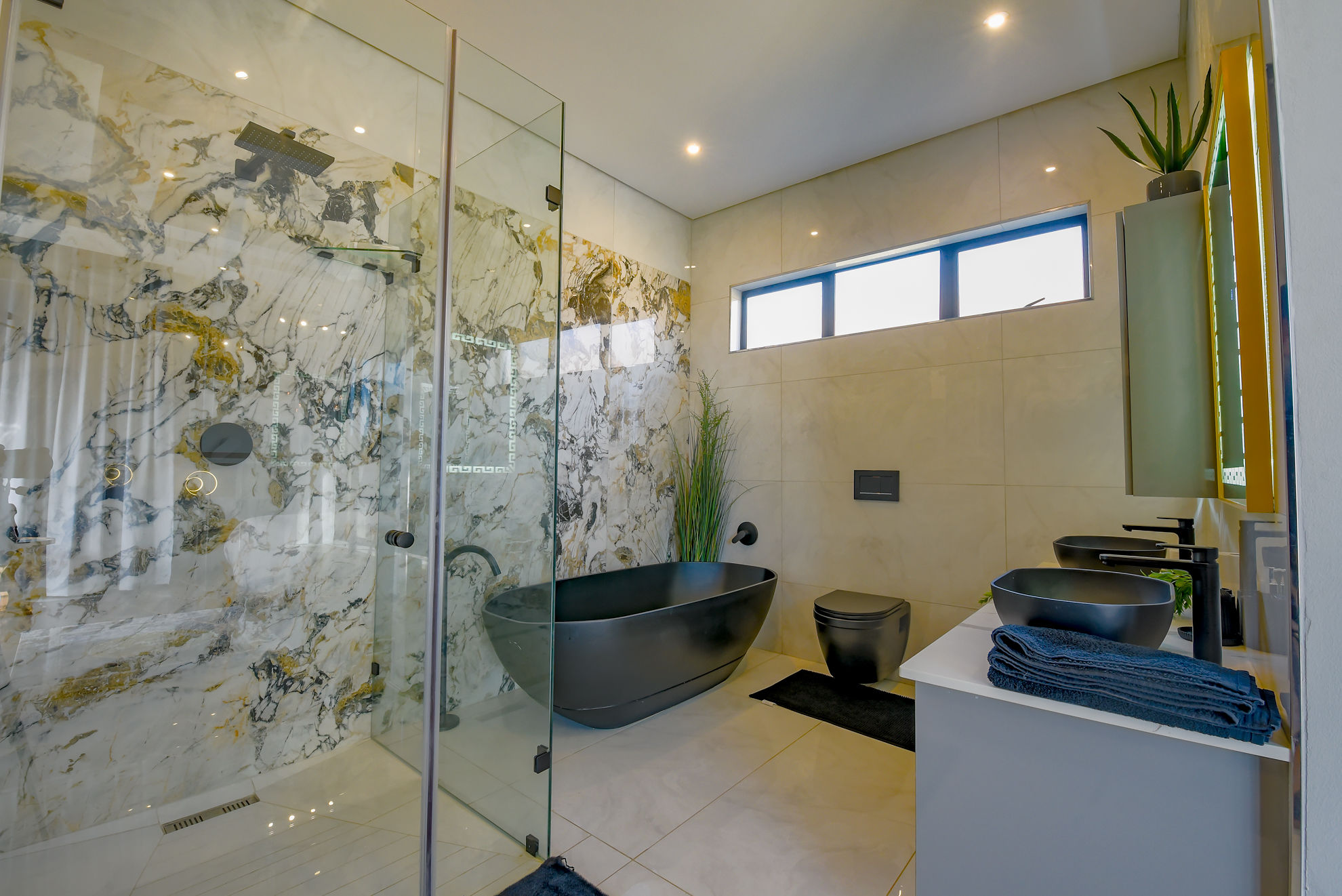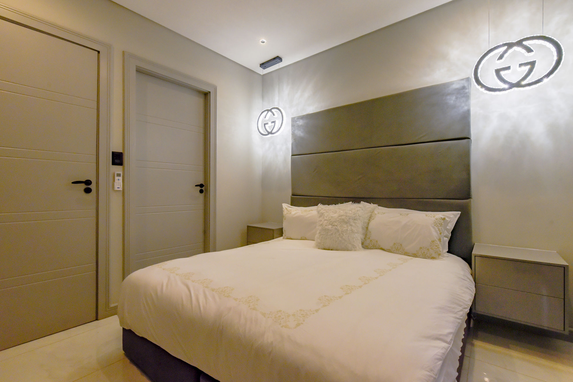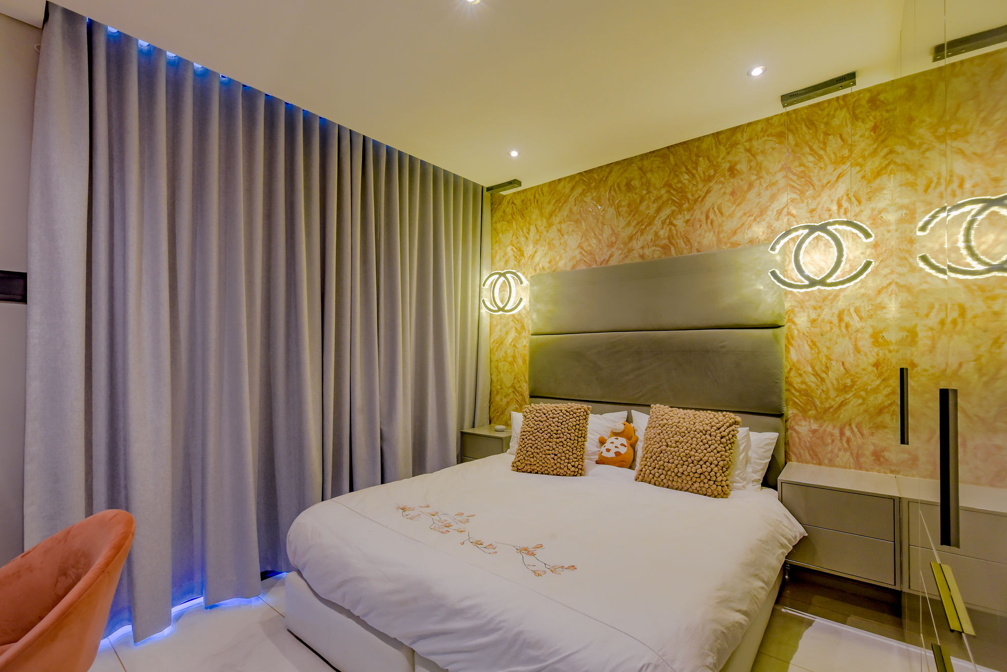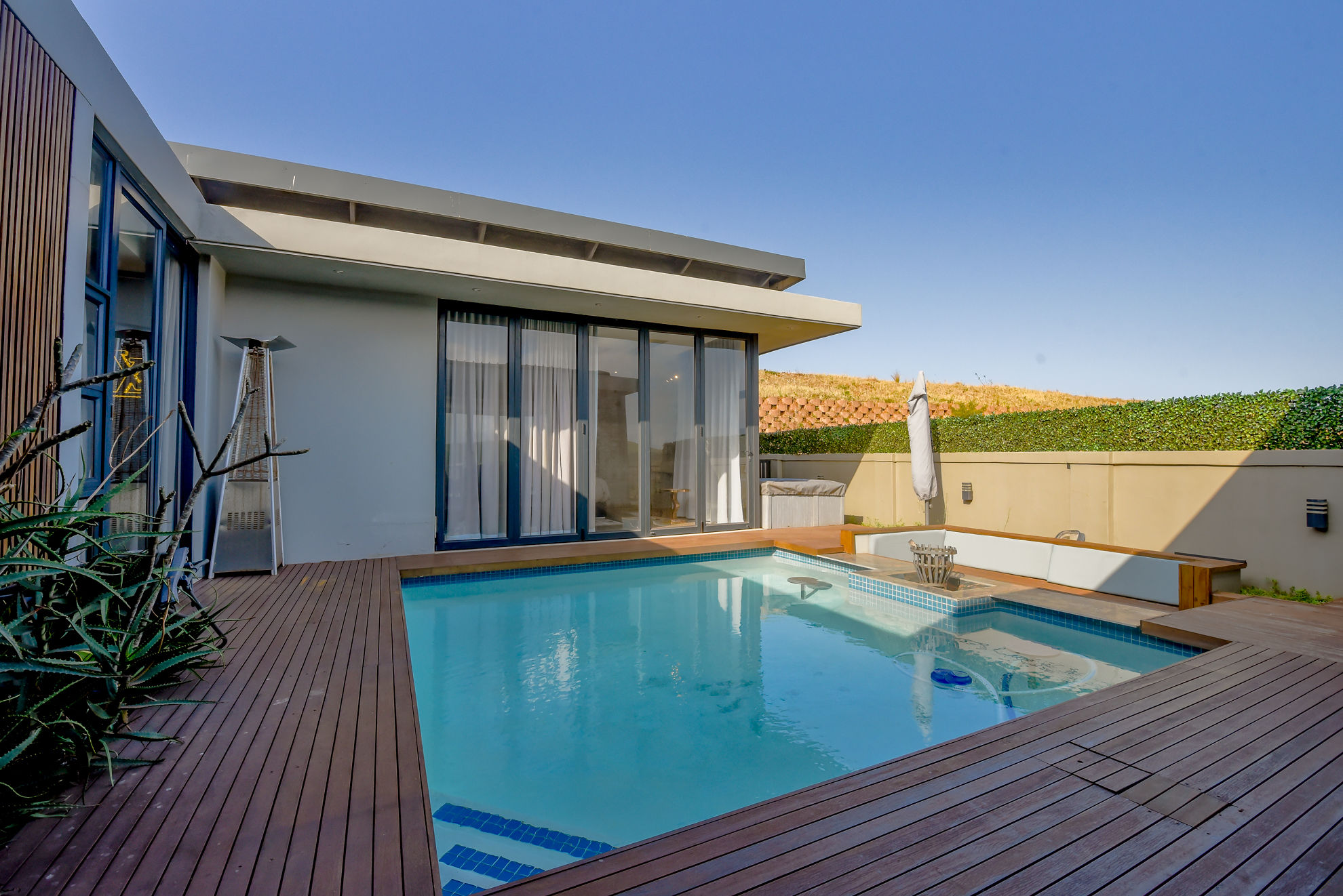 Four luxurious en-suite bedrooms, including a master suite with a walk-in dressing room, full bathroom, and private garden or pool access.