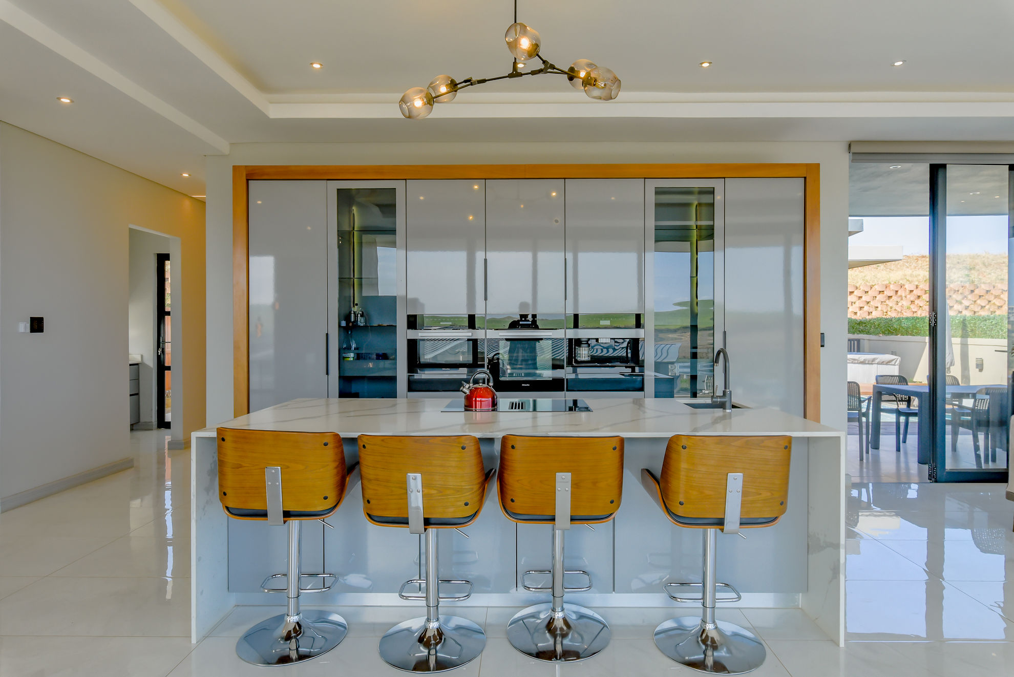 Designer kitchen with high-end appliances, large central island, separate scullery