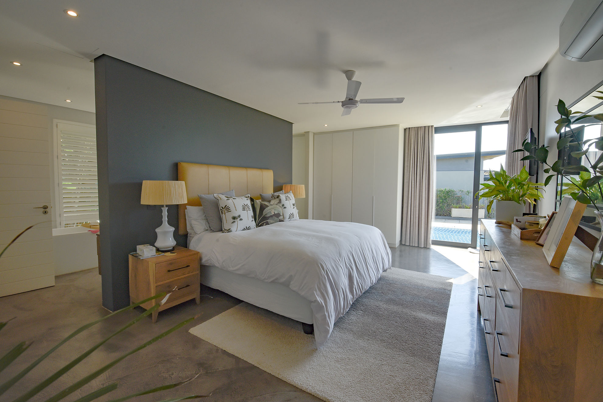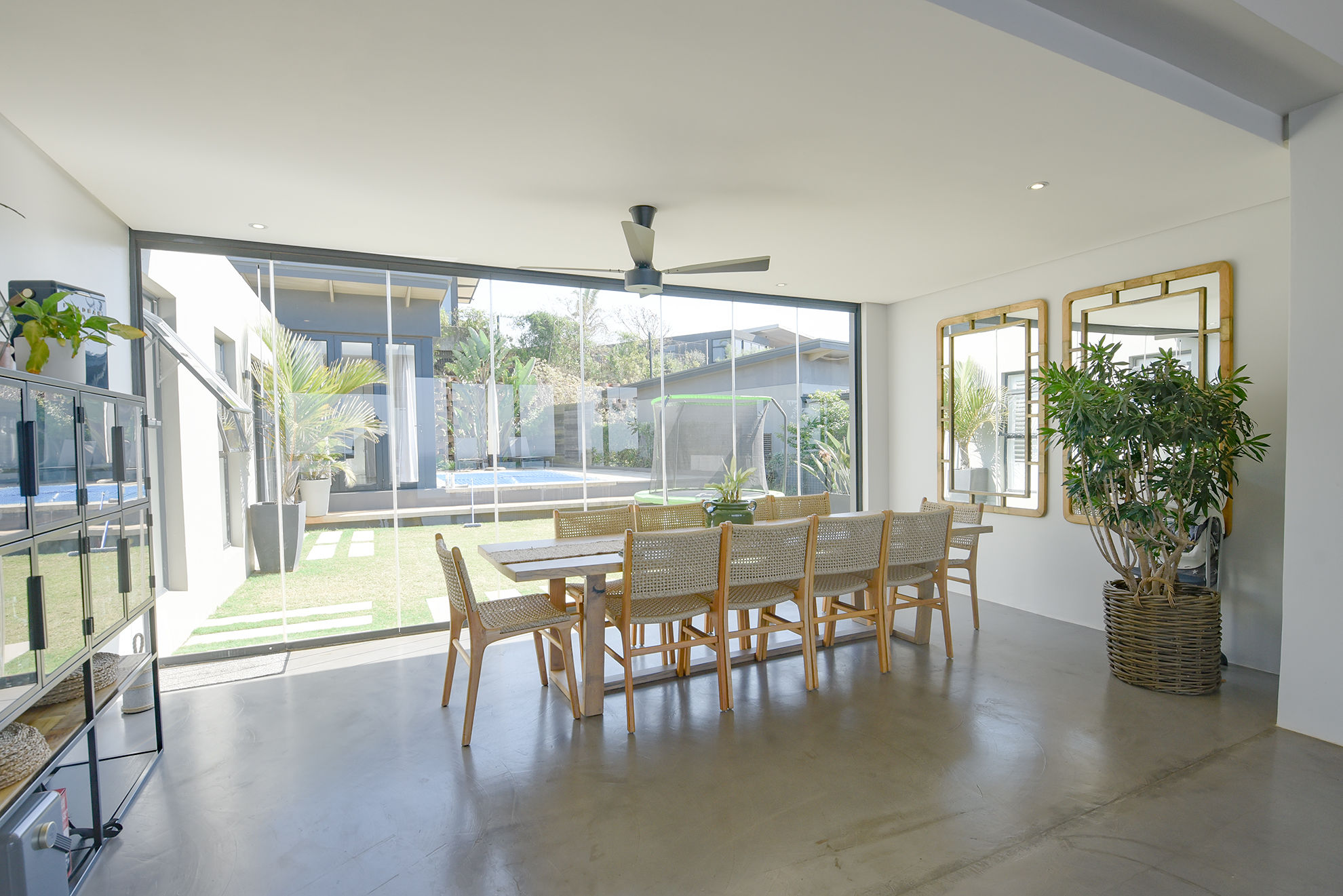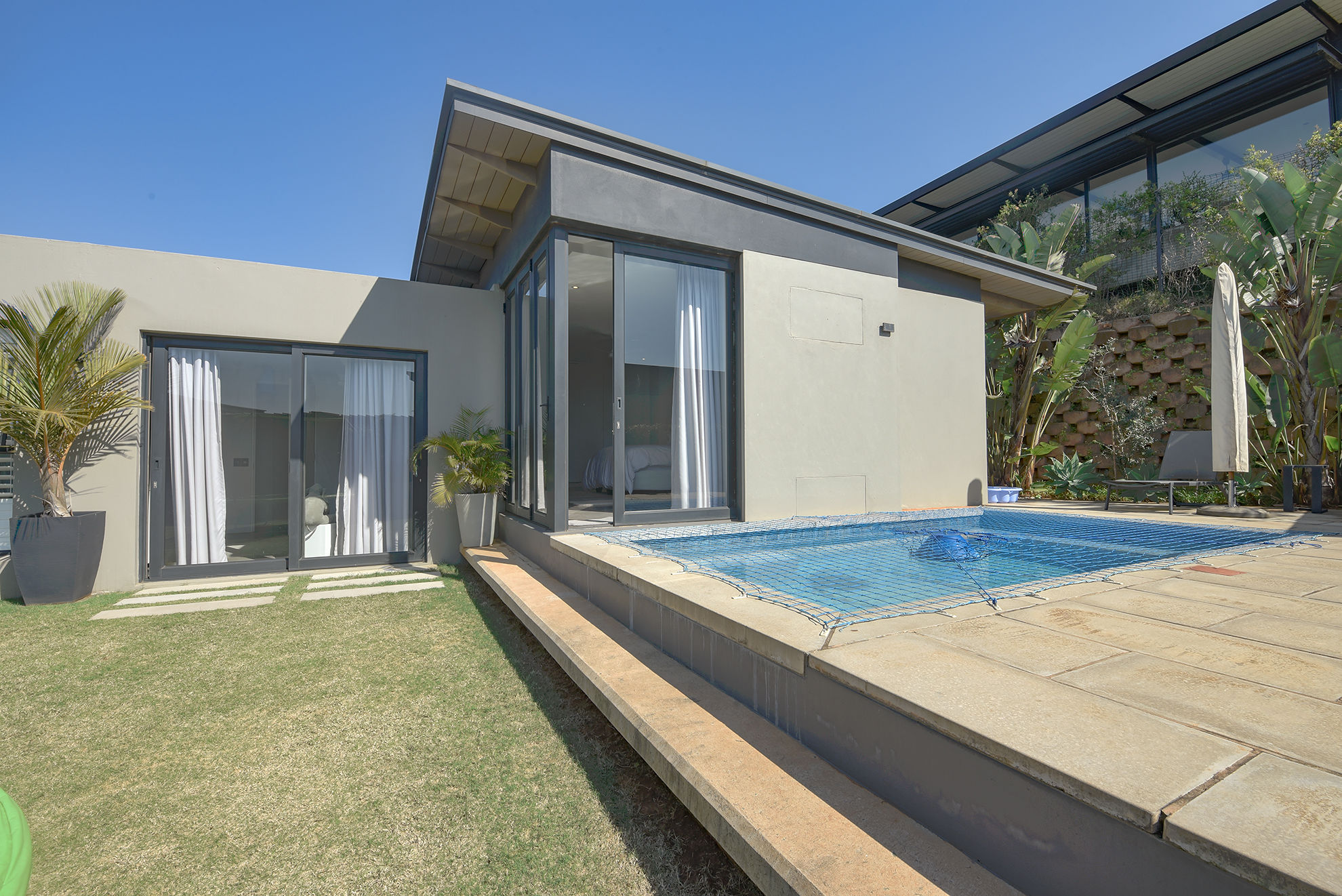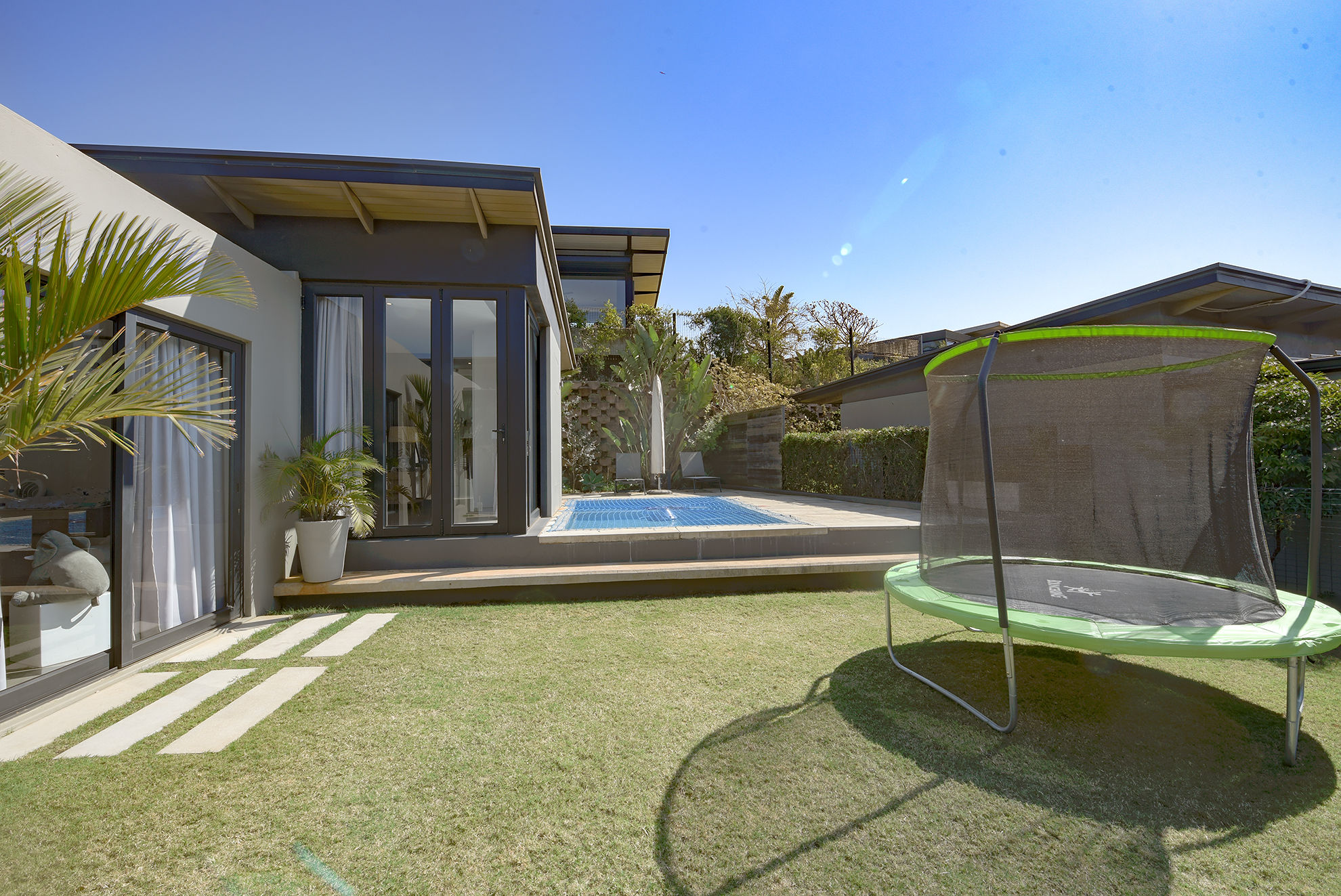Central swimming pool, deck, and garden nestled between entertainment zones and bedrooms, sheltered from wind