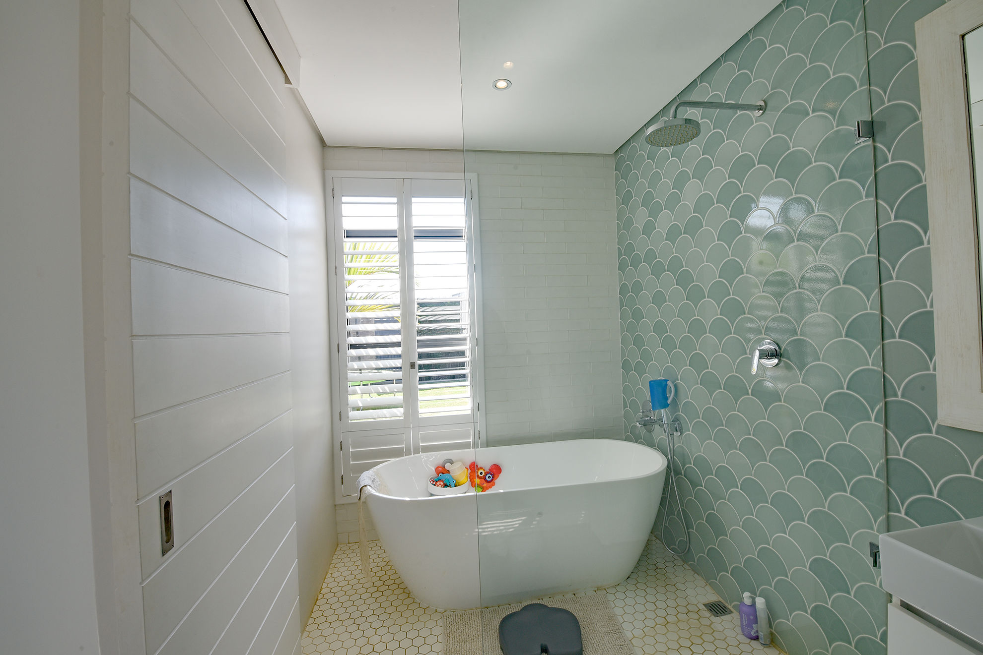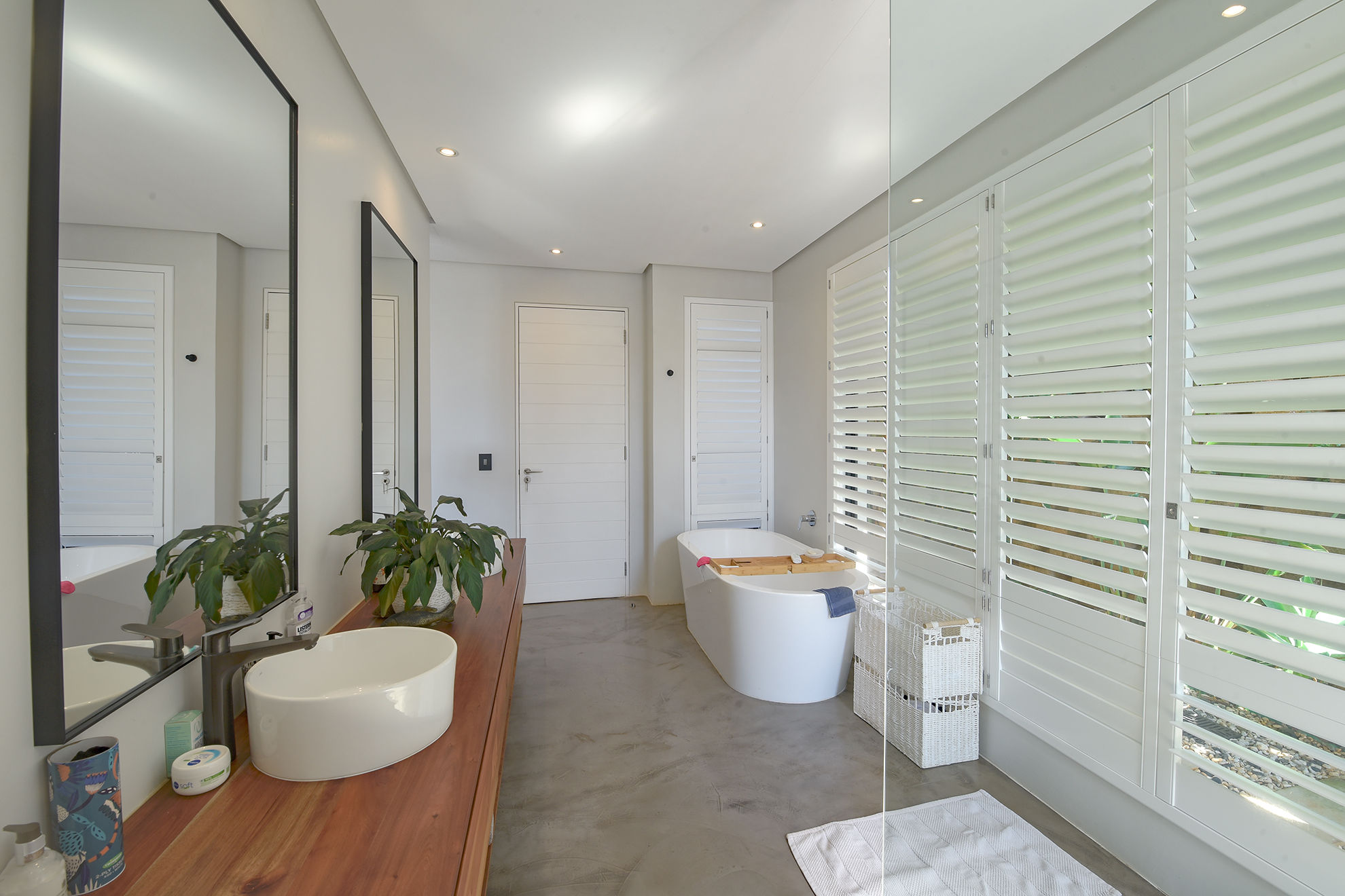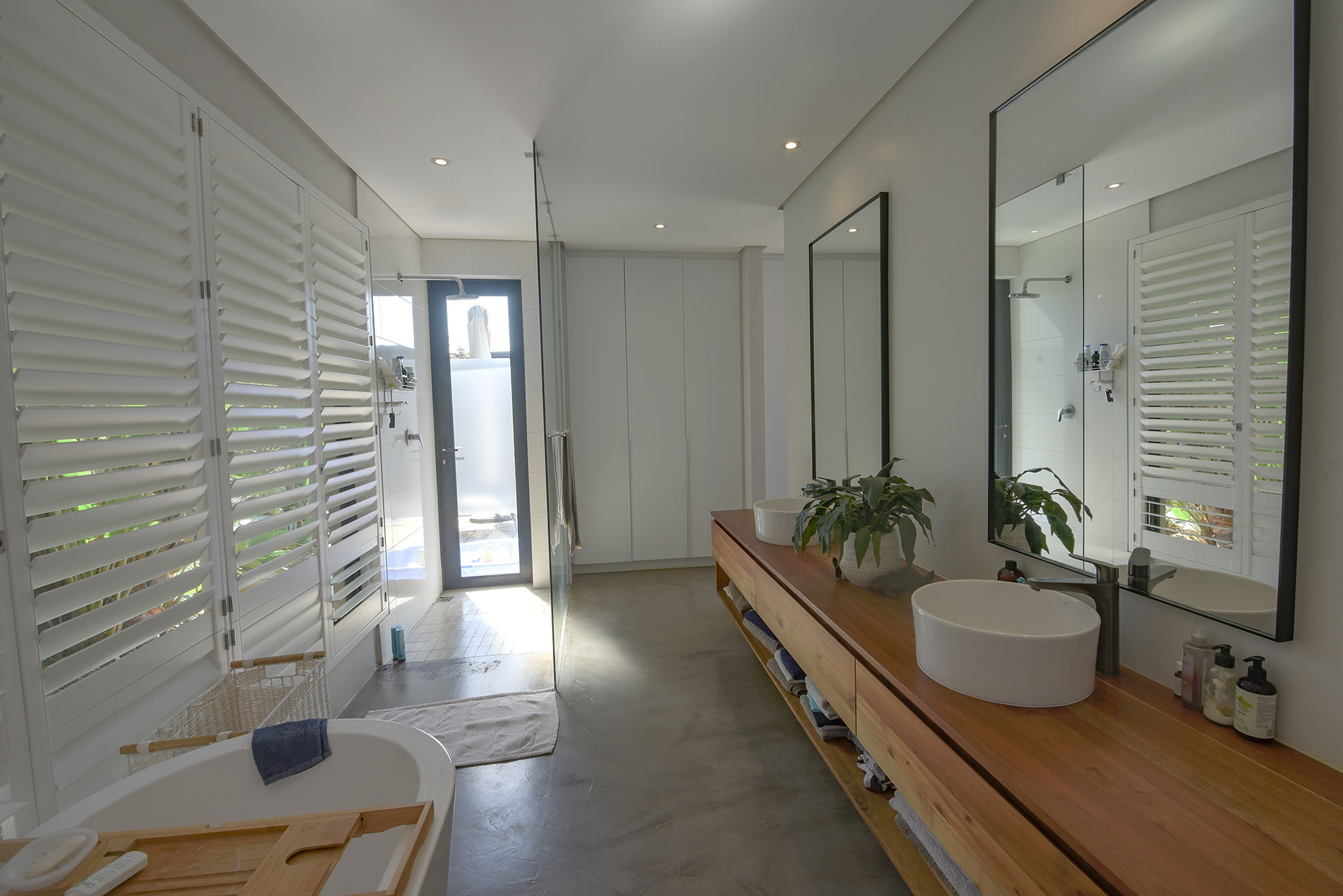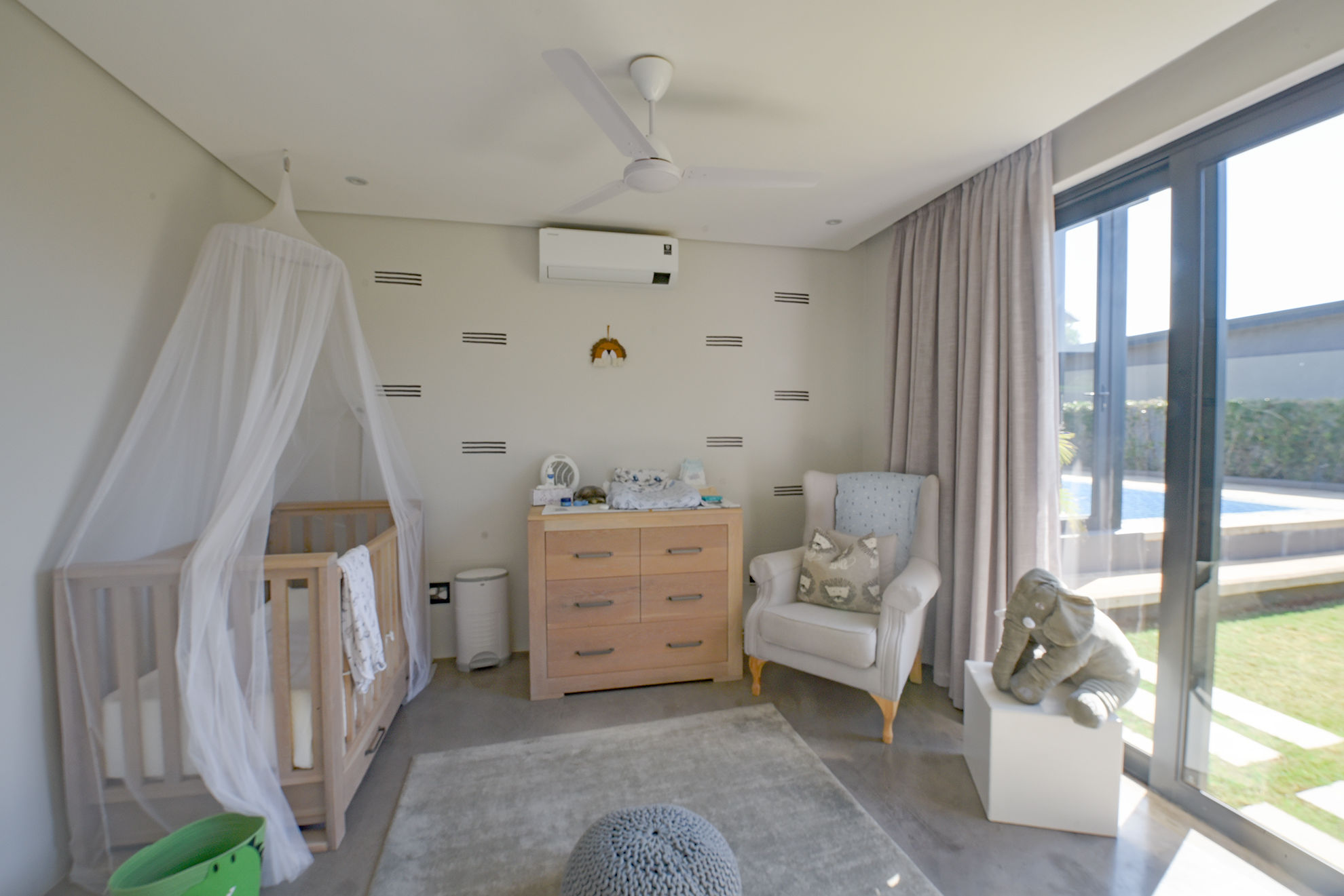 Central swimming pool, deck, and garden nestled between entertainment zones and bedrooms, sheltered from wind